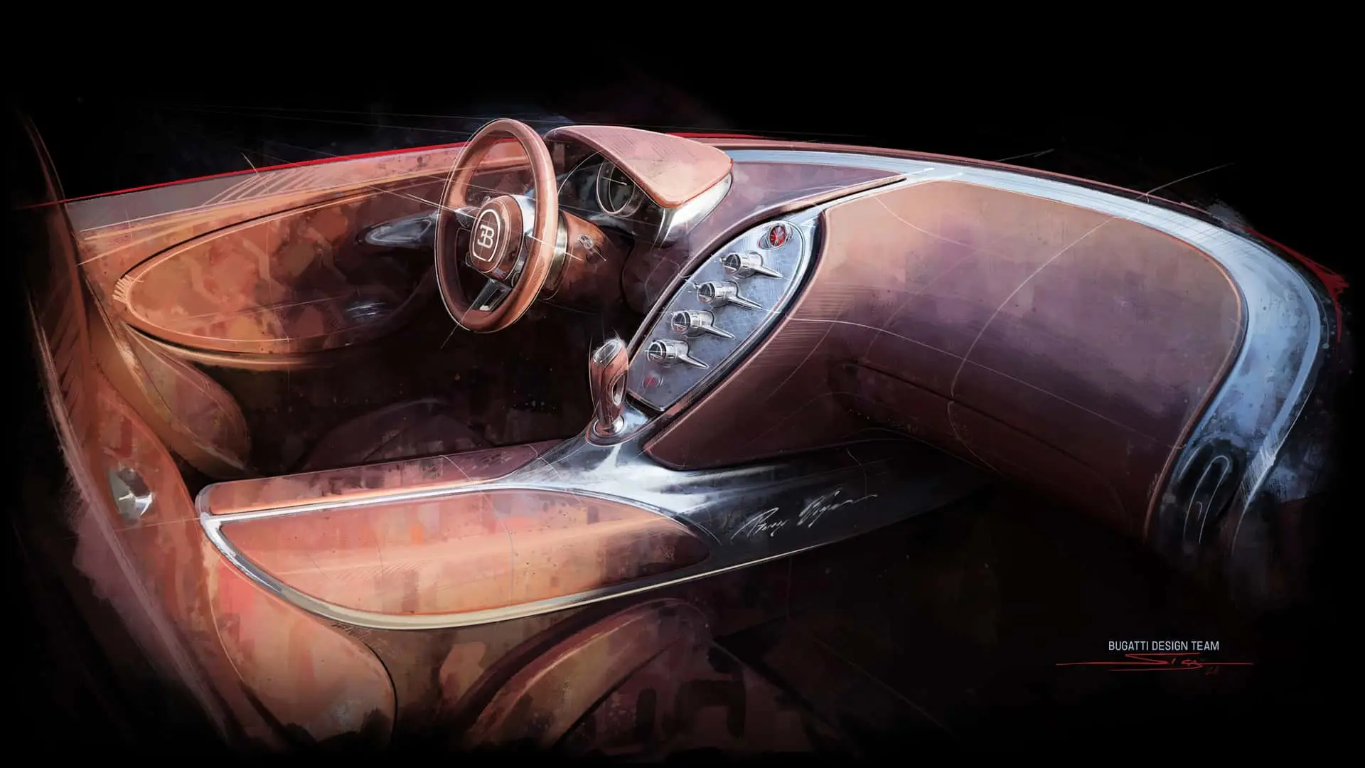 في الداخل، يُقدّم مفهوم “Car Couture” الأقمشة المنتجة في باريس، ويجمع بين مواد نبيلة مثل الألمنيوم الصلب في الكونسول و أنفاق النقل مع عجلة قيادة كلاسيكية دائرية تذكر بـVeyron. إدماج الساعات كهنا عنصر مركزي — ساعة Audemars Piguet Royal Oak Tourbillon بحجم 41 مم — ليس مجرد قطعة فاخرة، بل رمز لقدرة Bugatti على التواصل مع دور الساعات الراقية لتقديم أرقى مستويات الحصرية. الساعة مُثبتة في إطار بزوايا ثمانية، بتشطيب engine-turn وتعمل بطاقة أوتوماتيكية من حركة السيارة.