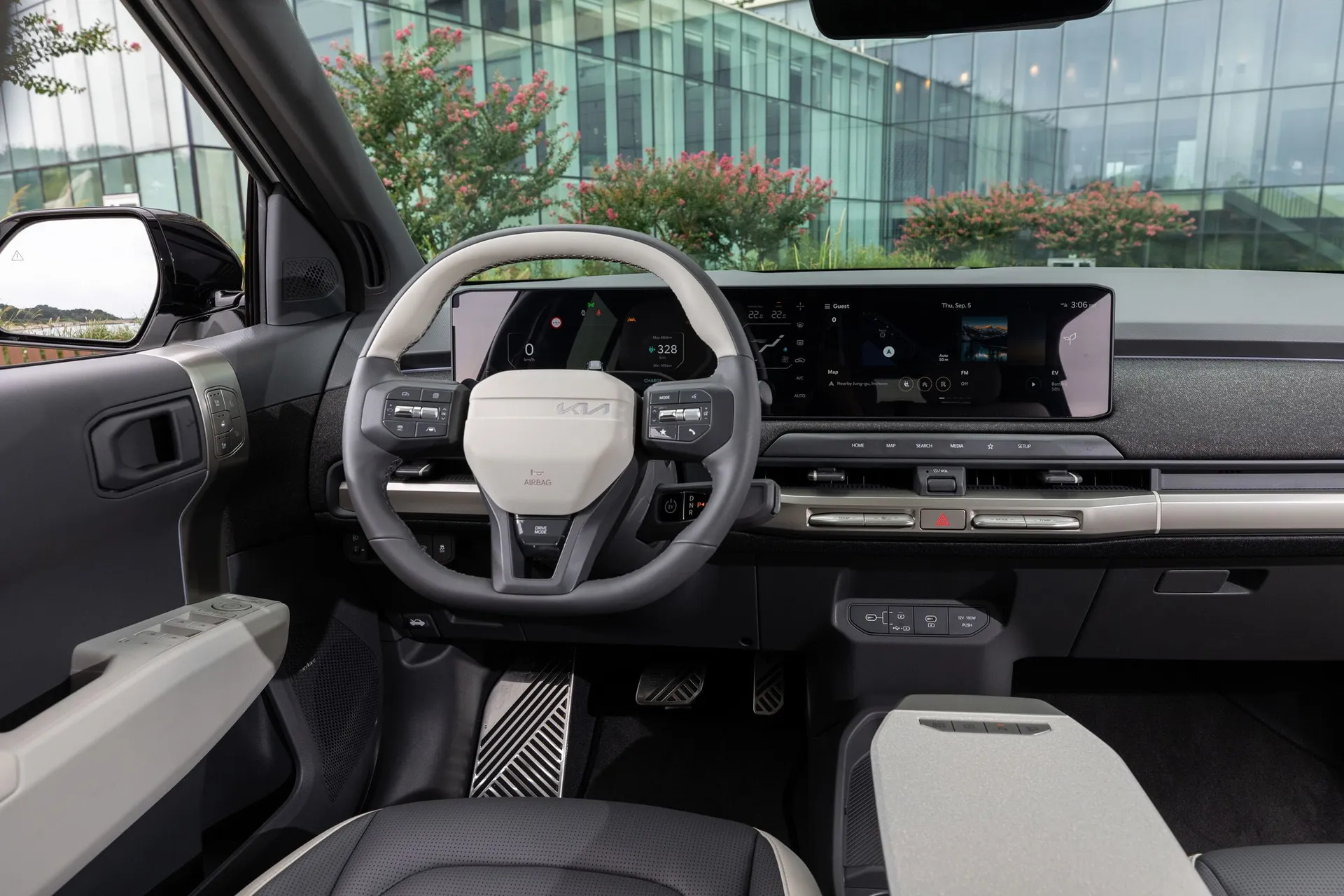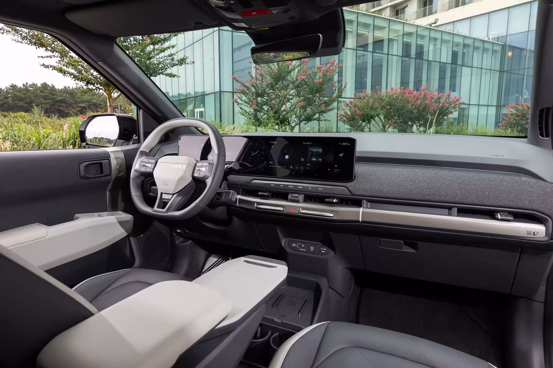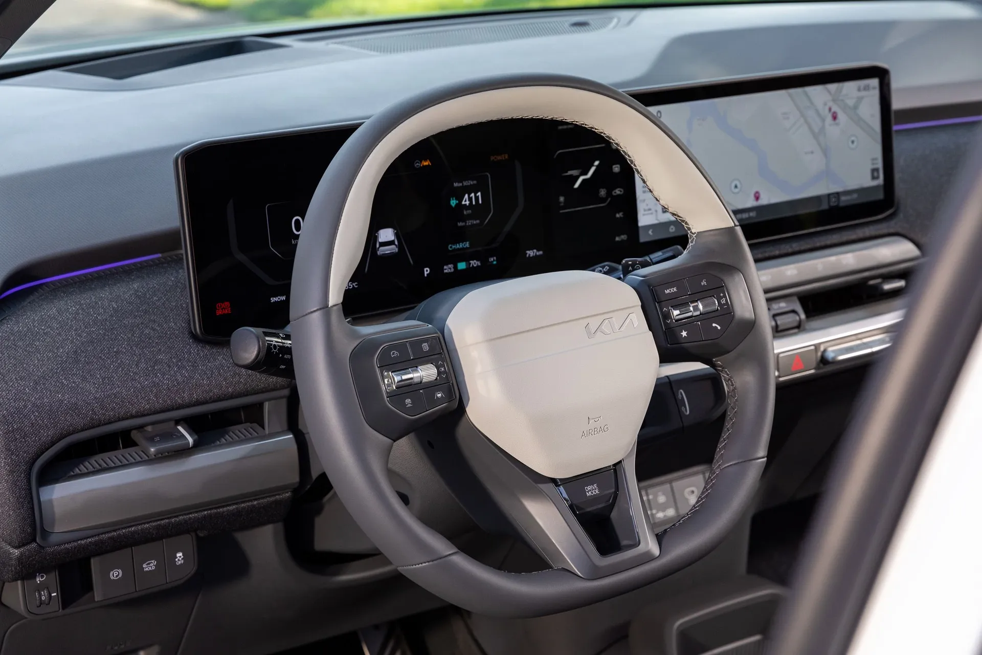 في الداخل، استثمرت كيا في بيئة بسيطة، تقنية، ومستدامة. البارز هو لوحة القيادة البانورامية التي تضم ثلاثة شاشات: مجموعة رقمية مقاس 12.3 بوصة للسائق، شاشة تعمل باللمس بحجم 5 بوصات للتحكم في التكييف، وشاشة مركزية للترفيه مقاس 12.3 بوصة. تعزز وحدة التحكم المركزية المنزلقة والمقاعد الأمامية وضع “الاسترخاء” التنوع والراحة. يبرز الاستخدام الواسع للمواد المعاد تدويرها (PET) والمواد البيئية (مثل “unleather” الاختياري) الالتزام البيئي.