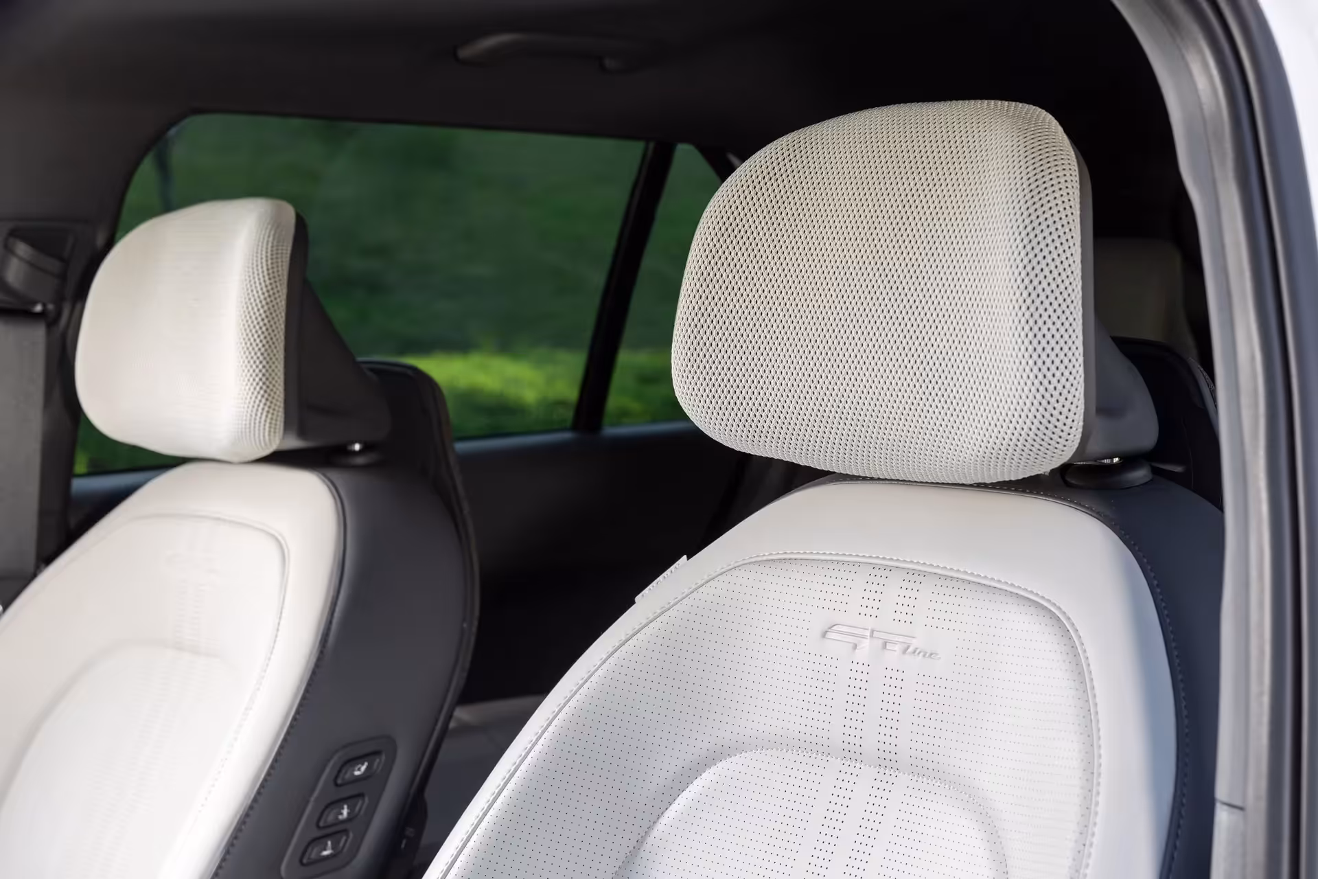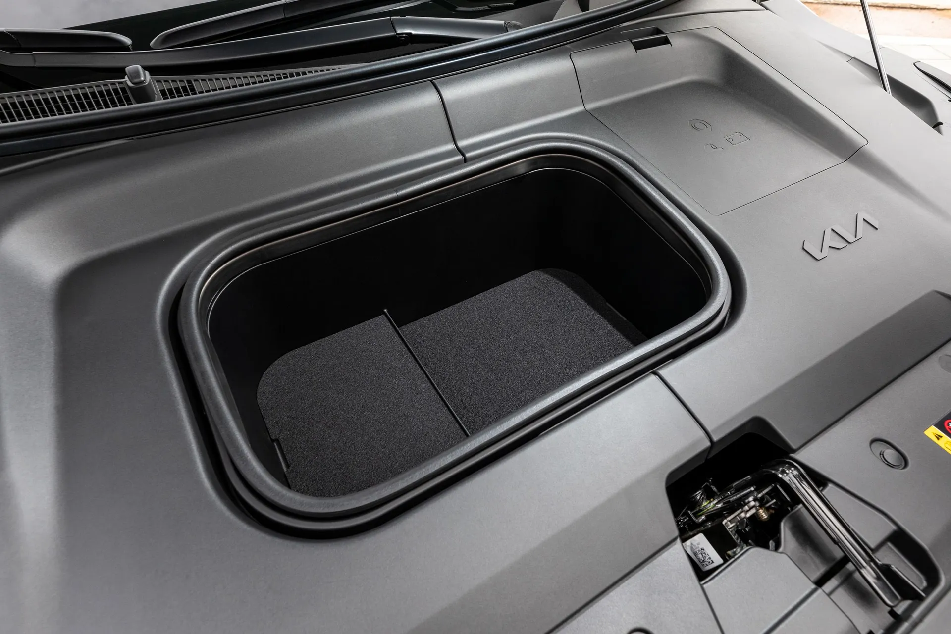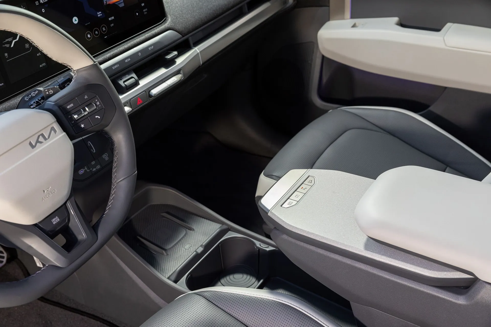 في الداخل، استثمرت كيا في بيئة بسيطة، تقنية، ومستدامة. البارز هو لوحة القيادة البانورامية التي تضم ثلاثة شاشات: مجموعة رقمية مقاس 12.3 بوصة للسائق، شاشة تعمل باللمس بحجم 5 بوصات للتحكم في التكييف، وشاشة مركزية للترفيه مقاس 12.3 بوصة. تعزز وحدة التحكم المركزية المنزلقة والمقاعد الأمامية وضع “الاسترخاء” التنوع والراحة. يبرز الاستخدام الواسع للمواد المعاد تدويرها (PET) والمواد البيئية (مثل “unleather” الاختياري) الالتزام البيئي.