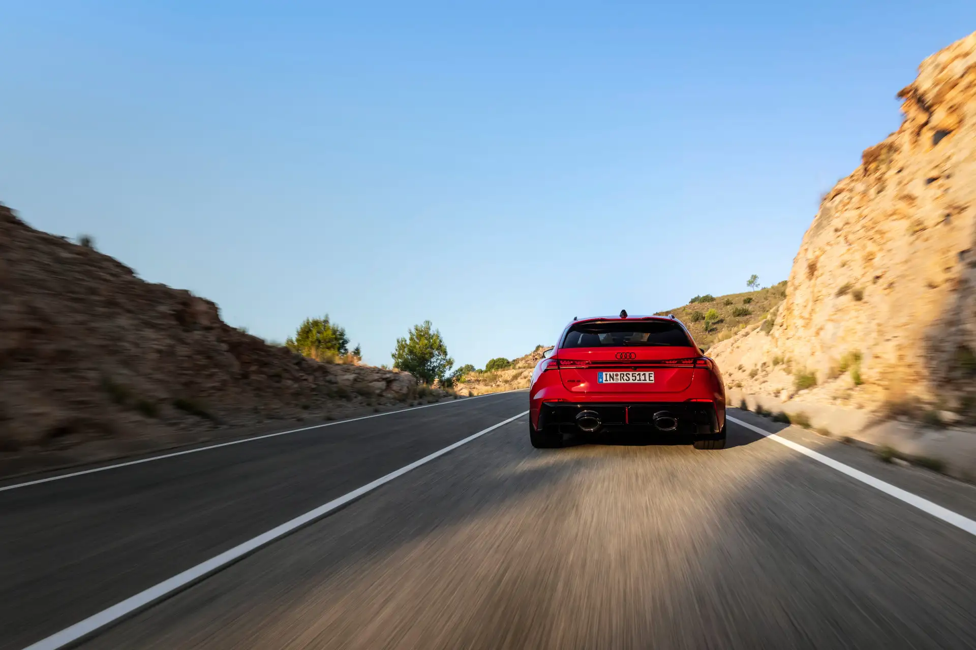 Na frente, a grade imponente domina o palco, flanqueada por faróis Matrix LED com luzes diurnas personalizáveis. Atrás, uma barra de luz OLED contínua une as lanternas, com saídas de escape quadruplas gigantes que evocam propulsores de jato. O spoiler ducktail na teto adiciona downforce sem comprometer o estilo fluido. Disponível nas versões sedan (liftback de quatro portas, com teto inclinado e porta-malas elevável) e Avant (perua versátil), o RS5 adapta-se a estilos de vida variados, mantendo a essência RS.