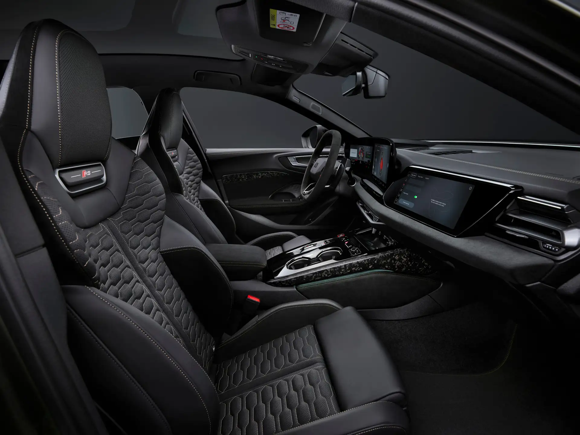 Entrando no AUDI RS5 2027, a cabine é um cockpit high-tech. A parede de telas inclui cluster de 11,9″, central de 14,5″ touch e 10,9″ para passageiro frontal – tudo rodando MMI intuitivo com HUD opcional. Bancos dianteiros com massagem, ventilação e acolchoado RS são padrão, com opções leather-free ou couro total em cinza/vermelho.