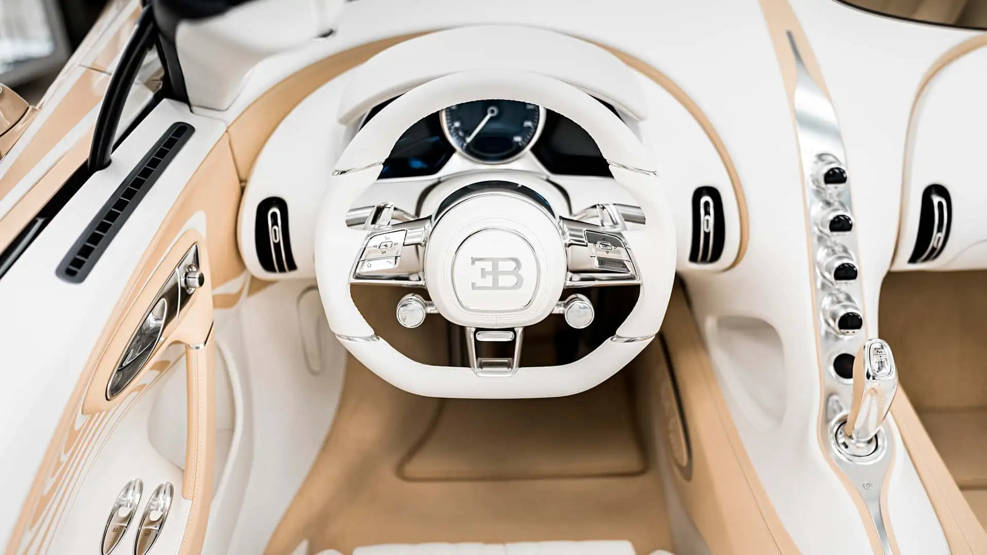 Detalhes finos incluem emblemas EB monogramados em ouro 24k costuras contrastantes e multimídia discreta priorizando analogia tátil. O cockpit ergonômico acomoda dois com bancos ventilados/aquecidos e head-up display projetando velocidades insanas. Ruído do W16 um sinfonia de 16 cilindros ecoa aberto amplificando adrenalina.
