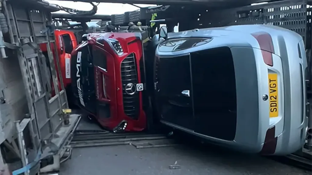 Nove supercarros são destruídos em um acidente no Reino Unido. O motorista do caminhão disse que tentou evitar atropelar ciclistas.