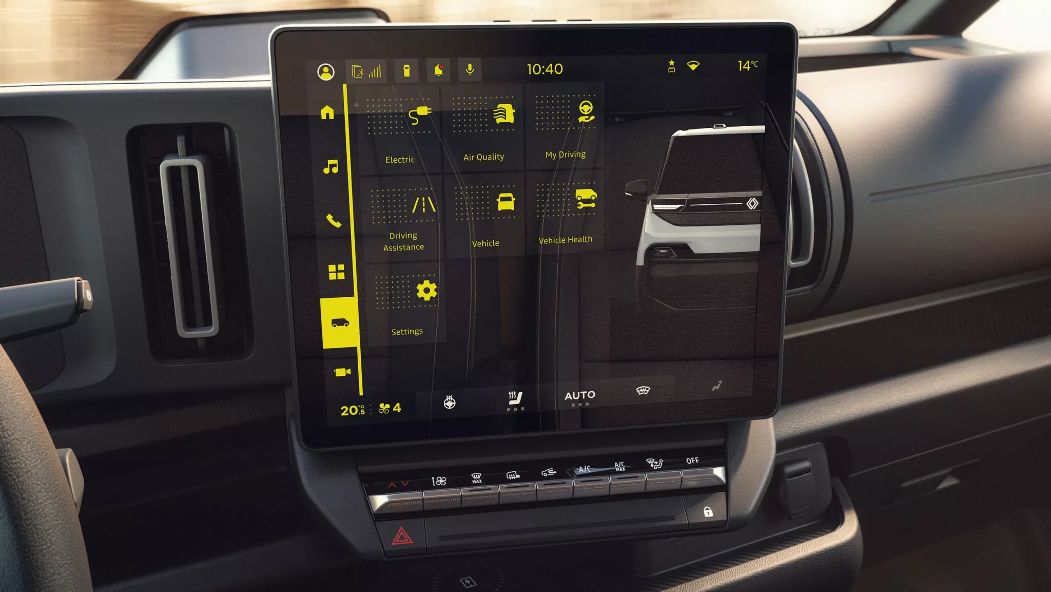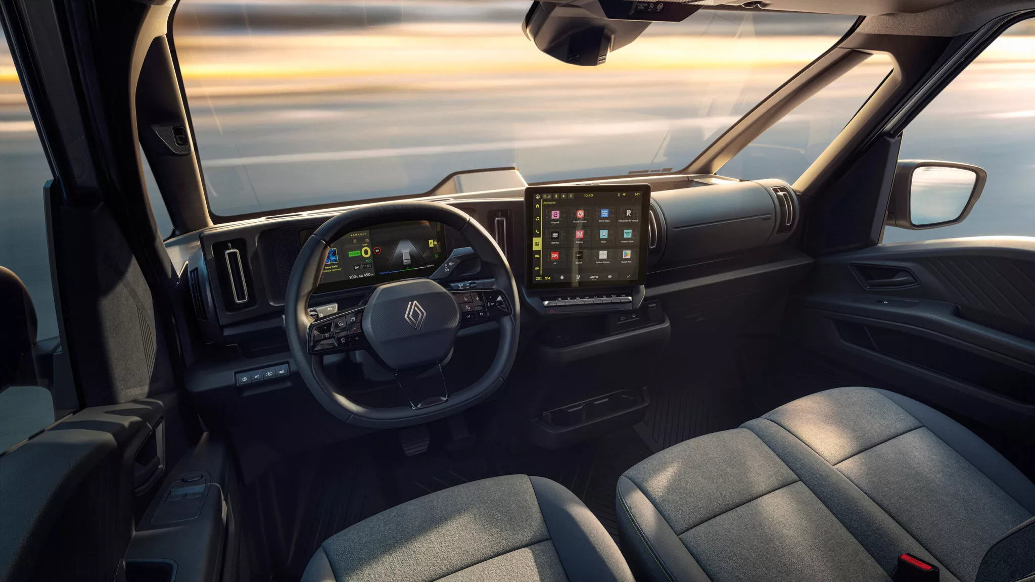 Embora a prioridade seja o espaço de carga, o interior da Trafic E-Tech Electric não decepciona. Com três assentos e um painel em formato de tubo, o cockpit oferece ergonomia e conforto. O volante de três raios, os inúmeros compartimentos de armazenamento e o estofamento em jeans Zeta com detalhes em cinza e costura contrastante criam um ambiente agradável e funcional.