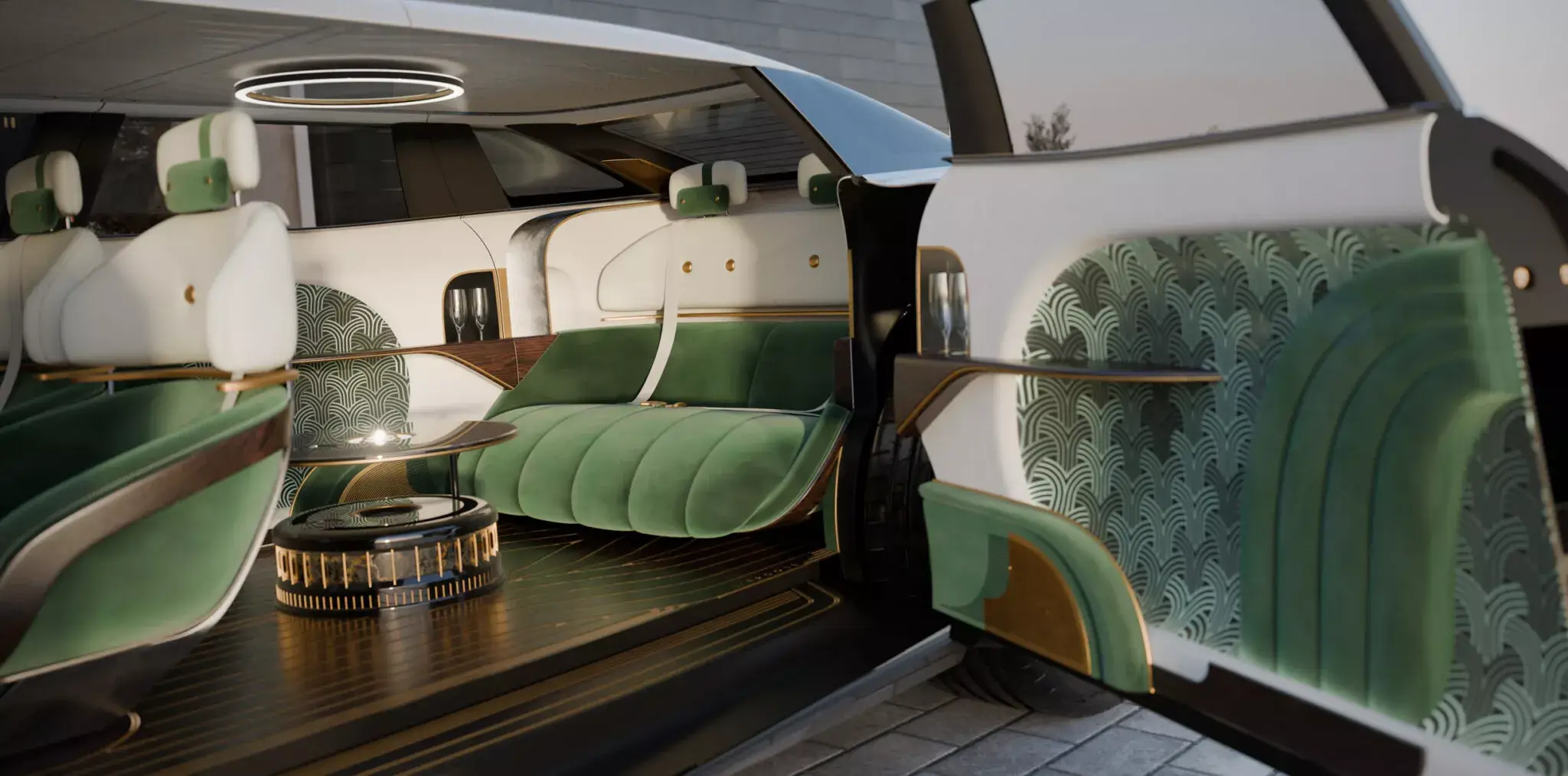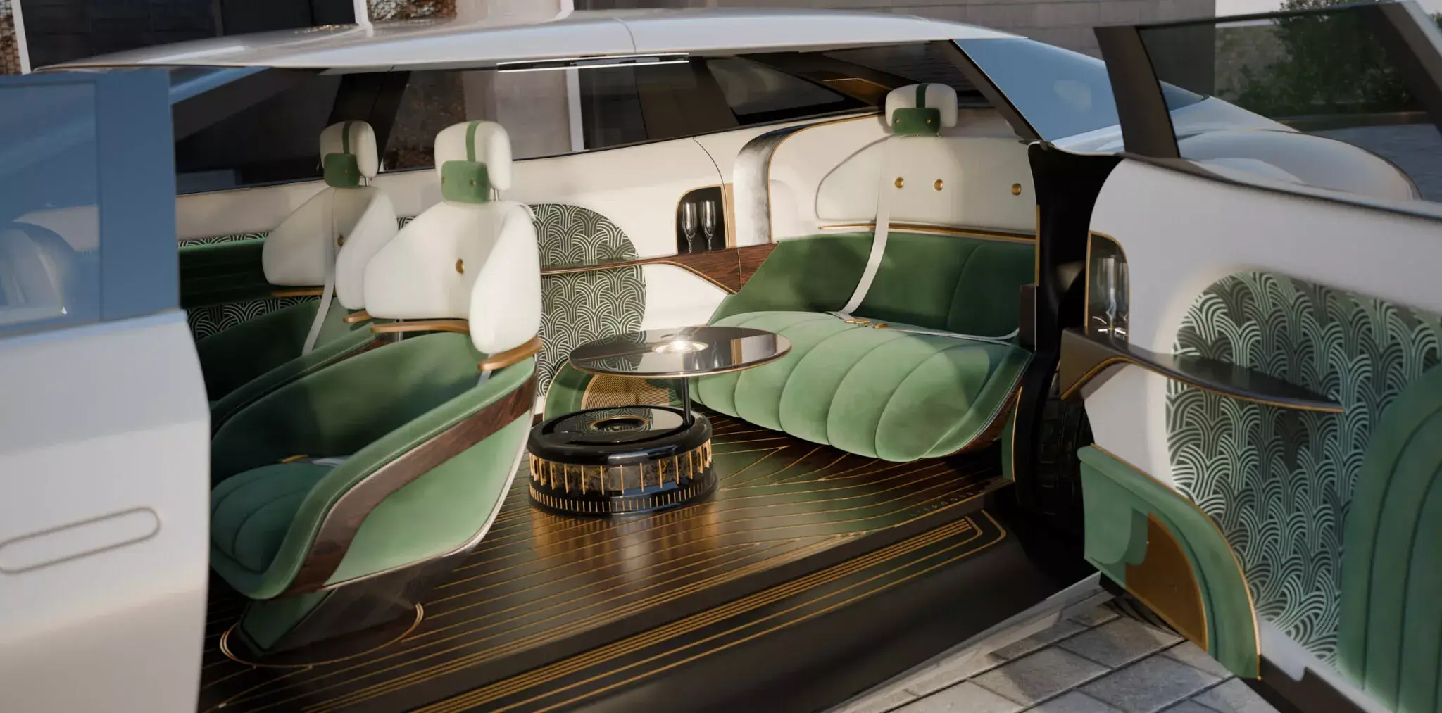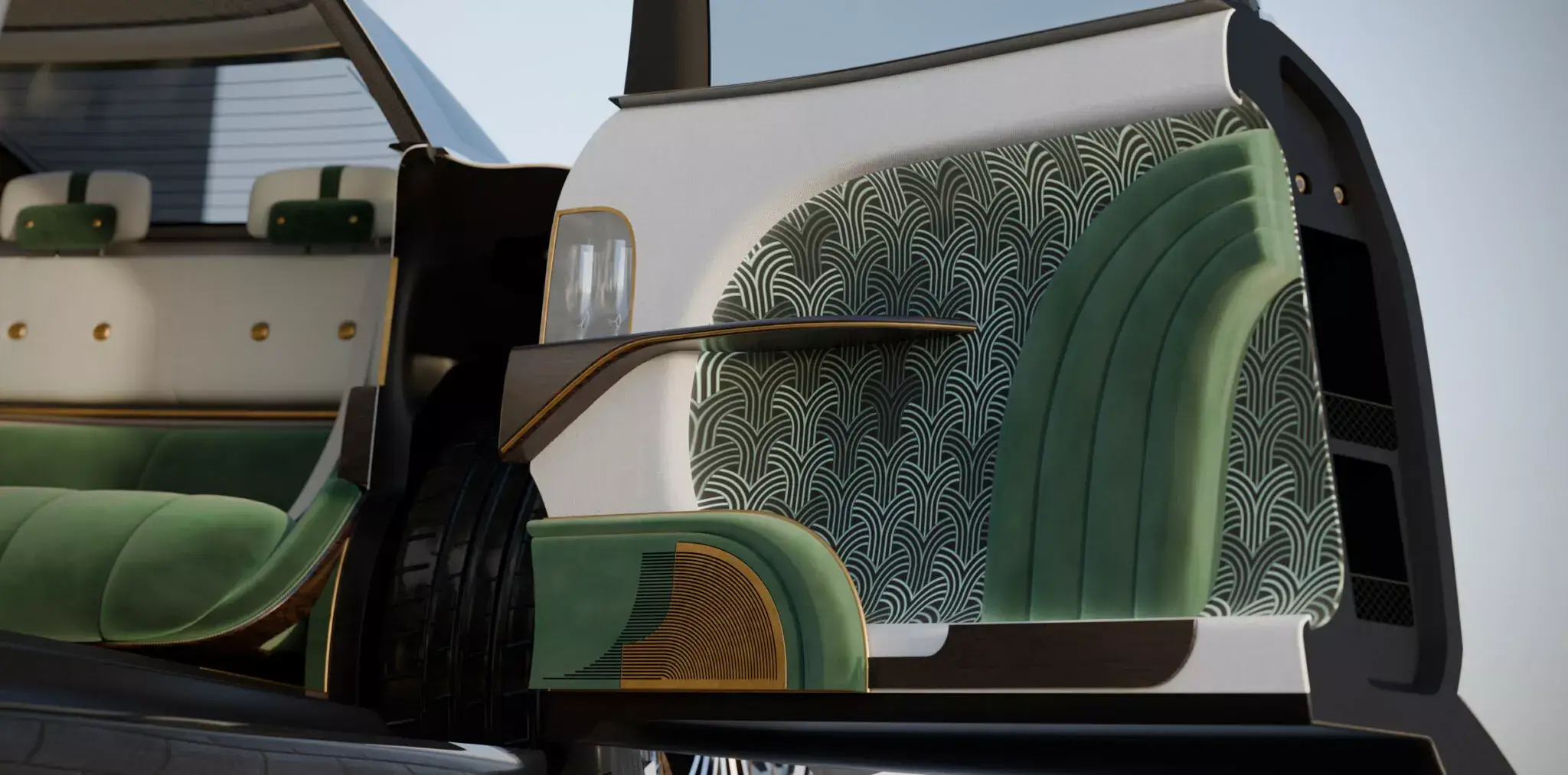 - Configuração lounge: o espaço traseiro dispensa o tradicional banco traseiro em favor de um sofá amplo, cadeiras dobráveis e um gabinete central multifuncional com frigobar, umidor de charutos ou enrolador de relógios.