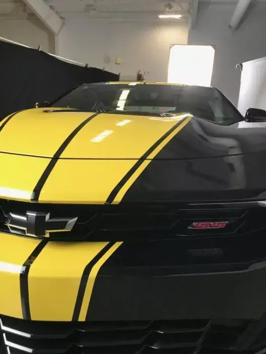 Der Camaro SS von Hertz ist nicht nur selten, sondern auch visuell beeindruckend. Die schwarze Karosserie, geschmückt mit lebhaften gelben Akzenten und Streifen, zieht alle Blicke auf sich. Die 20-Zoll-Räder in Satin-Schwarz, die beleuchteten Einstiegsleisten und die gelben Bremssättel verstärken die Exklusivität. Details wie der Frontsplitter und die Hertz-Embleme an den Seiten runden das einzigartige Erscheinungsbild ab.