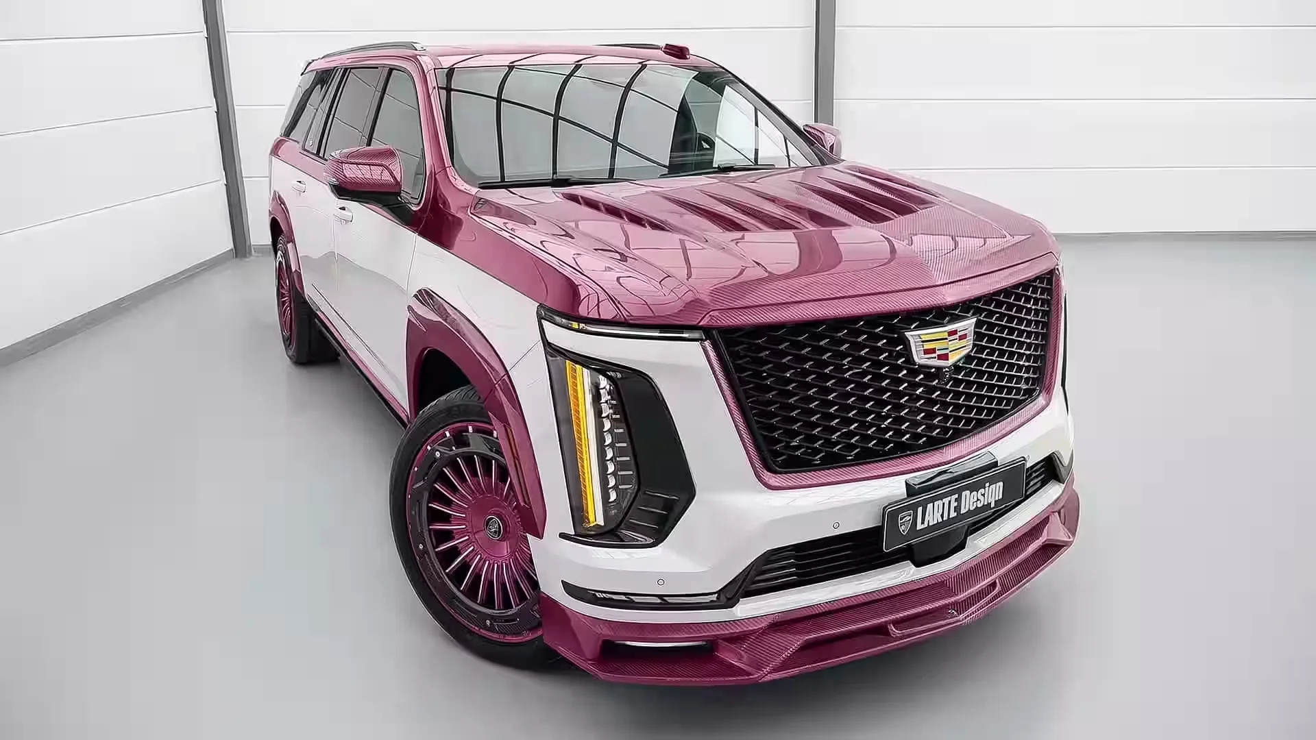 When a Cadillac Escalade already feels larger than life, turning it into a white-and-pink carbon spectacle is the kind of move that shifts it from luxury SUV to rolling statement piece.
