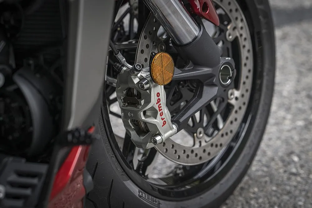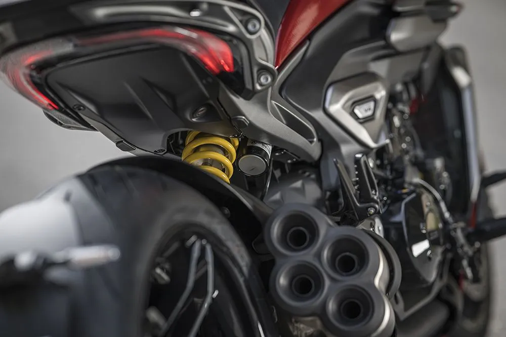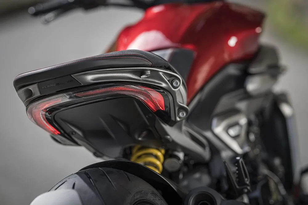 The XDiavel V4 didn’t come to strut at a café: muscular tank, single-sided swingarm, four-exit exhaust, full-LED lighting create an aggressive look. The “feet-forward” position typical of traditional cruisers, but — here’s the smart move — it can be transformed to a mid-controls ergonomic setup (with an accessory), totally changing the riding experience.