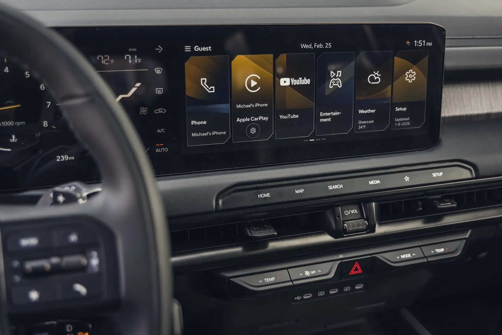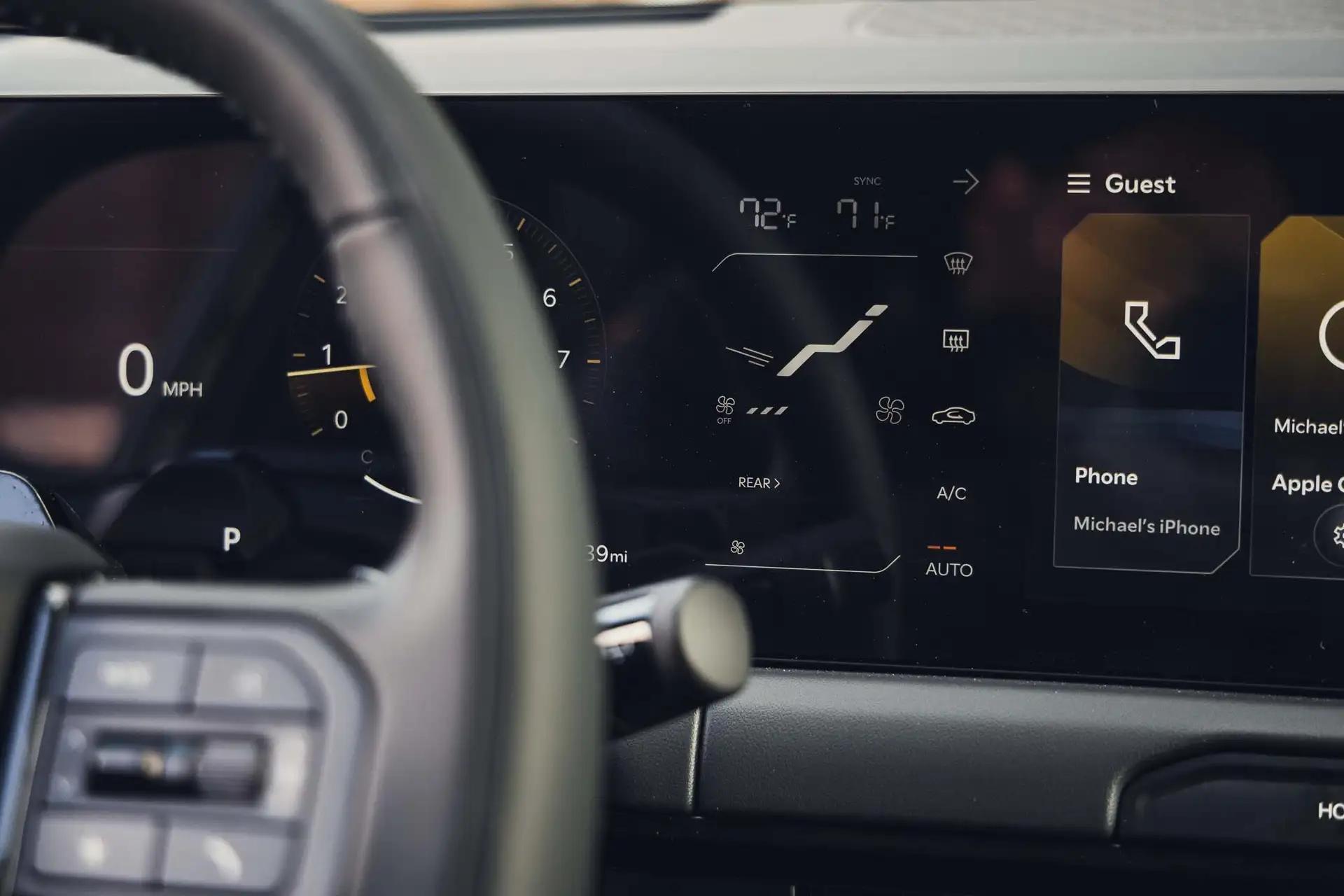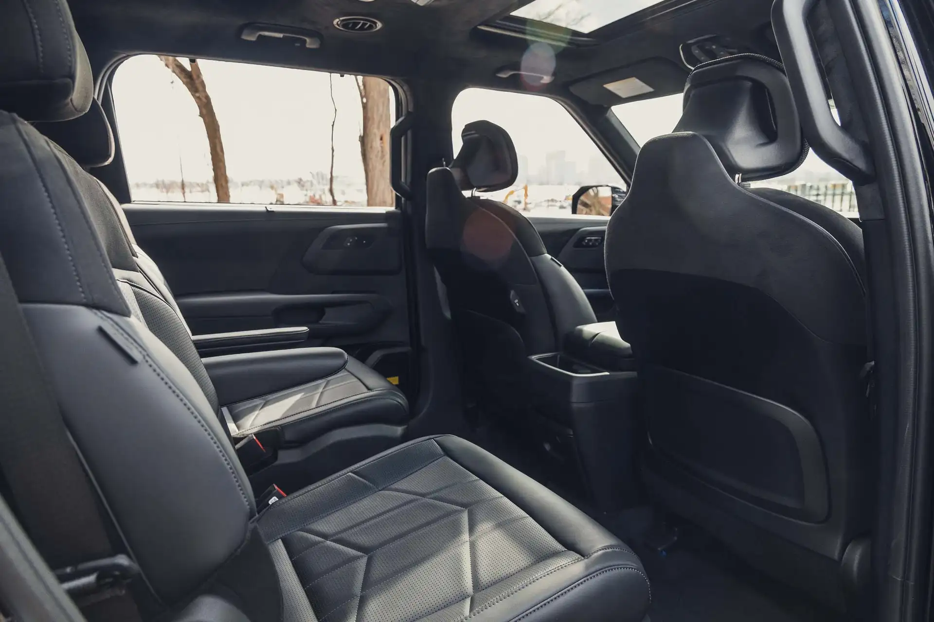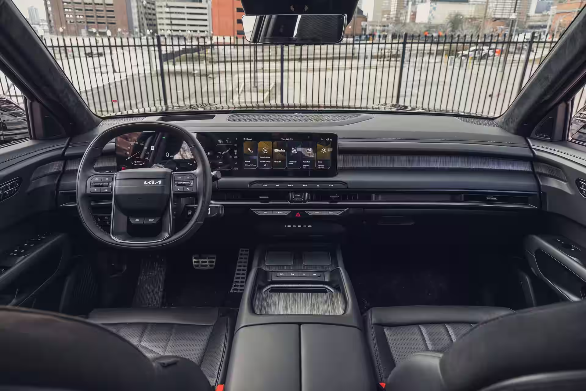 The unified digital dashboard dominates the cockpit: two 12.3-inch screens — one for instruments, the other for entertainment — form a visually striking set. The AI-updated voice assistant recognizes natural commands, and new features like video streaming and customization with NBA team logos turn the SUV into a mobile living room.
