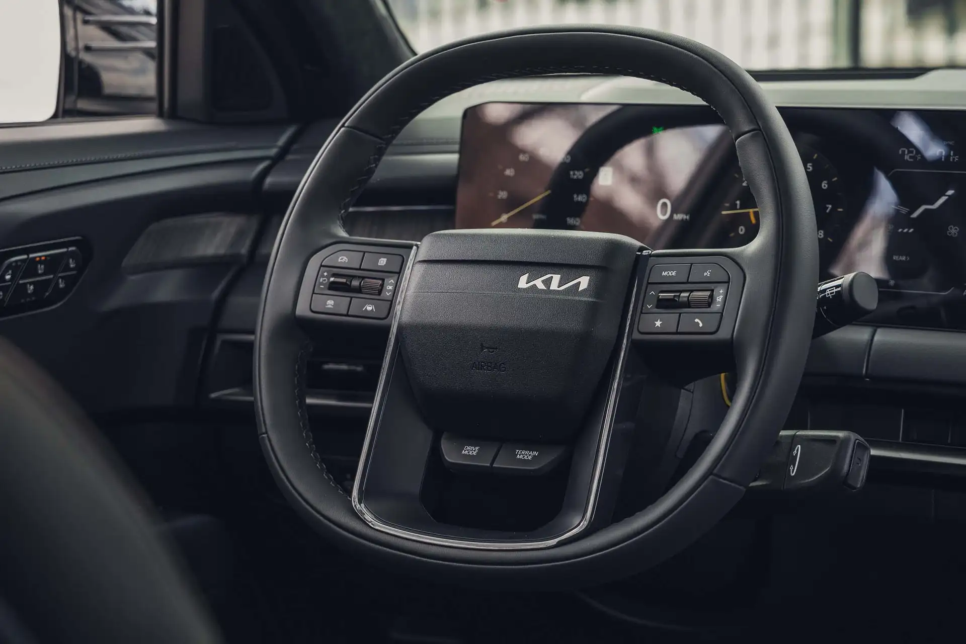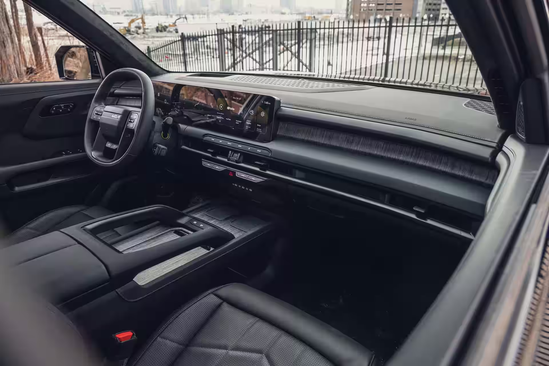 Ergonomics, fortunately, did not suffer from the obsession with the screen. Kia kept physical buttons for essential functions — air conditioning, audio volume, navigation shortcuts — while repositioning the gear lever to the steering column. The result is a more functional center console, with two wireless chargers and multi-level storage compartments.