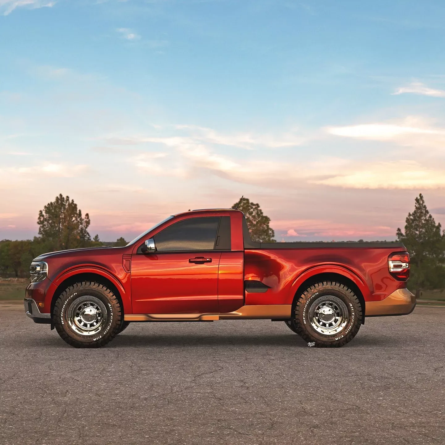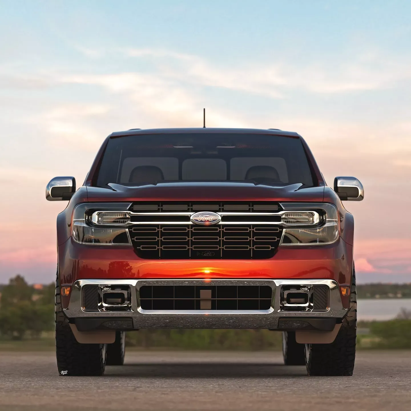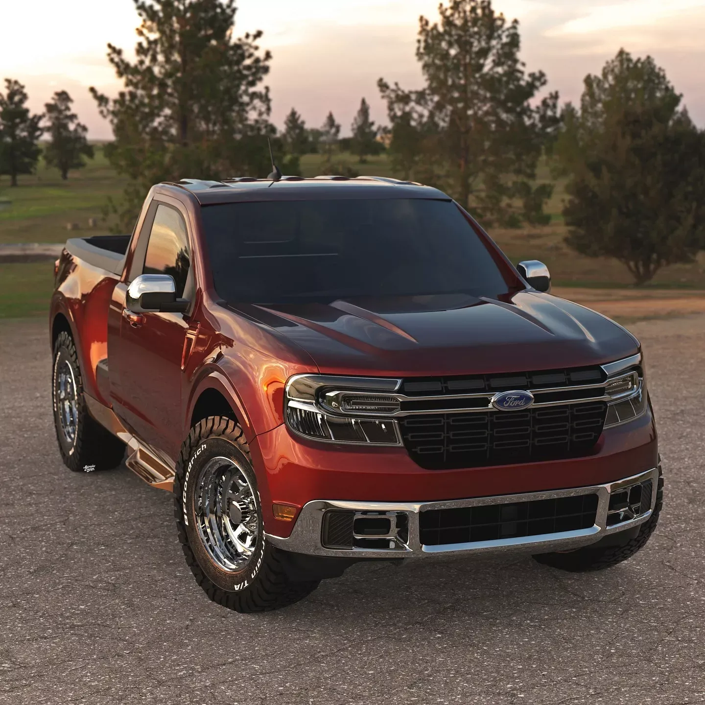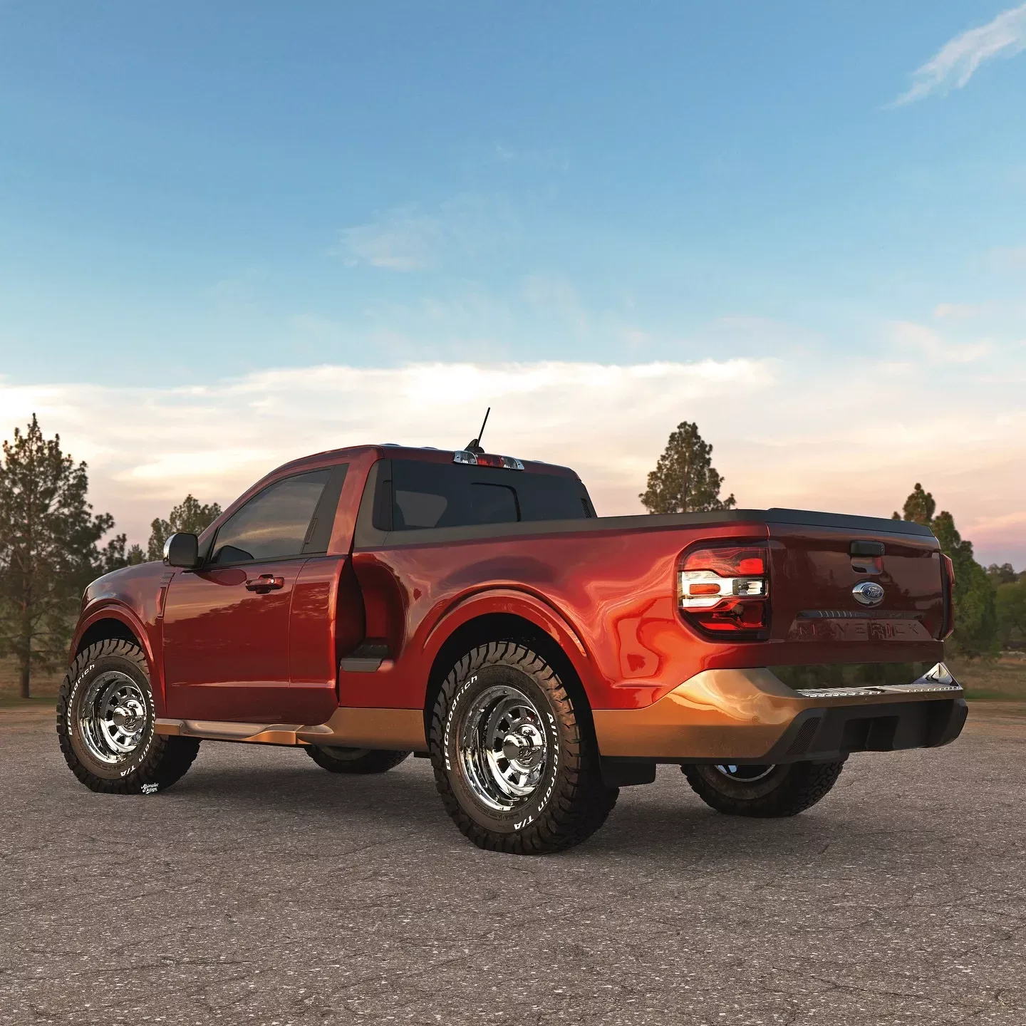 The Maverick SVT Lightning two-door concept draws inspiration from the iconic F-150 SVT Lightning, promising an aggressive, lowered look with the potential for a powerful engine, ideal for performance enthusiasts. Meanwhile, the luxury concept, inspired by the F-150’s Eddie Bauer and King Ranch versions, emphasizes refinement with a two-tone paint scheme, chrome accents, and a sophisticated aesthetic.