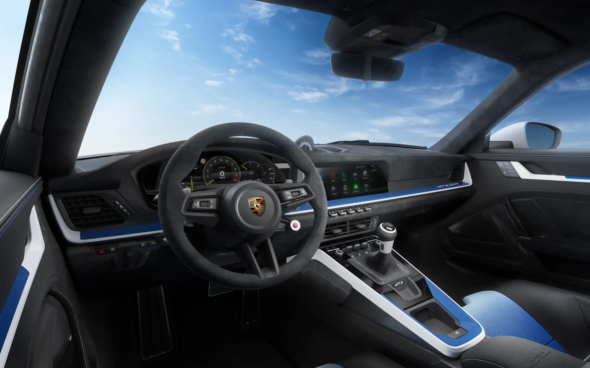 That same theme continues inside. The leather on the dashboard and doors uses double stitching in Speed Blue on the inside and white on the outside, creating a deliberate visual split between road and circuit. The illuminated brushed-aluminium door sill plates carry the GT3 Artisan Edition script, while the seat pattern draws inspiration from traditional Japanese indigo dye with layered tonal depth. The result is more than decorative coherence; it is the kind of interior specification that Porsche buyers will remember when the novelty of rarity fades.