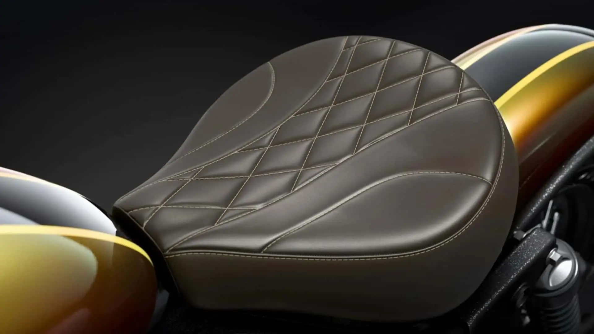 The paint job of this special edition is a showstopper: a gradient transitioning from deep black to metallic gold-bronze, separated by hand-painted stripes (Madras stripes) that evoke the heyday of British motorcycling. The saddle-style seat, with diamond stitching and thick padding, isn’t just aesthetic; it offers real comfort for long rides, proving that style and function can coexist.