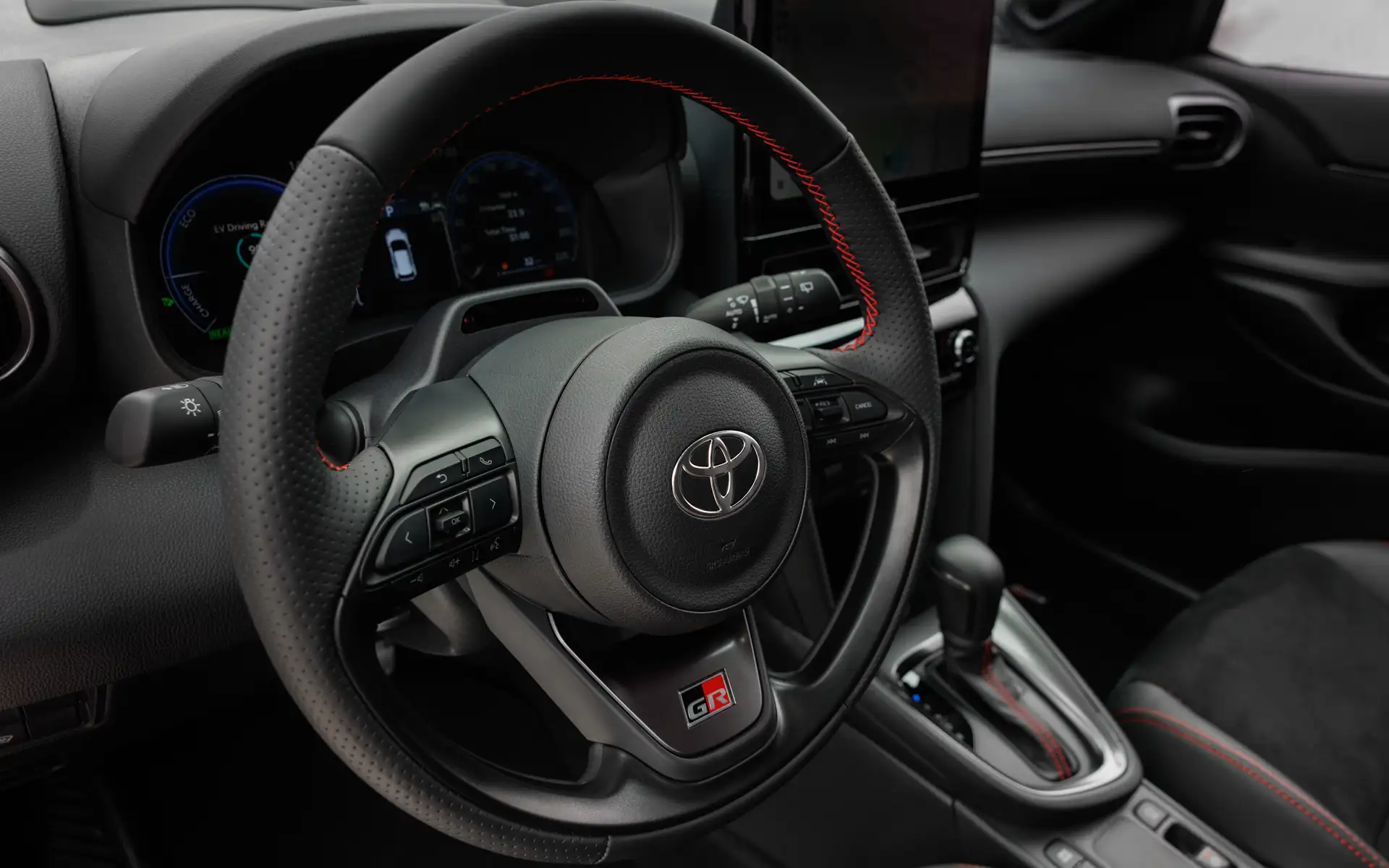 At the top of the range sits the Yaris Cross GR Sport. Toyota gives it a unique front bumper with side inserts, polished 18-inch wheels, sport seats with suede-like trim, red stitching, GR logos, and darker silver interior accents. The chassis tuning is also firmer, with a revised suspension setup designed to sharpen turn-in and make the car feel more responsive.