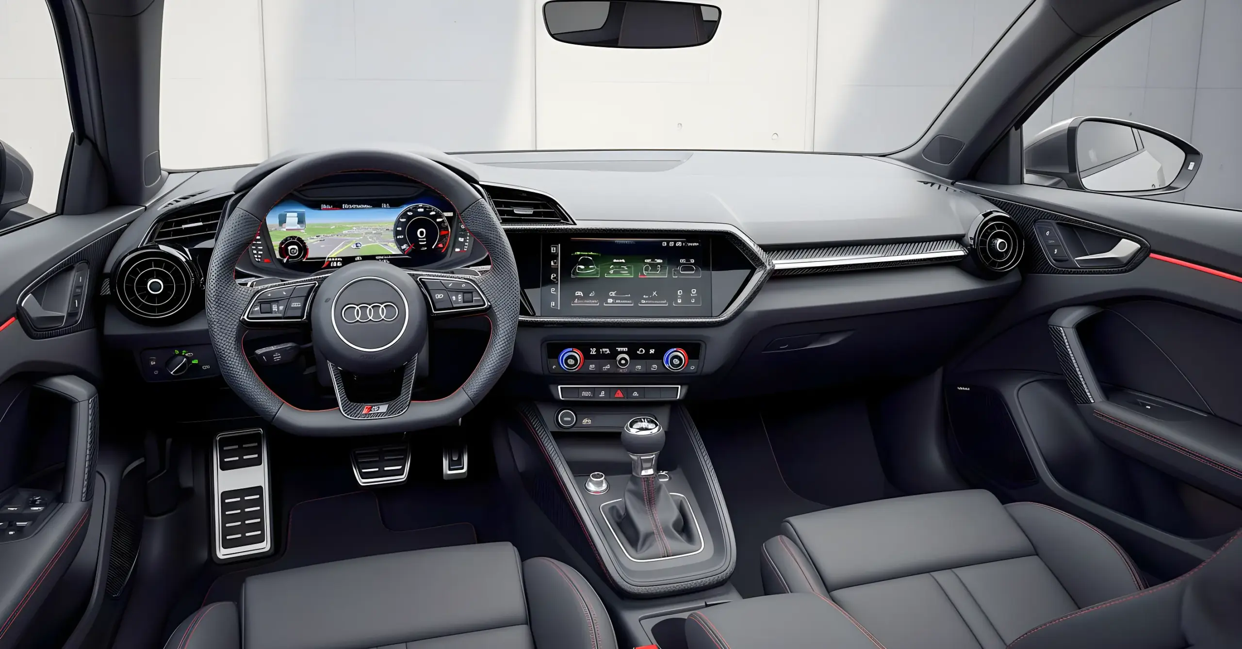 Panel con Virtual Cockpit RS, asientos tipo concha en Nappa/Alcantara, volante de base recta, fibra de carbono en los detalles. Por fuera, parachoques con entradas enormes, rejilla tipo panal negra, “blisters” en los guardabarros, difusor funcional y doble salida ovalada. Suspensión adaptativa de serie, frenos mayores y modo RS en Drive Select completan el paquete.