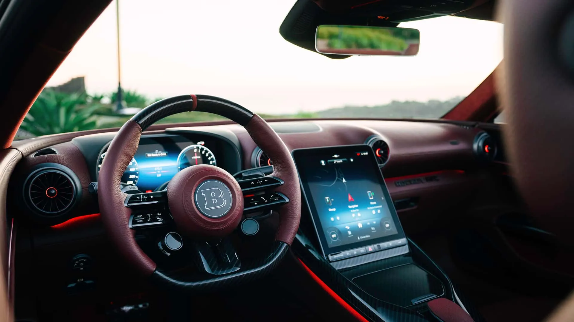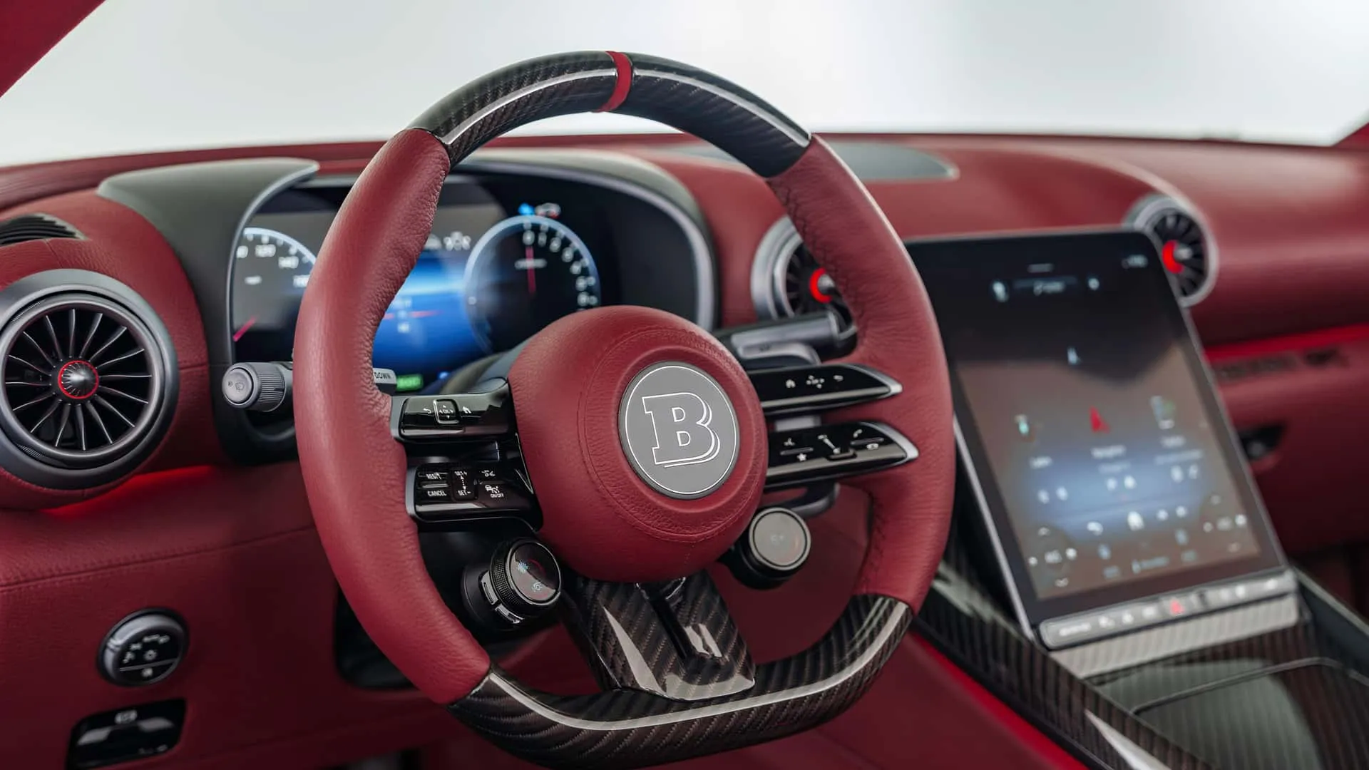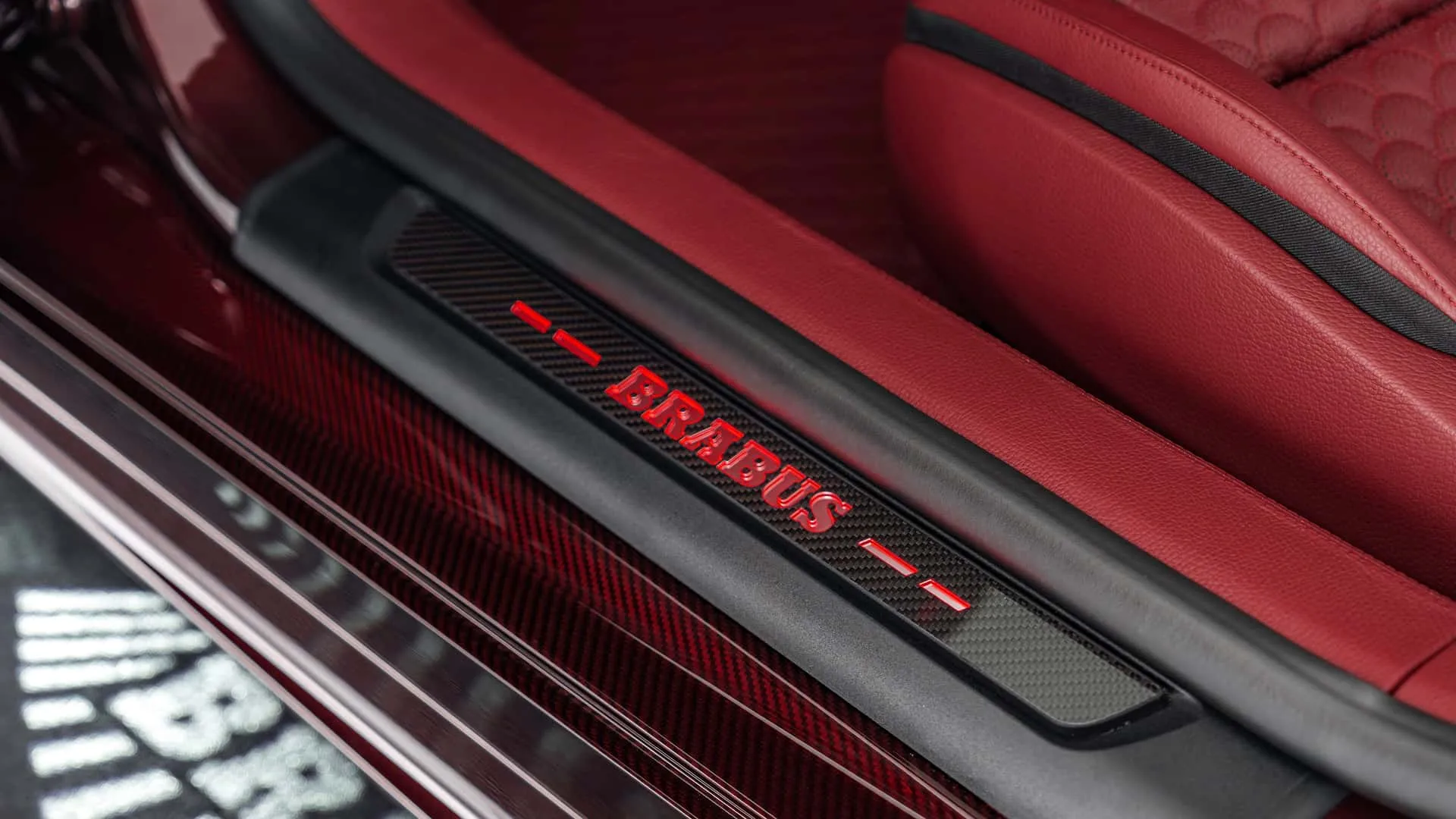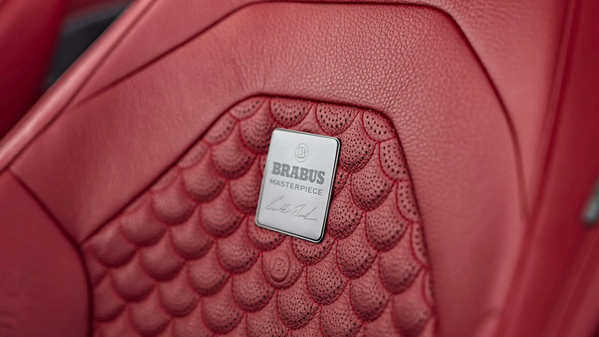 Por dentro, es Masterpiece Leather en rojo profundo con costuras “Shell” milimétricas e insertos en Signature Carbon. Pedales específicos, molduras en Shadow Gray y logotipos BRABUS iluminados manteniendo el ambiente de taller — sin tonterías innecesarias, todo transmite una sensación táctil de precisión.