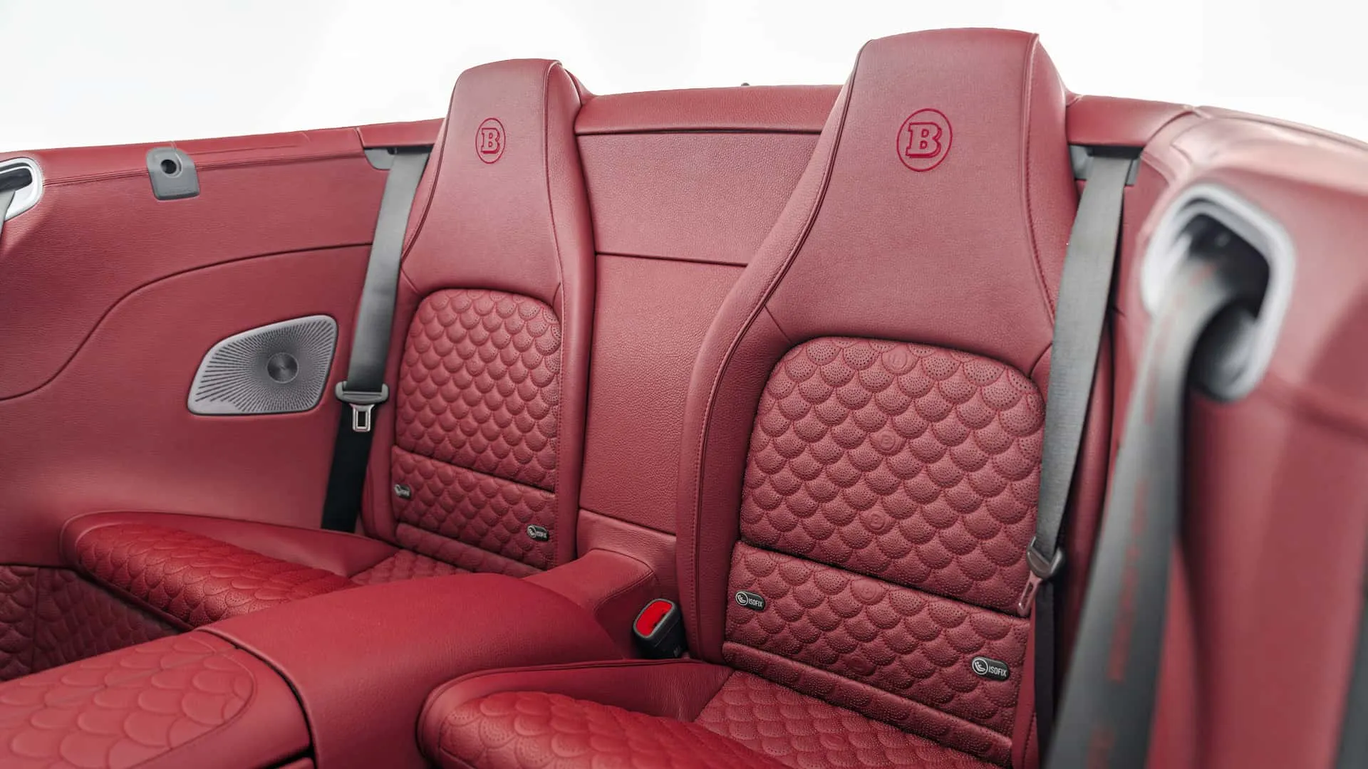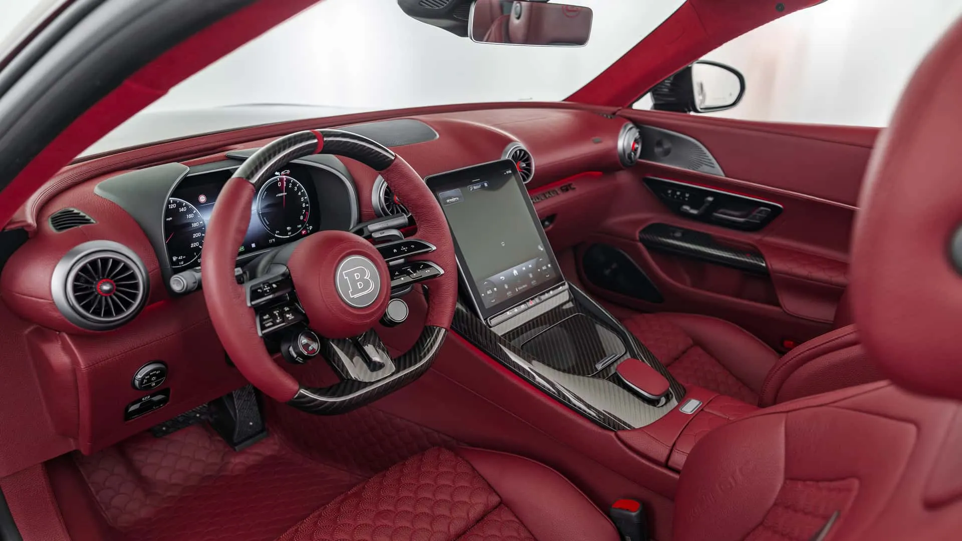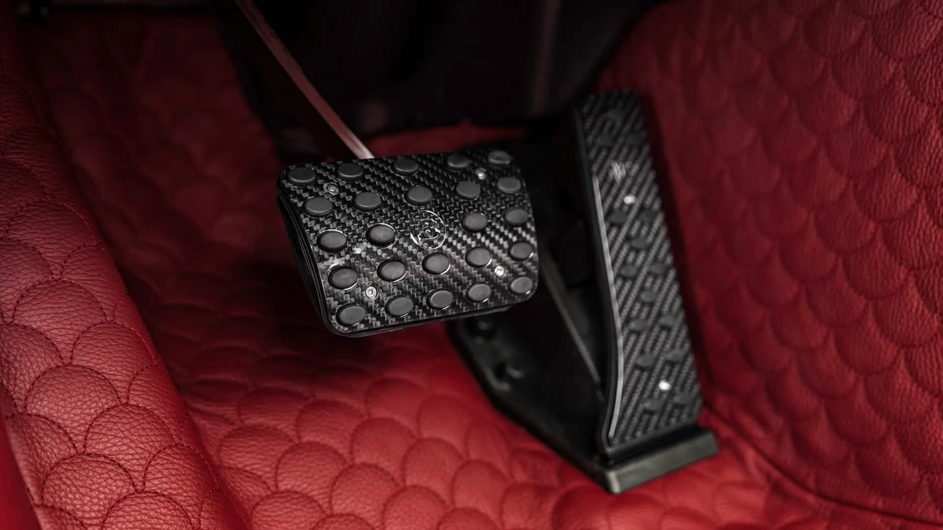 Por dentro, es Masterpiece Leather en rojo profundo con costuras “Shell” milimétricas e insertos en Signature Carbon. Pedales específicos, molduras en Shadow Gray y logotipos BRABUS iluminados manteniendo el ambiente de taller — sin tonterías innecesarias, todo transmite una sensación táctil de precisión.