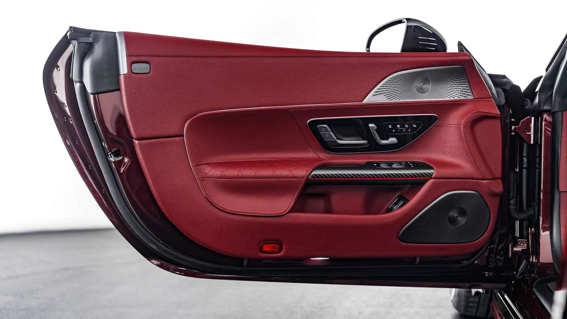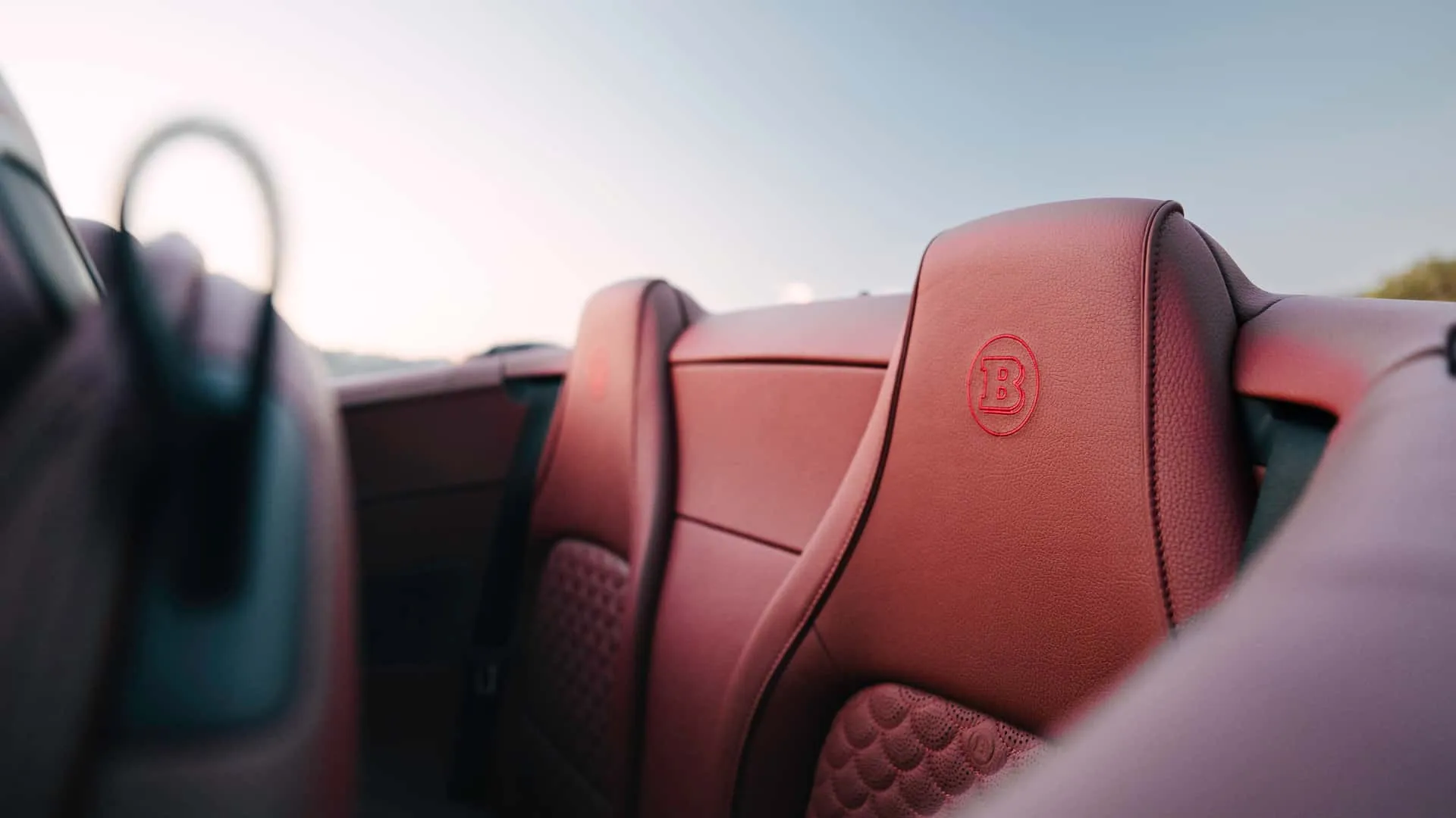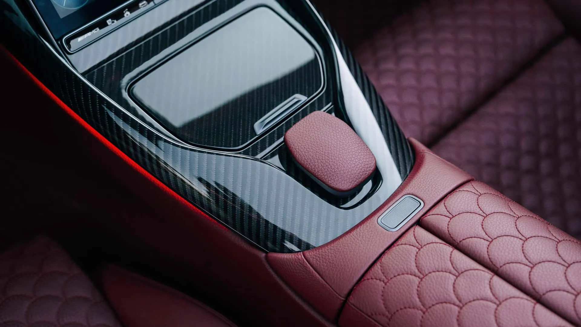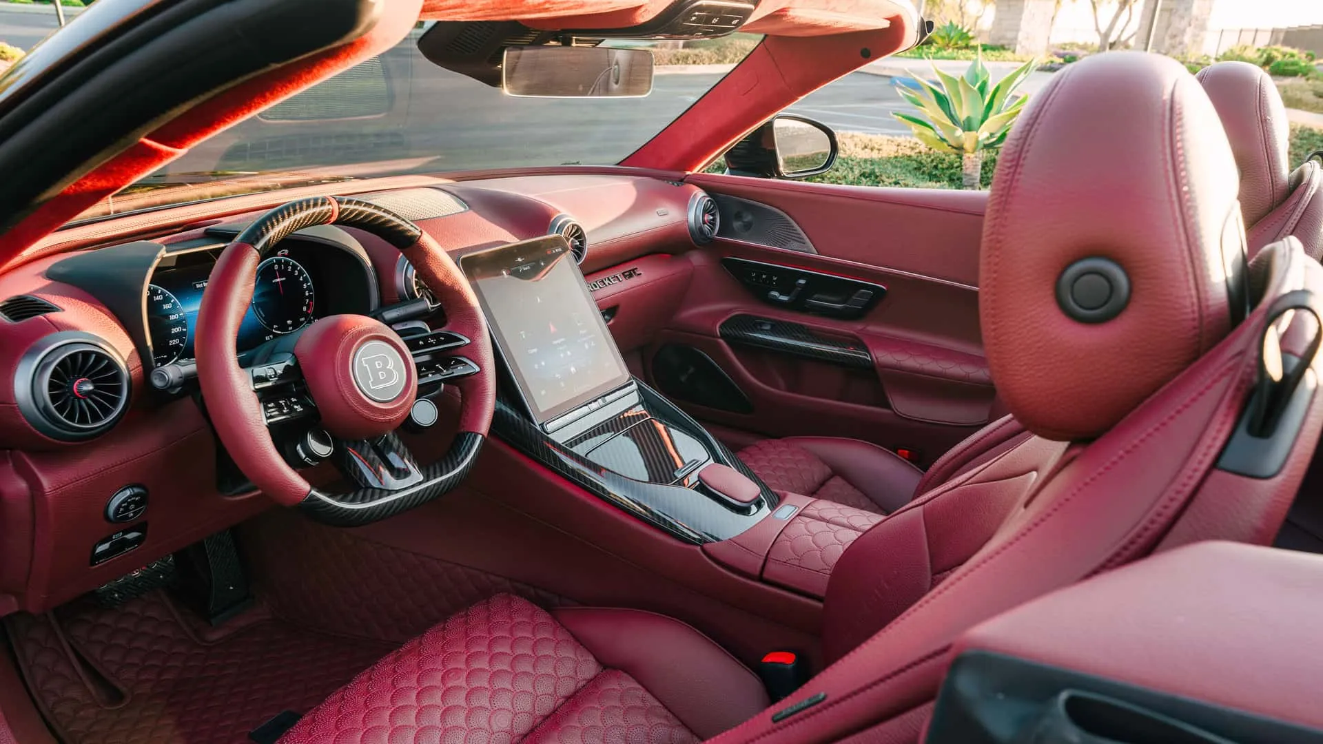 Por dentro, es Masterpiece Leather en rojo profundo con costuras “Shell” milimétricas e insertos en Signature Carbon. Pedales específicos, molduras en Shadow Gray y logotipos BRABUS iluminados manteniendo el ambiente de taller — sin tonterías innecesarias, todo transmite una sensación táctil de precisión.