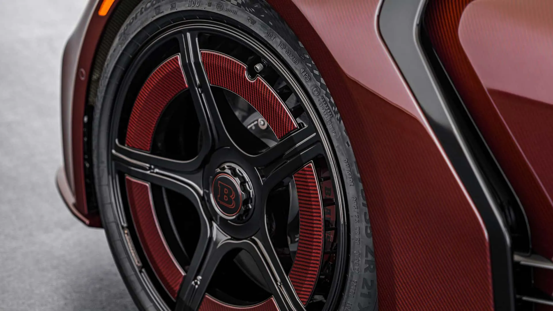 Empiezo por el acabado: todo el cuerpo es de carbono rojo expuesto, fabricado en prepreg y validado en túnel de viento. El resultado es ligereza, rigidez y una firma visual que grita rendimiento desde lejos. Las ruedas Monoblock P Platinum Edition (21″ en la delante, 22″ en la trasera) con Aeroblades en carbono rojo afianzan una actitud agresiva.