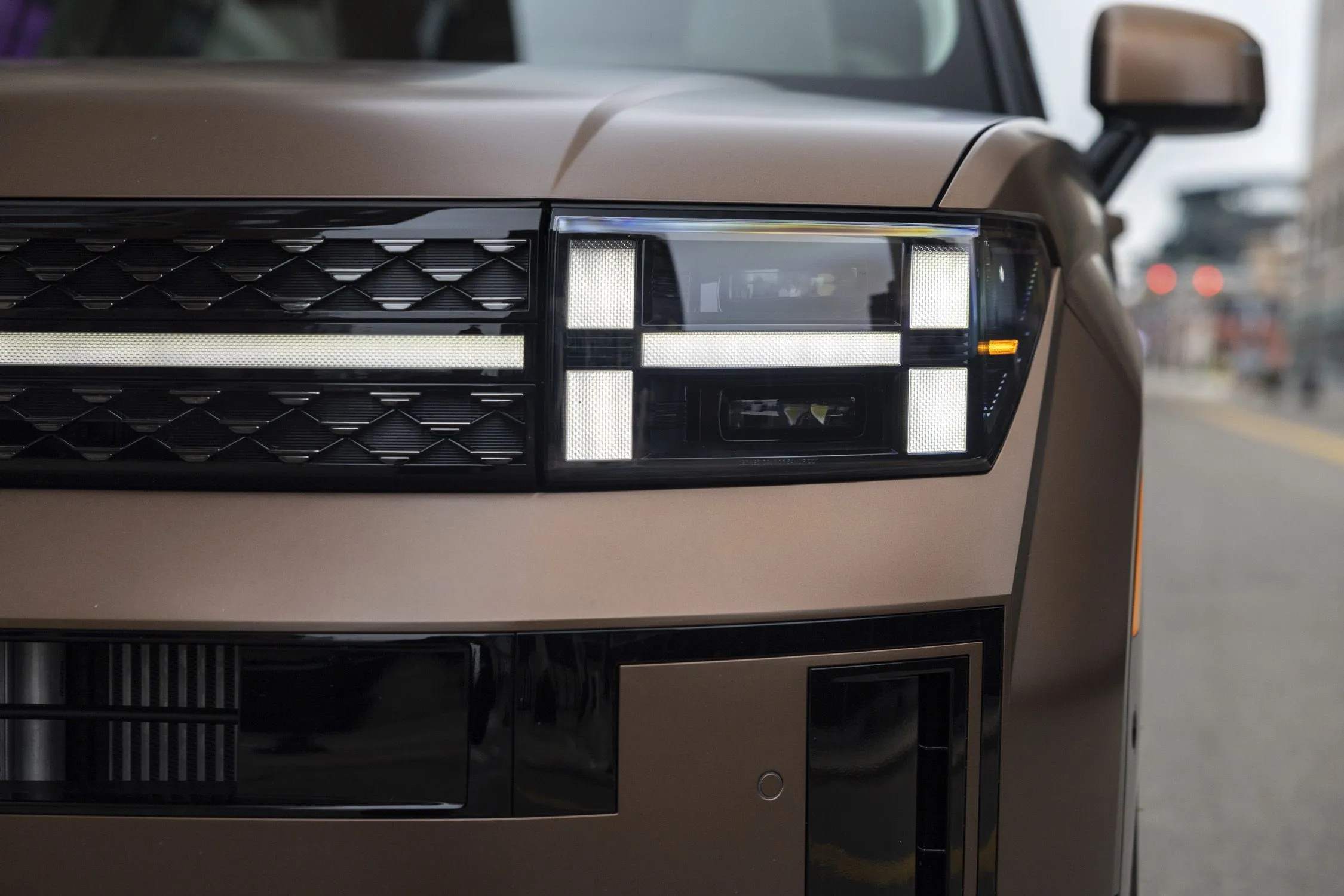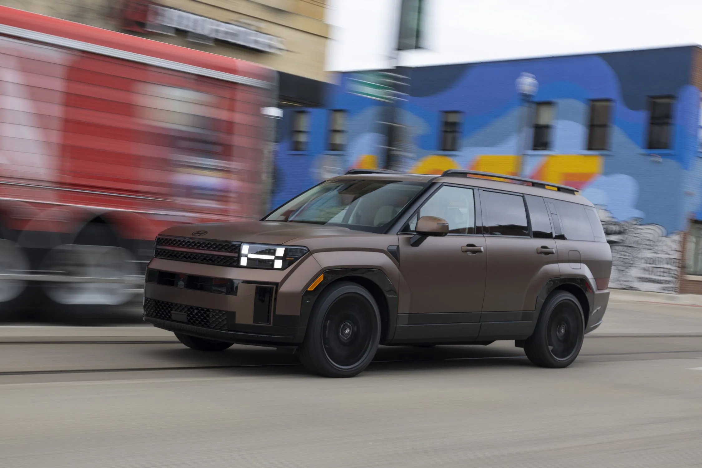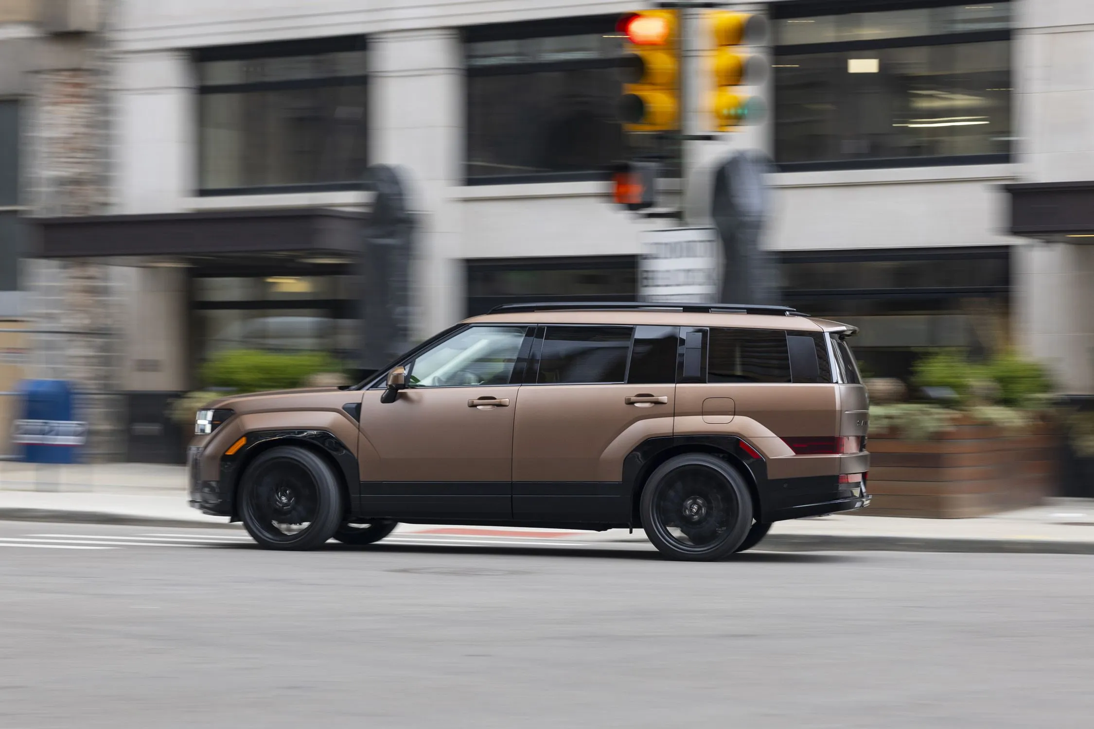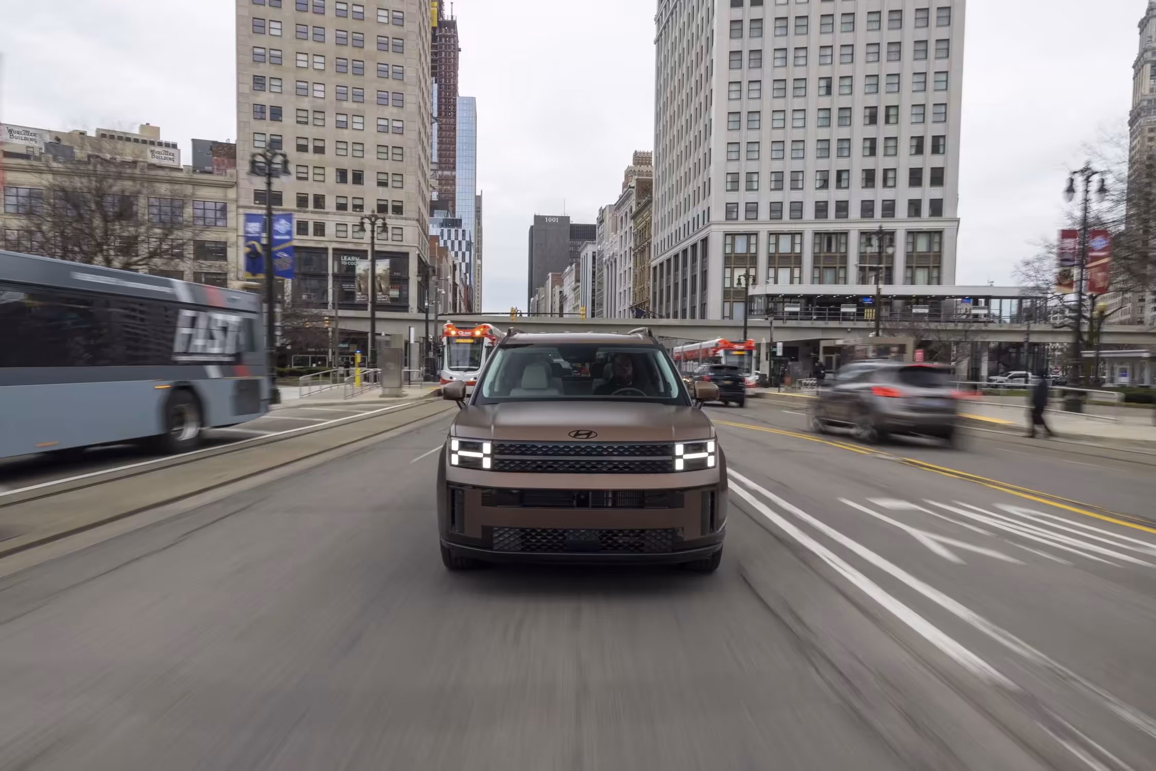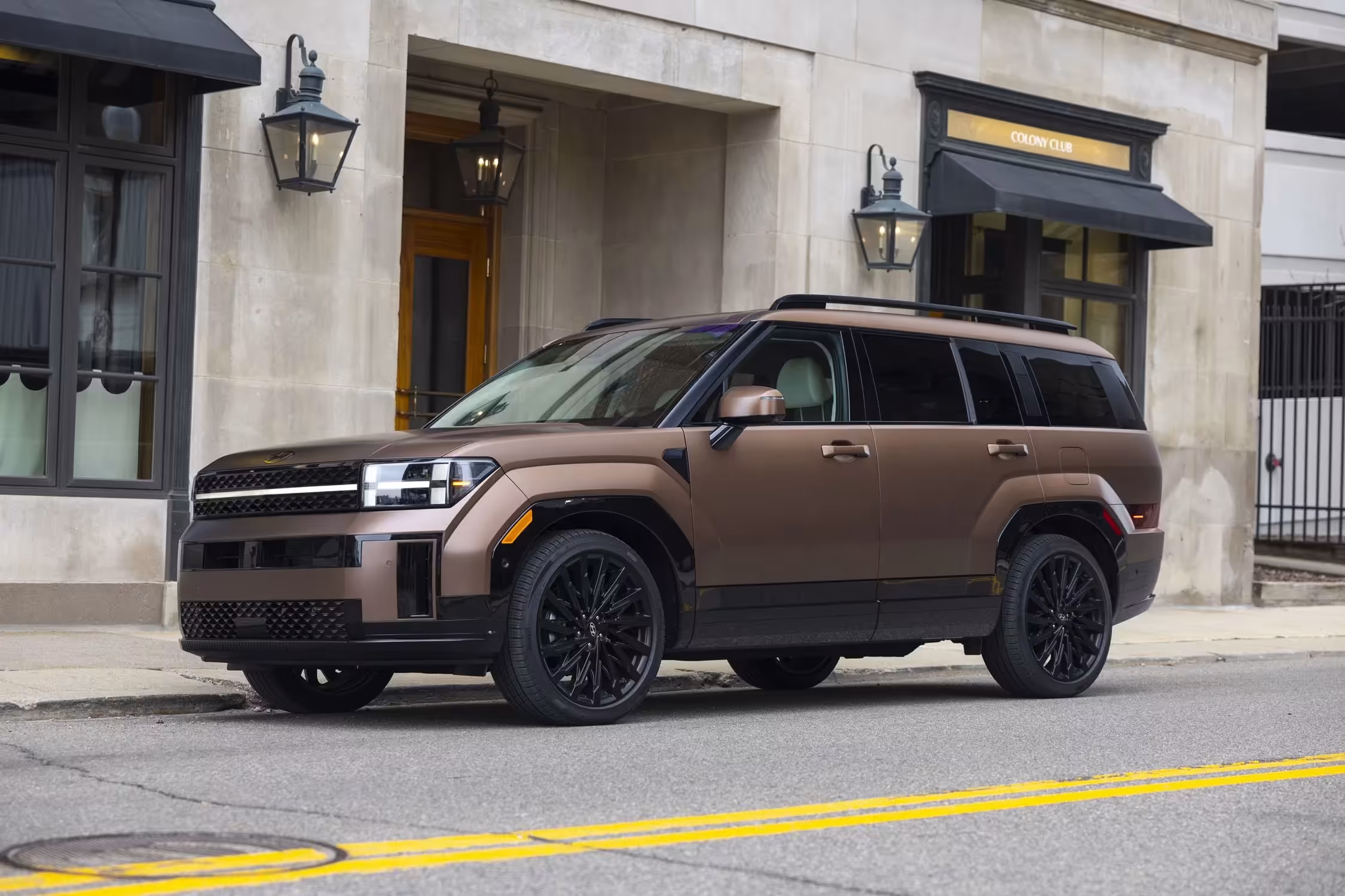 No se puede negar: el diseño del Hyundai Santa Fe 2025 es el tema del momento. Hyundai ha lanzado la cautela por la ventana y ha apostado por líneas rectas, ángulos marcados y una parte frontal imponente con faros en forma de «H». La inspiración en modelos como el Land Rover Defender es clara, buscando una imagen más robusta y aventurera.