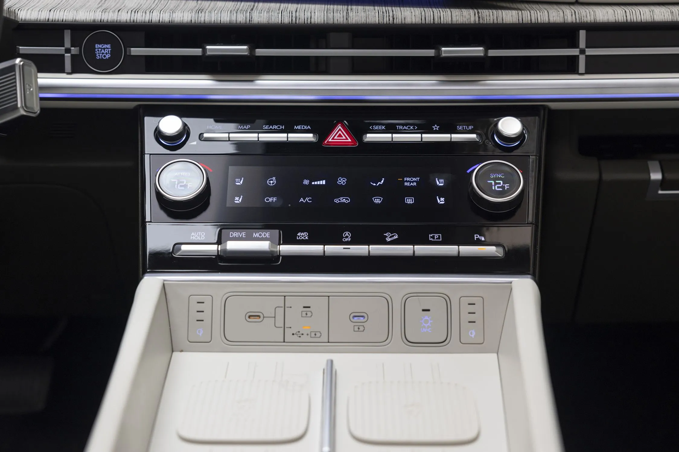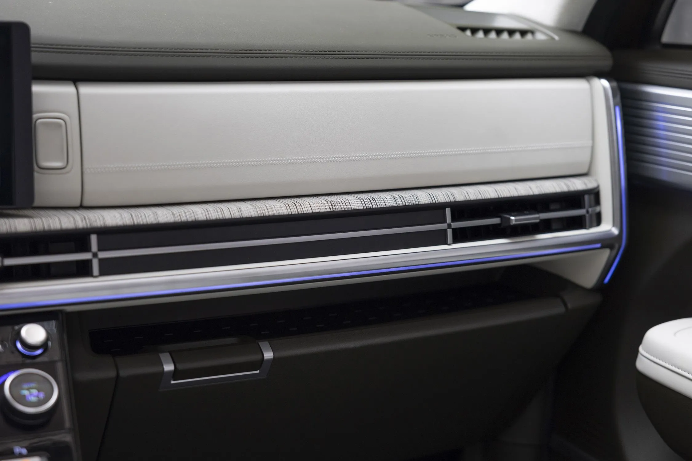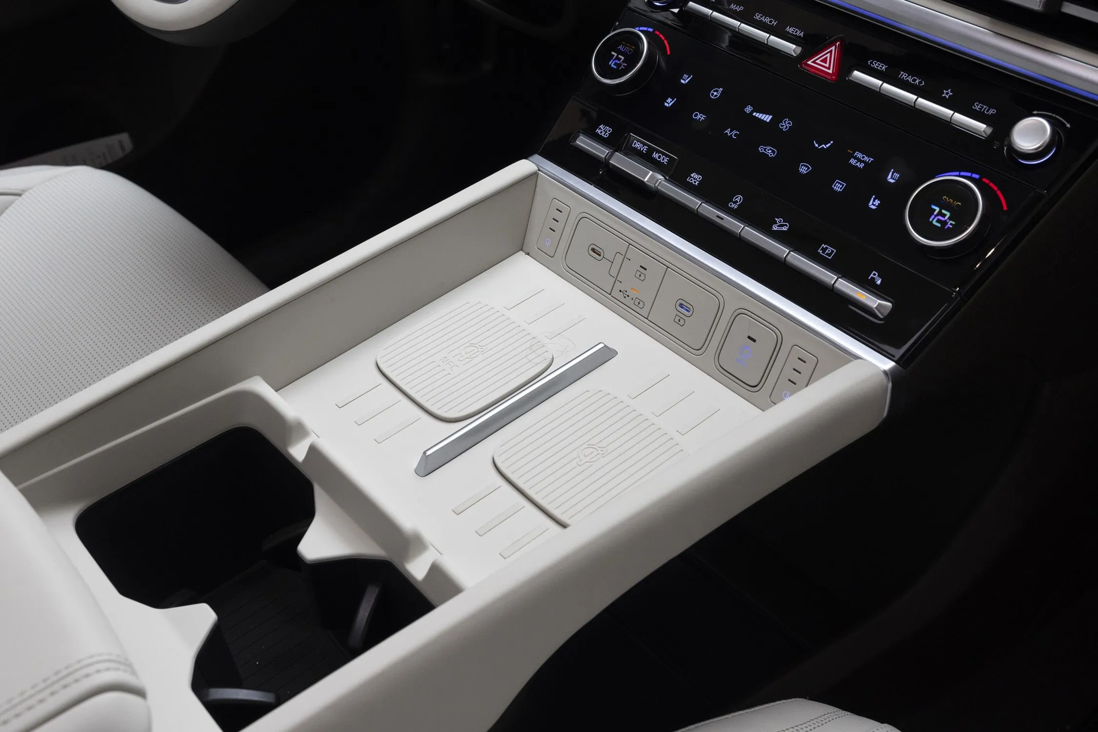 La lista de tecnologías incorporadas es extensa. Tiene cargadores inalámbricos dobles para smartphones (¡adiós, peleas por el cargador!), conectividad inalámbrica para Apple CarPlay y Android Auto, llave digital (usa el celular o reloj para desbloquear y encender el coche) e incluso un compartimento de esterilización UV-C en la guantera para desinfectar pequeños objetos. Es tecnología para no ponerle reparos, quizás un poco exagerada para algunos.