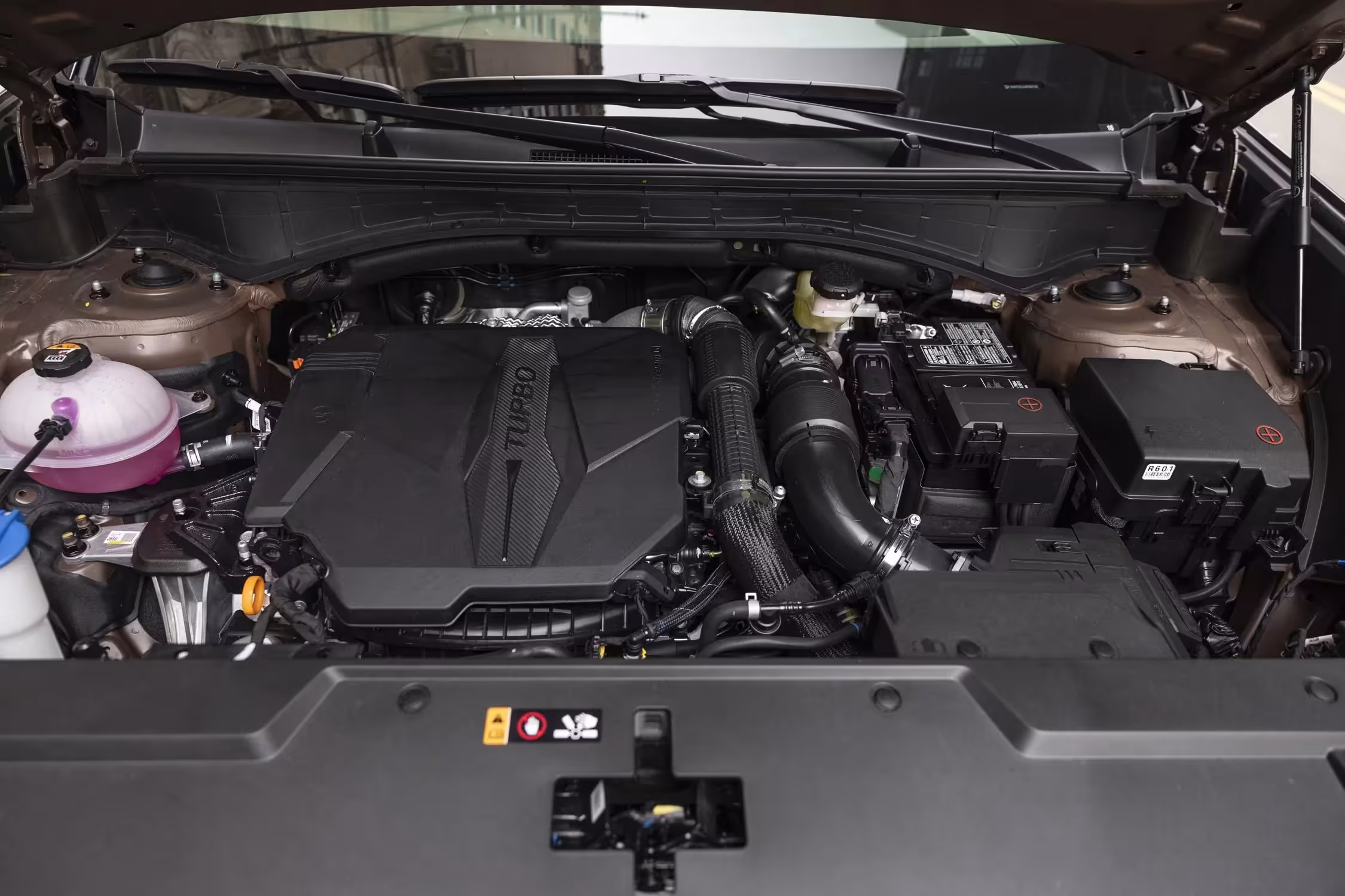 Bajo el capó cuadrado, el Santa Fe 2025 ofrece opciones para diferentes necesidades. El motor principal en muchos mercados es el 2.5L Turbo de cuatro cilindros, que entrega respetables 277 caballos de fuerza y un torque robusto de 422 Nm (aproximadamente 42,8 kgfm). Trabaja con una transmisión automática de doble embrague y 8 velocidades.