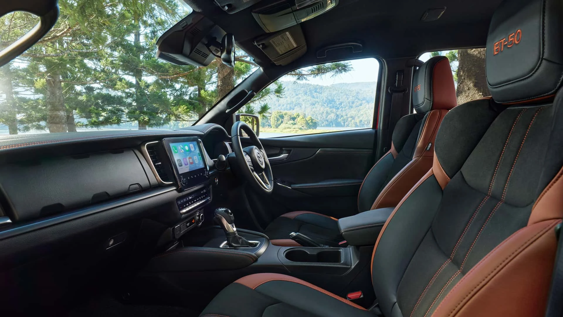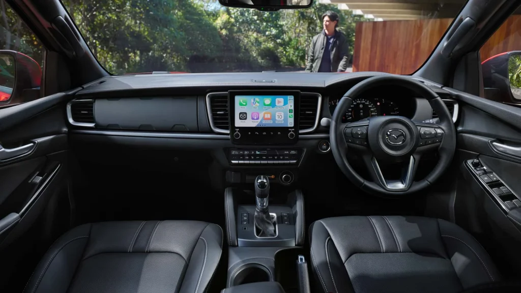 Si el aspecto visual ya impresiona, lo que encontramos en el interior del BT-50 2025 no se queda atrás. Ahora, viene equipado con un nuevo sistema de infotainment de 9 pulgadas que es súper intuitivo. La interfaz incluso tiene botones táctiles que facilitan la navegación, además de los tradicionales botones de volumen y sintonía que siguen siendo muy útiles. También hacemos una transición suave con un display digital de 7 pulgadas, que ahora ofrece información en tiempo real, como la presión de los neumáticos y las condiciones de conducción.