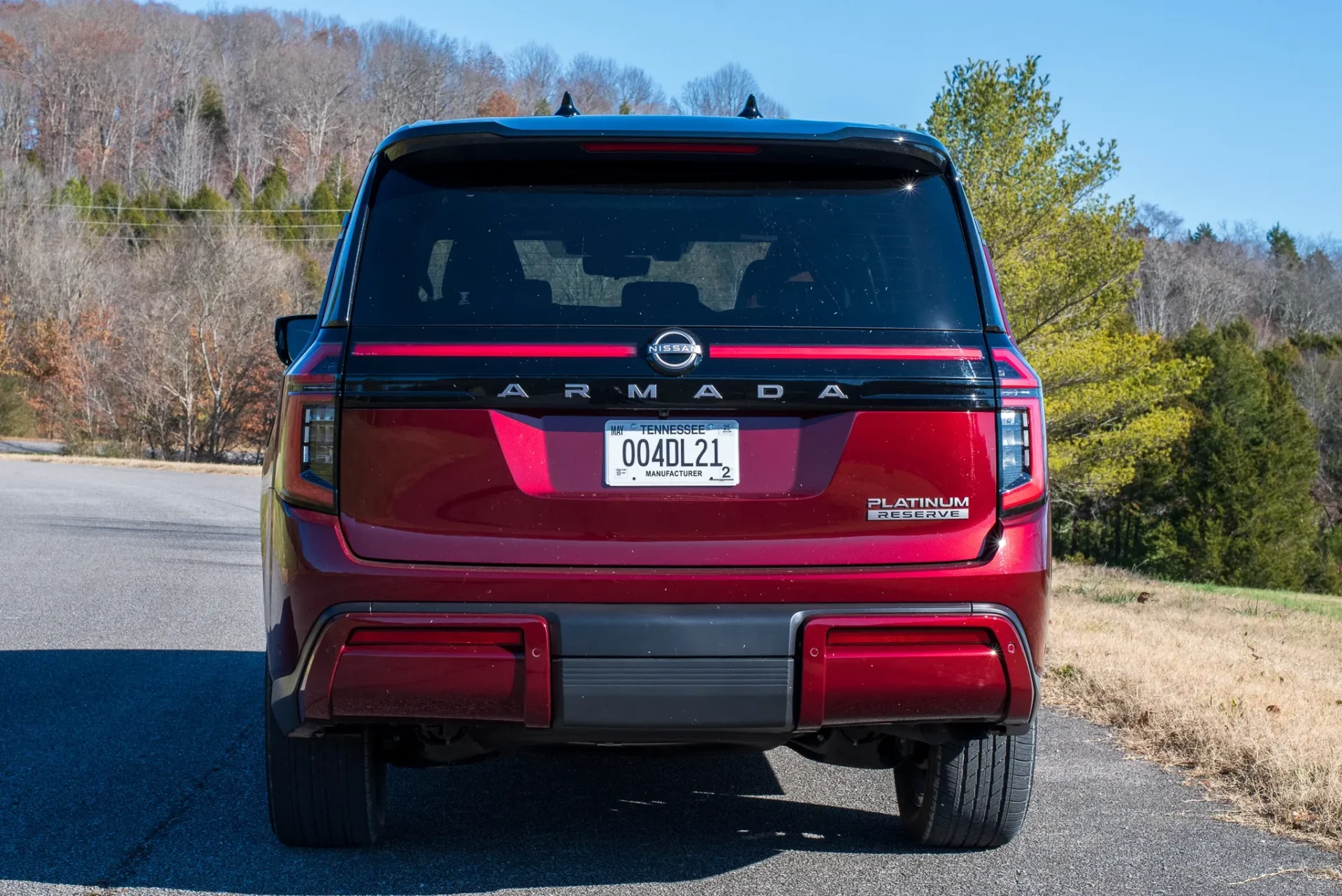 Ya que estamos hablando de un SUV de respeto, el diseño del Armada 2025 tenía que ser impactante, ¿no crees? Mantiene la robustez que ya conocemos, pero con un toque de modernidad y sofisticación. La parrilla frontal es imponente, toda cromada, y los faros LED son afilados, dándole un aire futurista. Y mira este detalle interesante: la línea del techo es «flotante», y en la parte trasera hay una barra de luz LED que conecta las luces traseras. ¡Demasiado elegante!