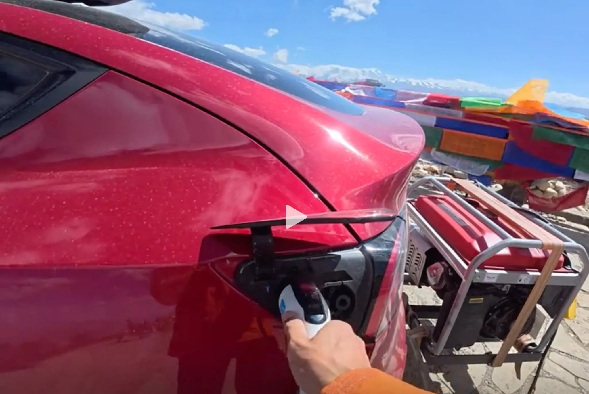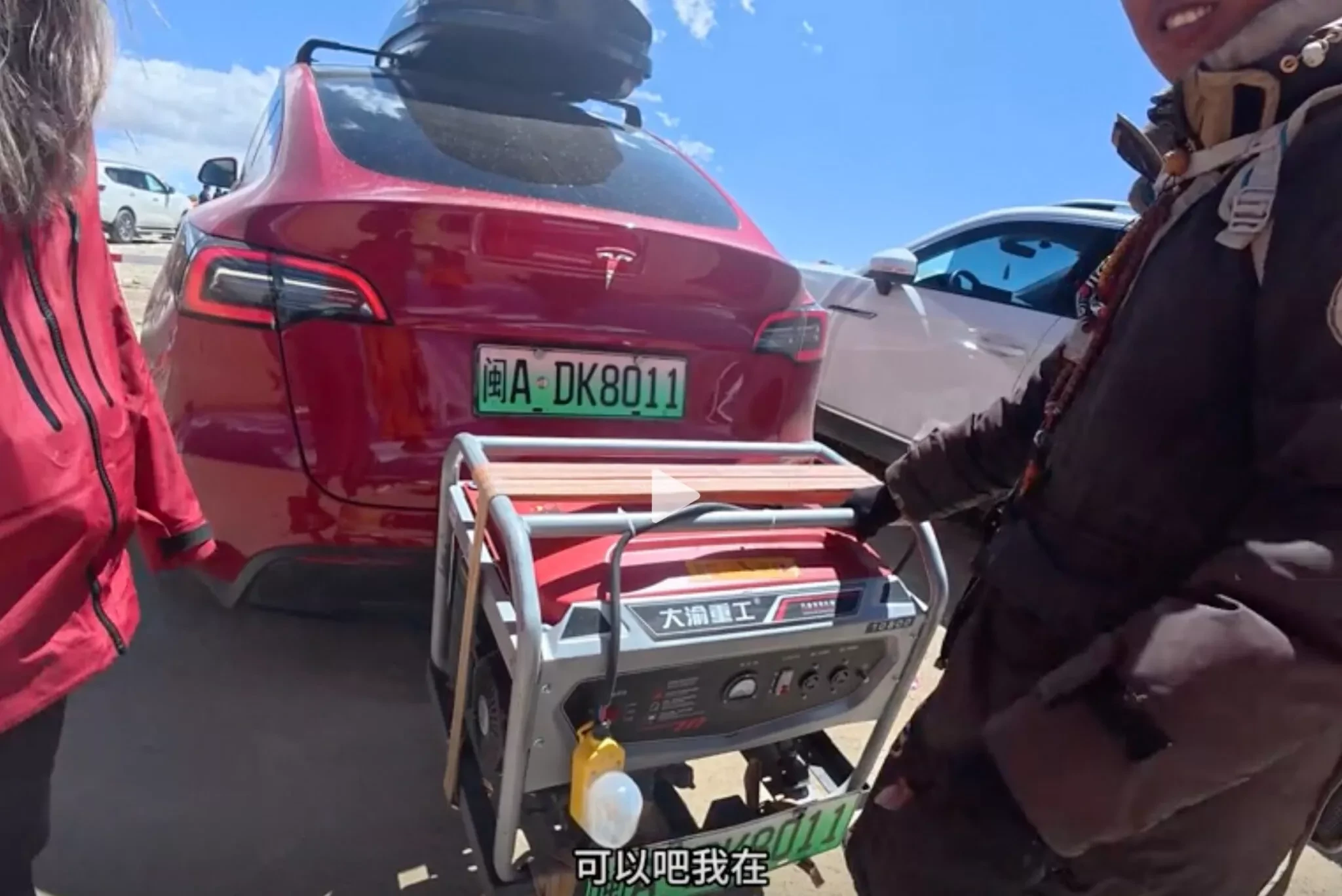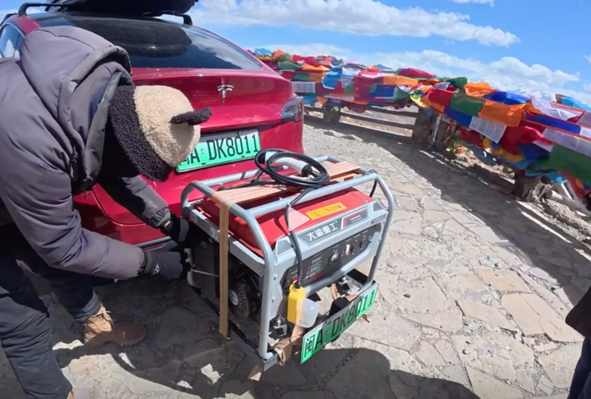El plan del propietario, conocido en las redes sociales como @Xiaomo, fue directo al grano: acopló un generador de gasolina de 3 kW en la parte trasera de su Model Y. No fue una instalación permanente ni totalmente integrada, sino una solución portátil y creativa para una necesidad urgente. Incluso consiguió una placa de matrícula para el generador, asegurando que su invento estuviera «legalizado» para la carretera.
