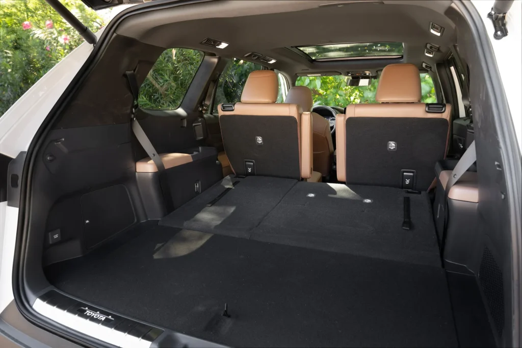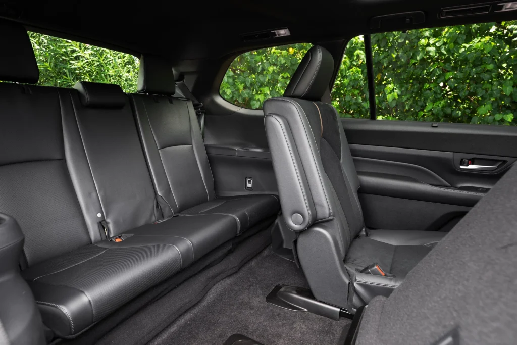 La tercera fila con aproximadamente 85 cm de espacio para las piernas: adultos caben sin problema. Maletero? Entre 584 y 620 litros (20,6–21 pies cúbicos) detrás de la tercera fila; entre 1.635 y 1.645 litros (57,9–58 pies cúbicos) detrás de la segunda; y hasta 2.756 litros (97,5 pies cúbicos) en configuración máxima. Es un número comparable a una “casi minivan”, superando a varios rivales de tres filas en volumen total.