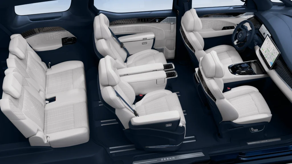 El lujoso y espacioso interior del Volvo EM90 acomoda a seis o siete ocupantes, dependiendo de la configuración de los asientos. El panel minimalista incluye una pantalla táctil de 15 pulgadas para el sistema multimedia, otra de 12,3 pulgadas para el cuadro de instrumentos y una pantalla adicional de 9 pulgadas para el control del aire acondicionado y otras funciones. Con acabados de alta calidad, destacando cuero, madera y aluminio, el EM90 también ofrece un techo panorámico con iluminación ambiental.