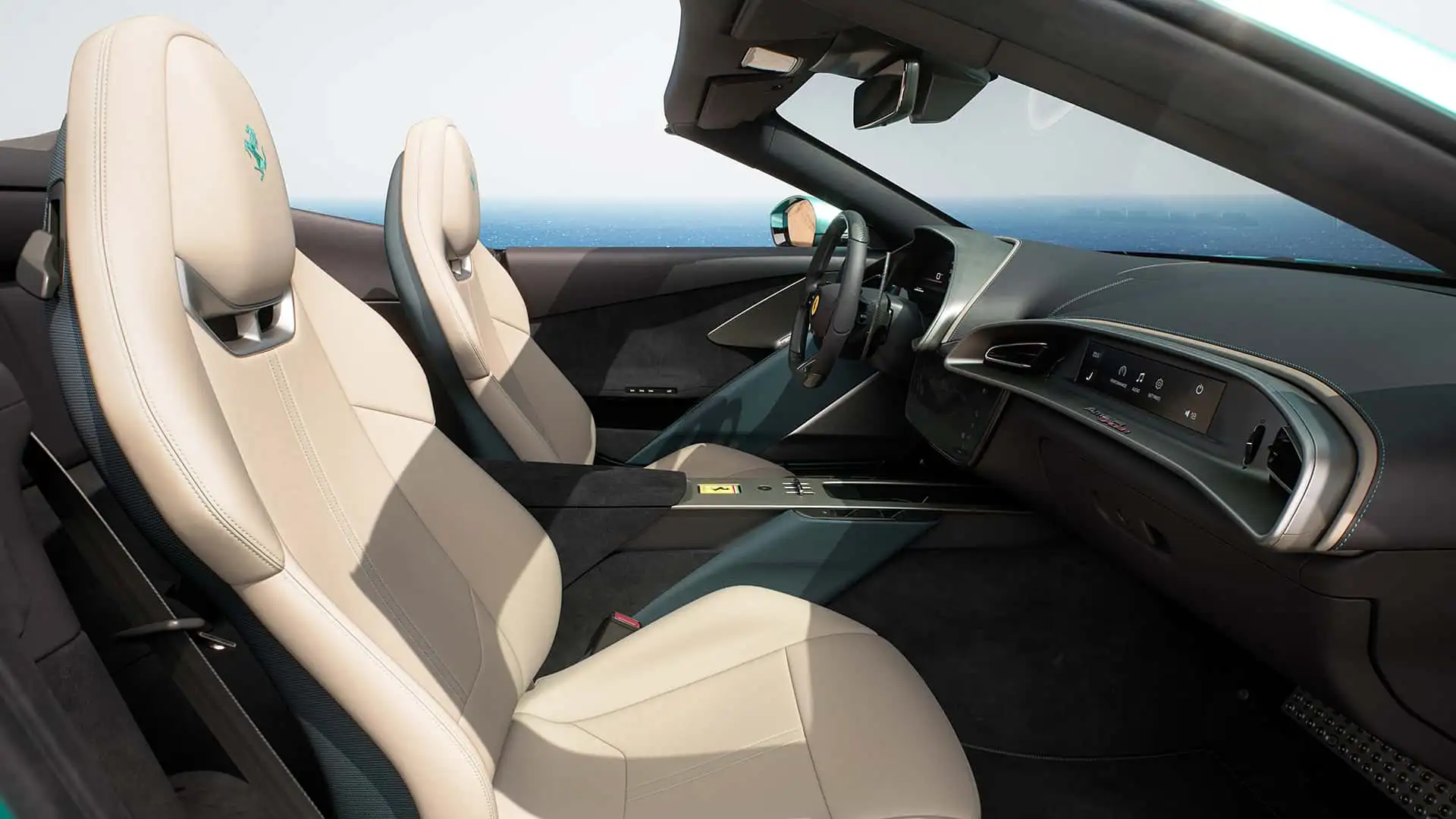 Dentro, a Ferrari resolveu um problema histórico dos conversíveis: turbulência. O defletor de vento integrado ao encosto dos bancos traseiros se ergue com um botão e recolhe com simples pressão manual. É engenharia pensada para quem realmente vai usar o carro, não apenas exibi-lo em concursos de elegância.