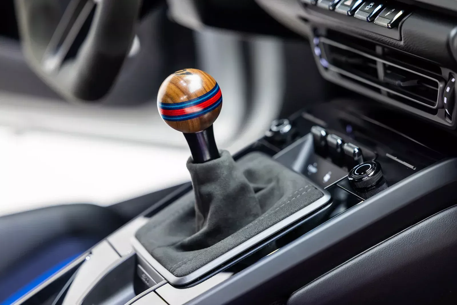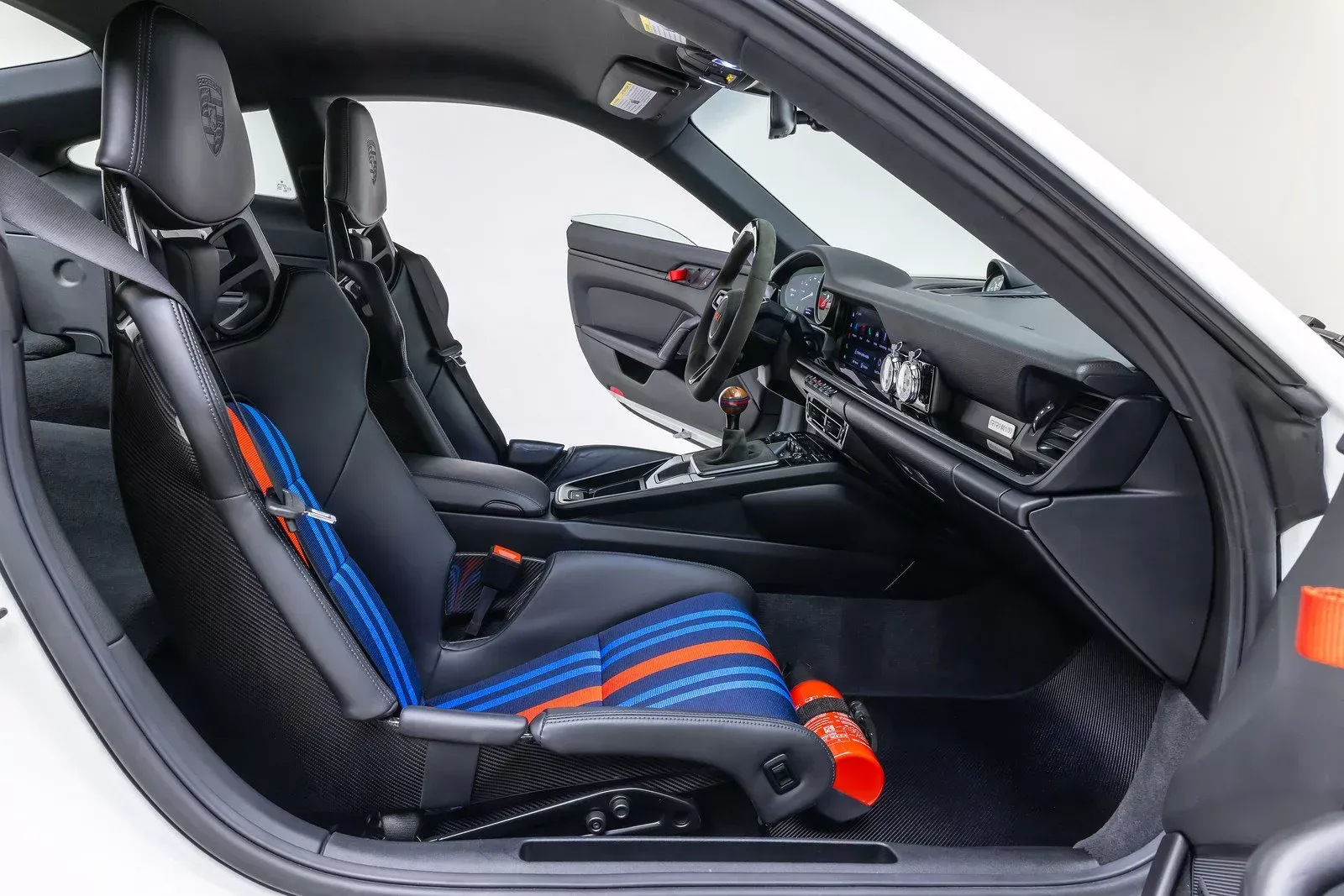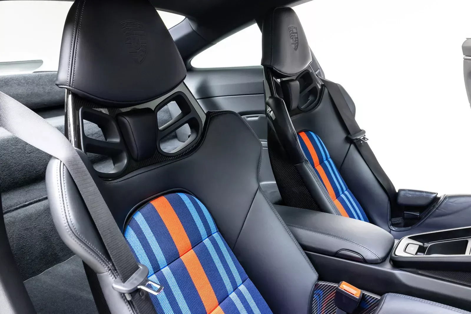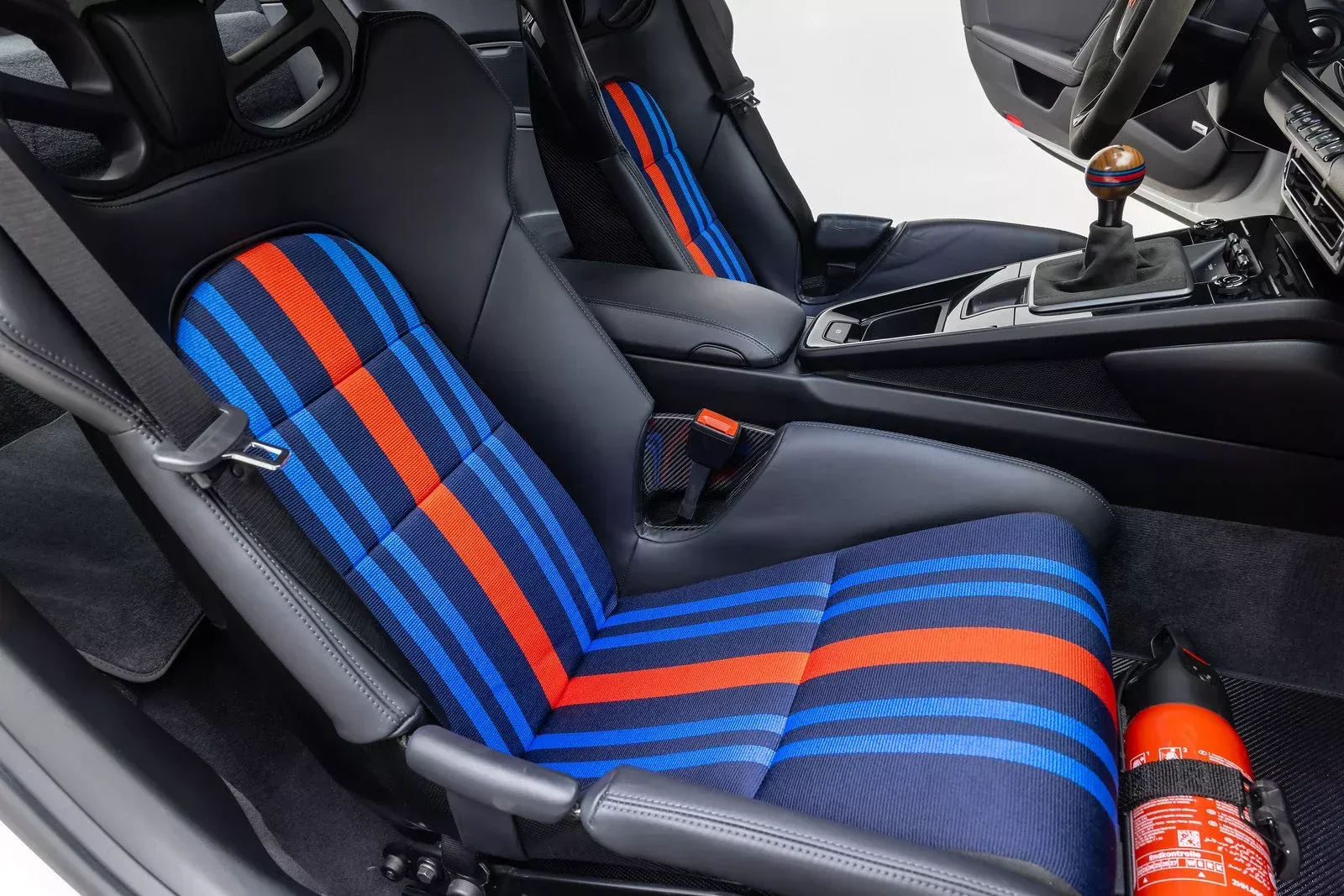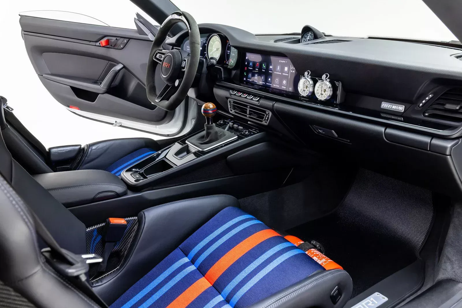 Os bancos trazem novo revestimento em tecido azul e vermelho no centro, uma escolha ousada que foge do clichê all-black. Essa pegada “retro-racer” conversa com o público que valoriza herança e direção sem frufru eletrônico — algo que você vê em Porsches de filosofia purista, inclusive em setups eletrificados de luxo como o Porsche Panamera 4 E‑Hybrid 2025.