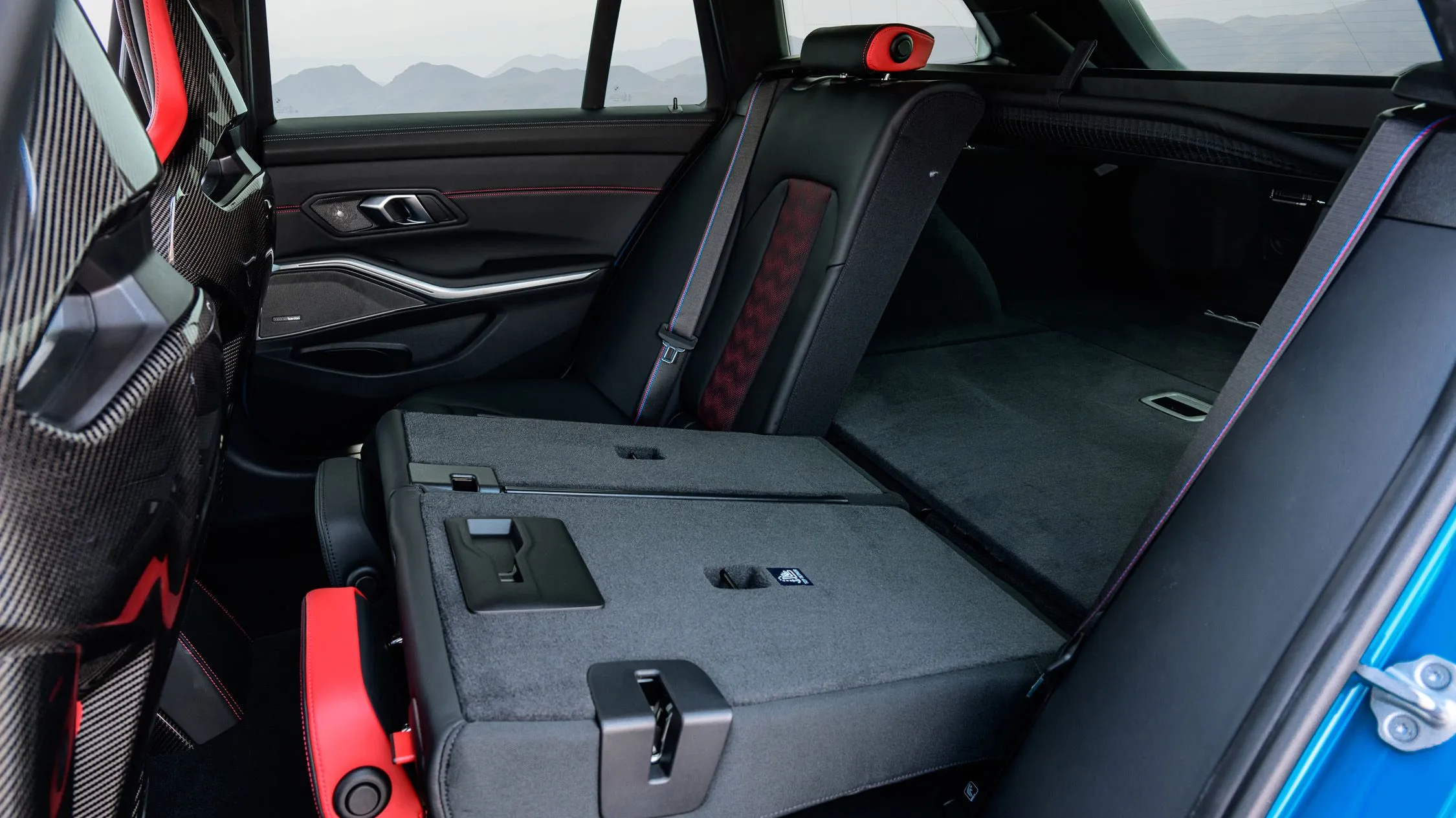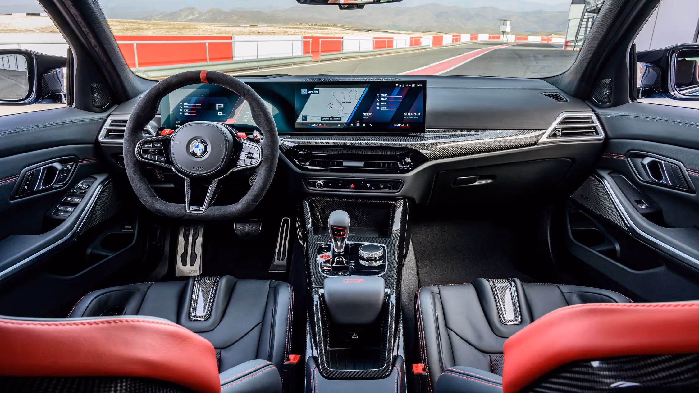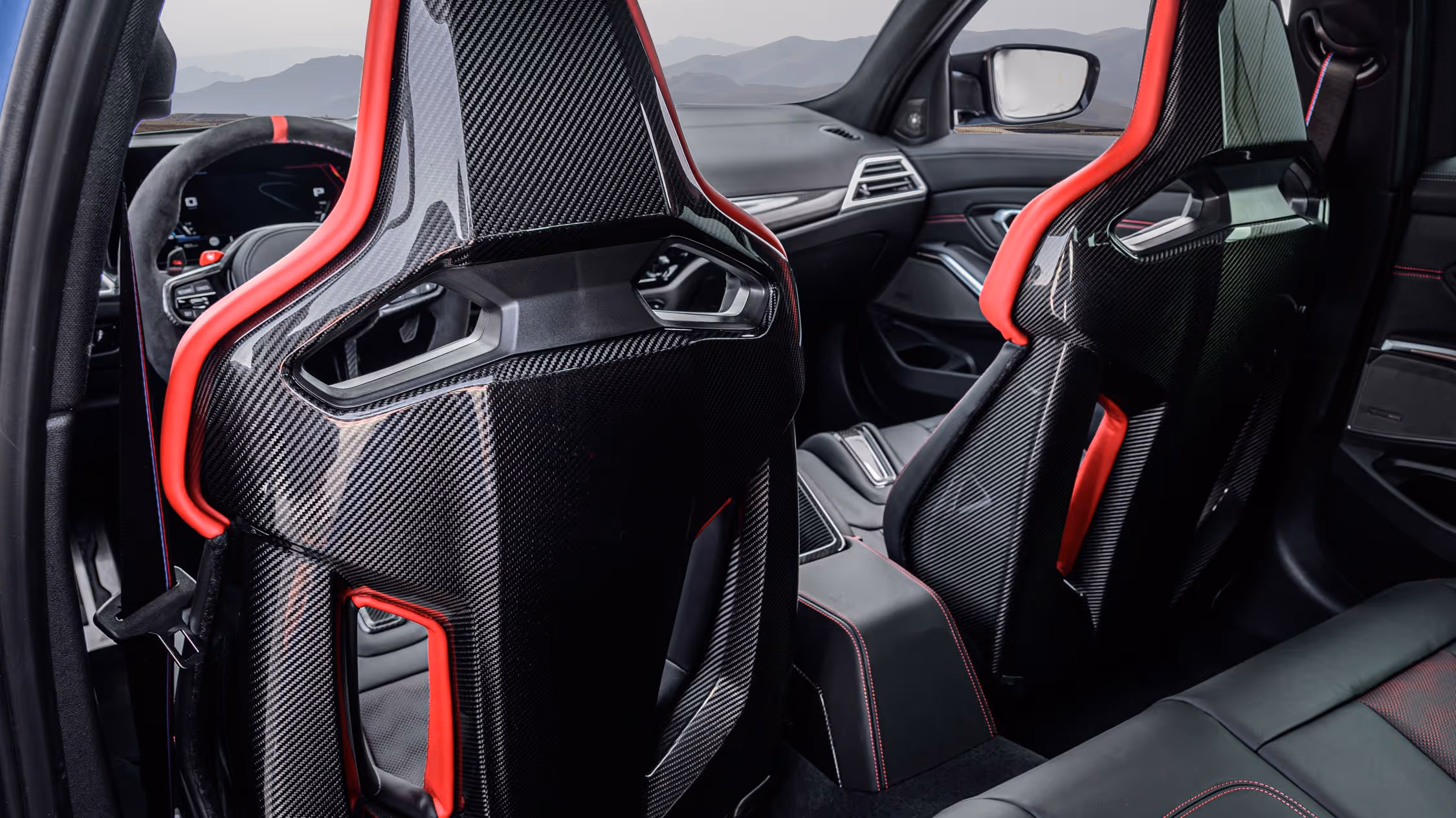 La réduction de poids est stratégique : le capot, le diffuseur arrière et les rétroviseurs sont moulés en fibre de carbone. À l’intérieur, les sièges M Carbon et les détails sur le tableau de bord renforcent la philosophie d’un design léger. L’élimination des composants superflus a permis un gain de 20 kg par rapport à la version Touring conventionnelle.