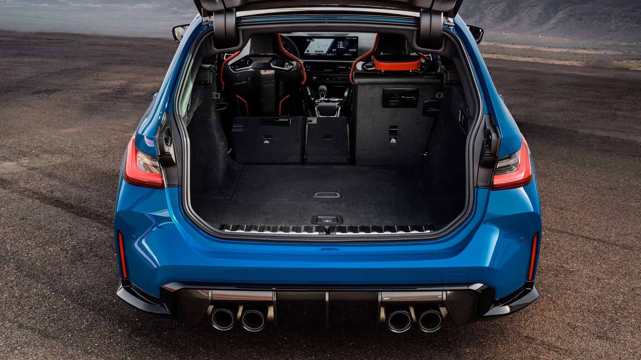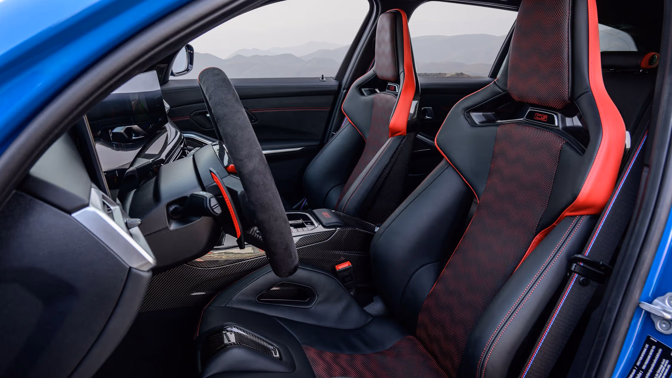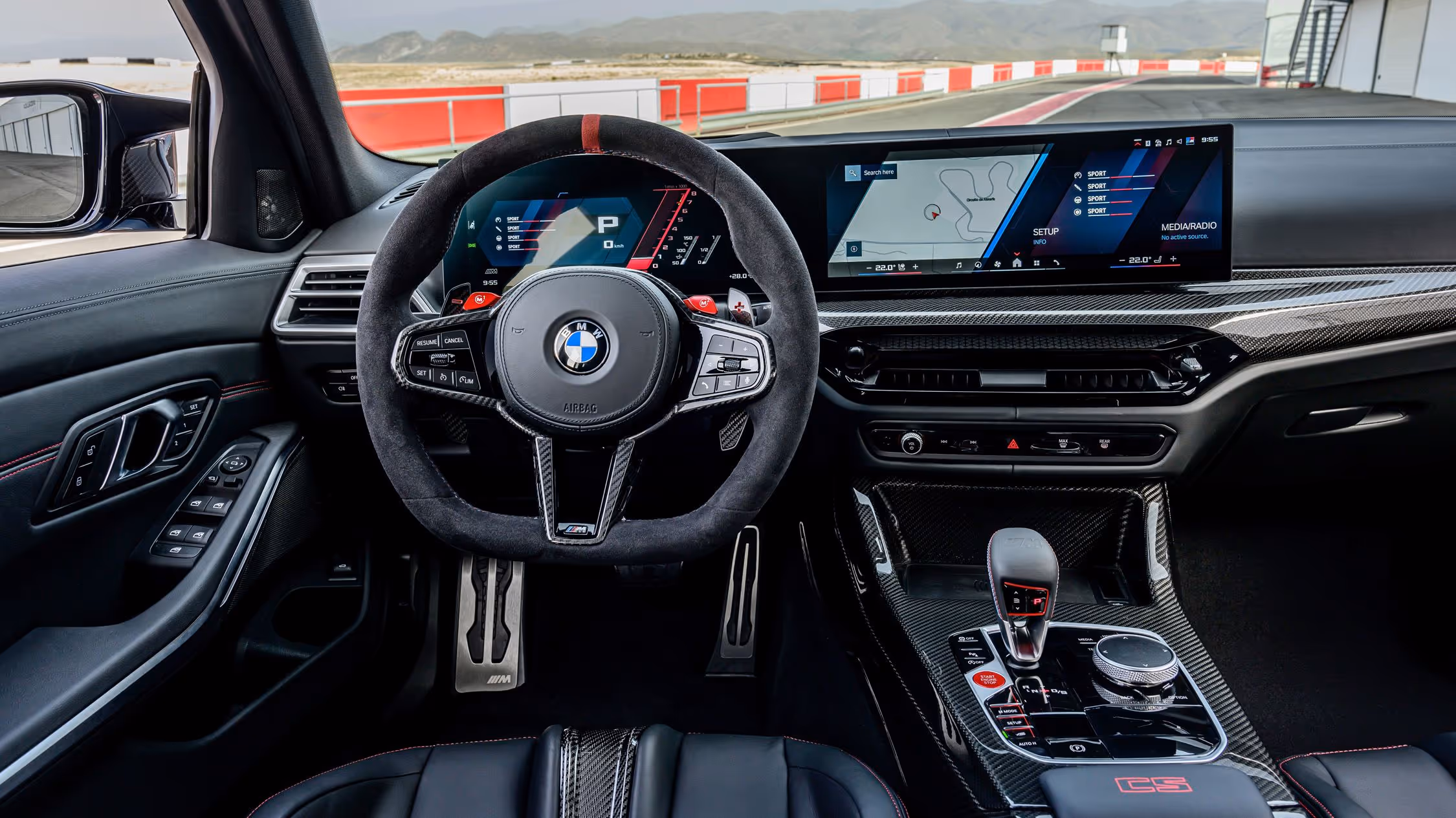 La réduction de poids est stratégique : le capot, le diffuseur arrière et les rétroviseurs sont moulés en fibre de carbone. À l’intérieur, les sièges M Carbon et les détails sur le tableau de bord renforcent la philosophie d’un design léger. L’élimination des composants superflus a permis un gain de 20 kg par rapport à la version Touring conventionnelle.