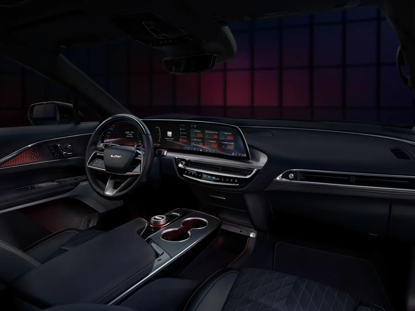 Le Lyriq-V offre des modes de conduite personnalisables, incluant le Velocity Max et le mode Competition. La suspension multilink abaissée et la direction à rapport plus rapide, associées aux freins Brembo et au contrôle continu d’amortissement, garantissent une expérience de conduite dynamique et adaptable à toute situation.