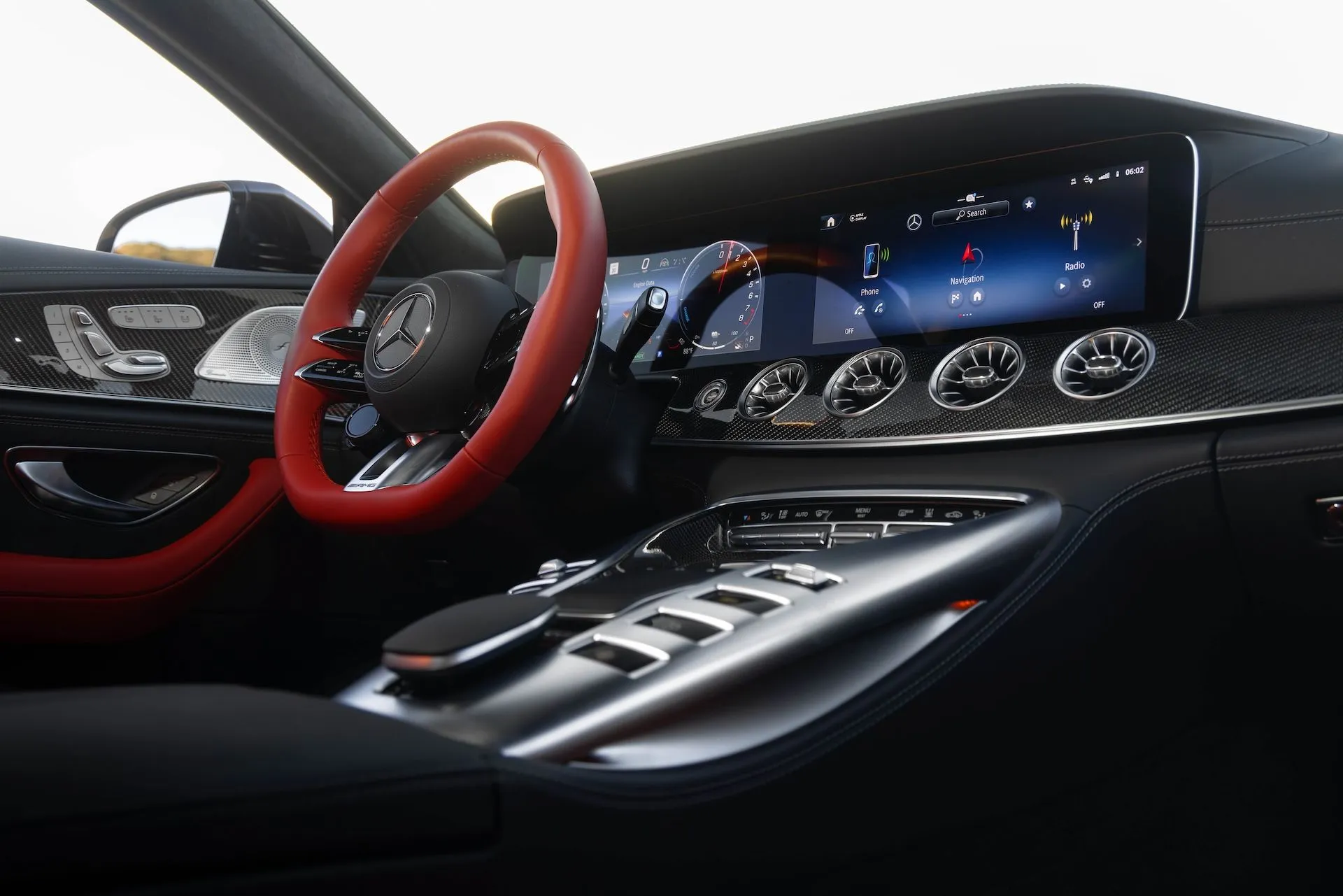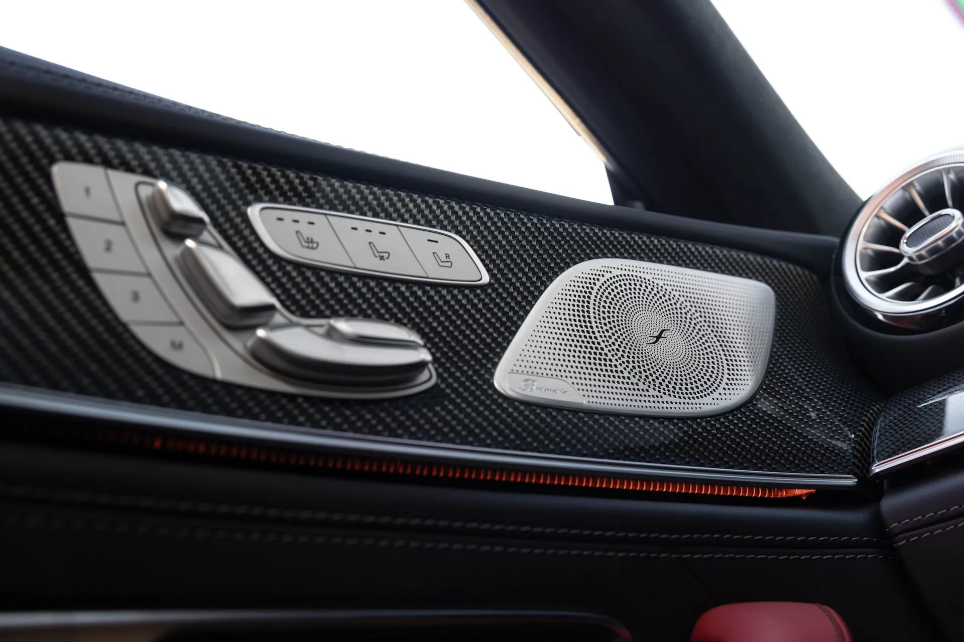 À l’intérieur, la Mercedes-AMG GT 63 S E Performance vous accueille dans un univers mêlant le cockpit d’une voiture de course au luxe d’un jet d’affaires. Le système MBUX intègre des fonctions spécifiques AMG, comme le TRACK PACE, qui transforme la voiture en votre télémetreur personnel. Les matériaux de finition sont un spectacle à part entière, allant du cuir Nappa d’une grande finesse à la fibre de carbone apparente, tout cela personnalisable selon les goûts chanceux du propriétaire.
