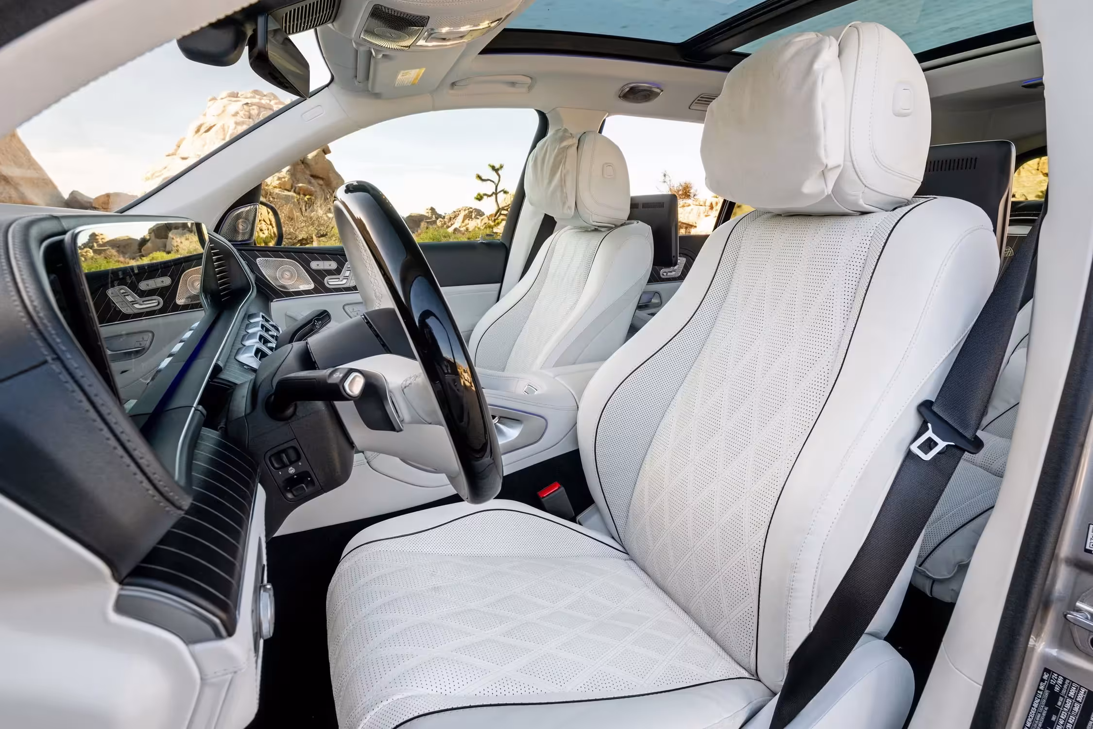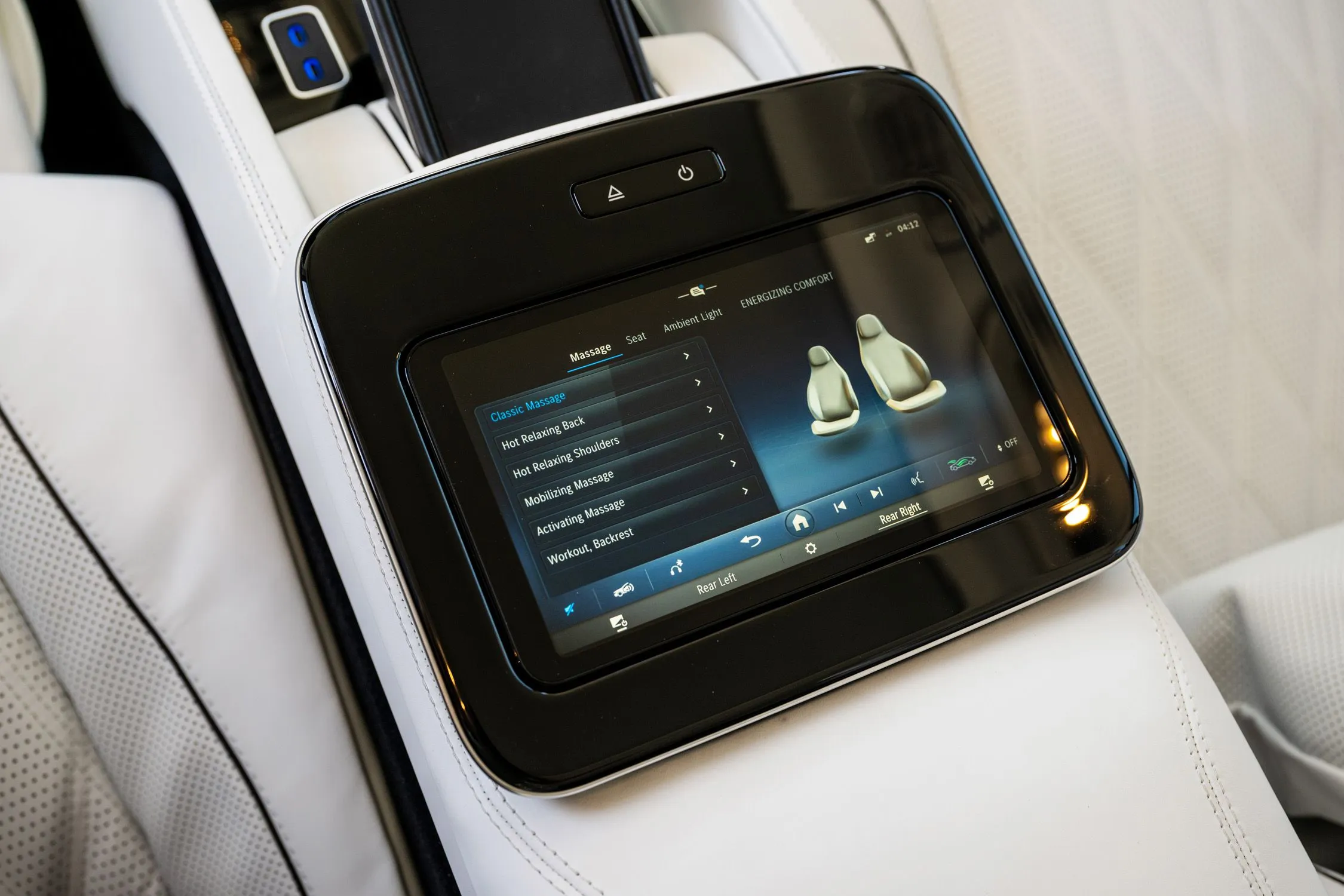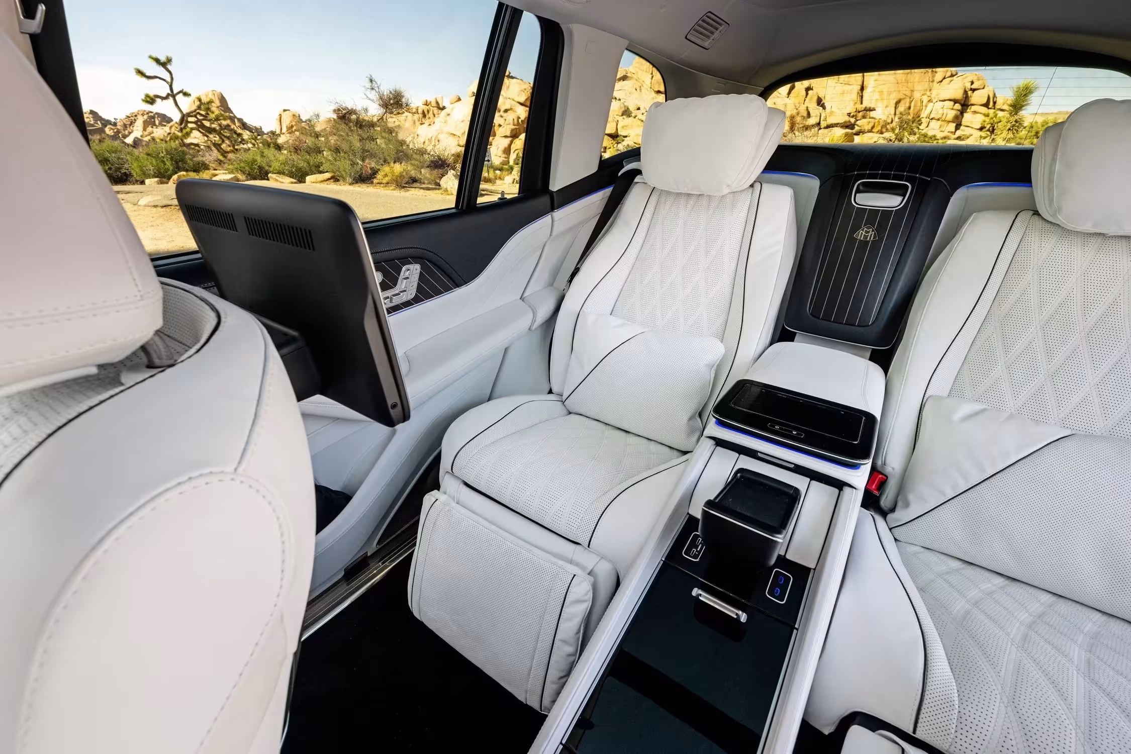 La vraie différence réside dans son intérieur, un sanctuaire de première classe. Les passagers arrière bénéficient de sièges exécutifs avec massage et climatisation, entourés de cuir Nappa, de bois noble et de métaux authentiques. L’expérience est enrichie par une console centrale pouvant inclure des tables pliantes et un réfrigérateur à champagne, tandis que la technologie MBUX avec tablette arrière garantit un contrôle total des commodités du véhicule.