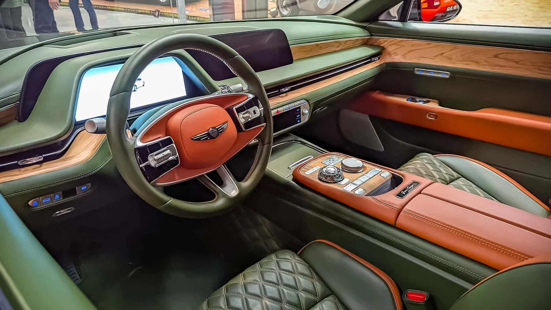 Si l’extérieur est une déclaration, l’intérieur est un sanctuaire. Inspirée par le paysage méditerranéen et la résilience des oliviers, l’habitacle combine du cuir vert olive profond avec du marron cognac chaud. L’innovation la plus significative est l’utilisation de cuir tanné avec des tanins récupérés de la production d’huile d’olive italienne, une méthode qui réduit l’impact environnemental et infuse le matériau d’un récit unique de durabilité et d’artisanat. Cette approche distingue Genesis de ses concurrents, en faisant appel à une nouvelle génération d’acheteurs qui valorisent la provenance et la responsabilité.