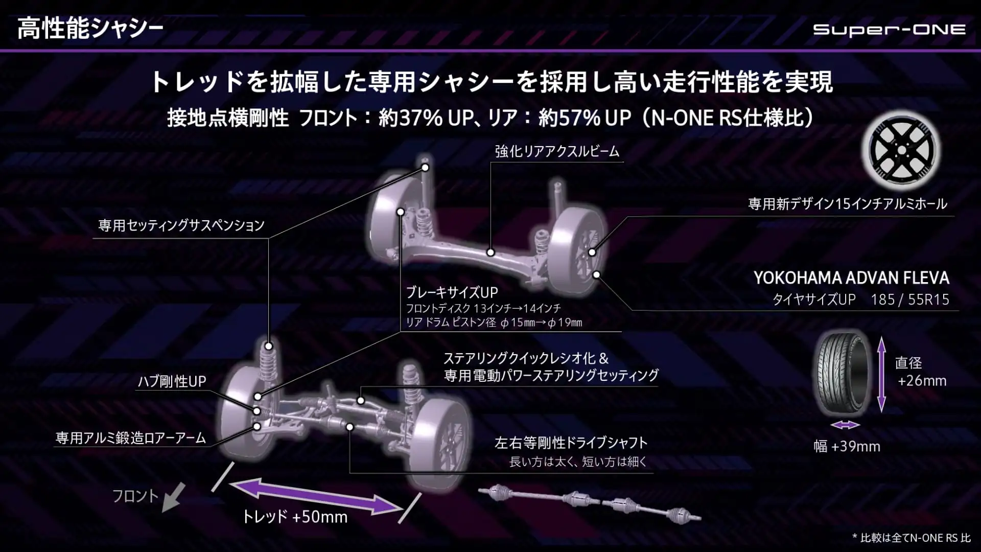 Honda ne s’est pas contenté de rendre le Super-ONE plus léger que de nombreux concurrents. La société a également retravaillé la suspension et la structure de la carrosserie pour abaisser le centre de gravité et affiner le comportement de la voiture dans les transitions rapides. La batterie est montée bas et au centre, aidant la voiture à atteindre un centre de gravité d’environ 520 mm, contre environ 590 mm pour la N-ONE RS.