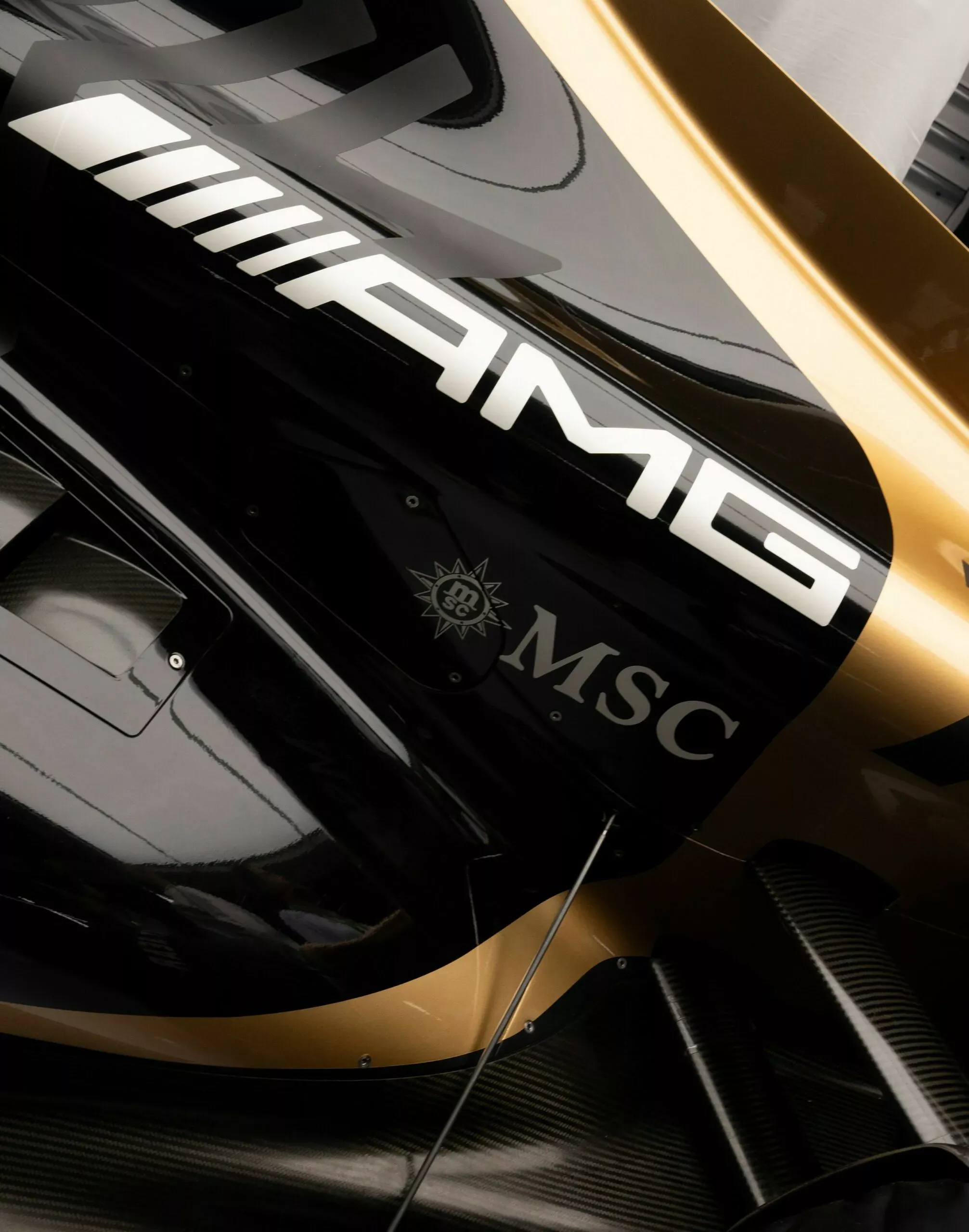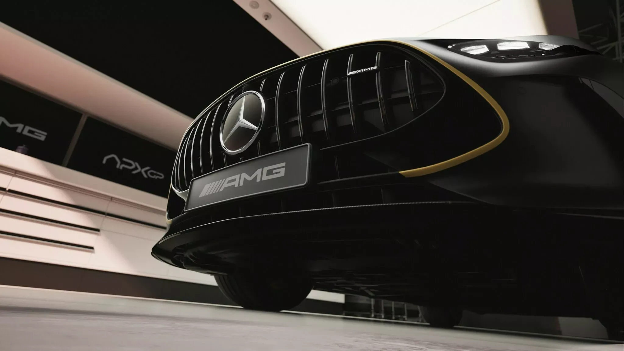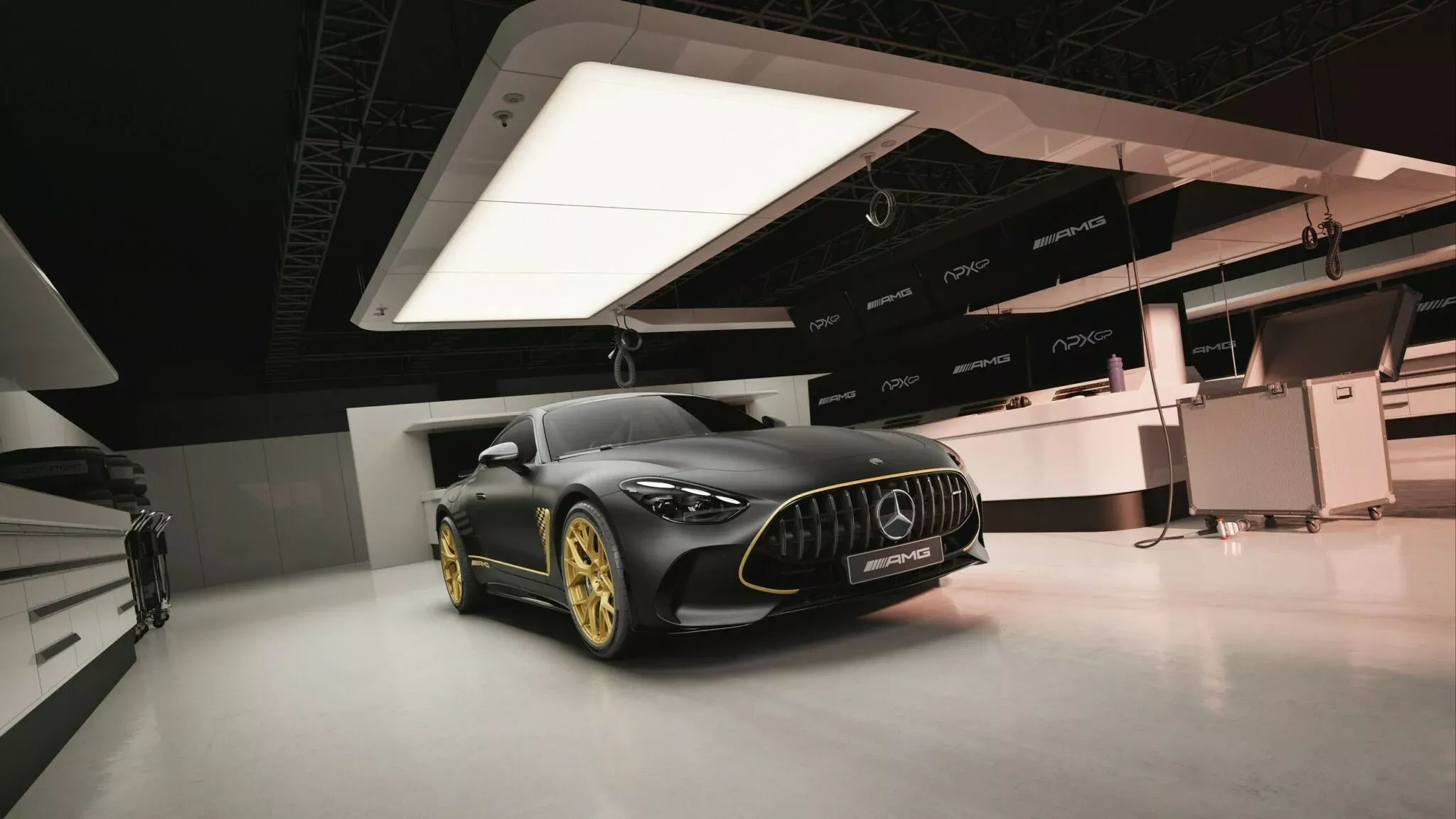 Le principal attrait de cette édition est son lien avec le prochain film sur la Formule 1 mettant en vedette Brad Pitt. Le sigle « APXGP » fait référence à l’équipe fictive du film, et le design de la voiture reflète cette inspiration cinématographique de manière brutale. La peinture est un spectacle à part entière : une base en noir mat (Matte Black) contrastant avec des détails « Race Gold » appliqués à la main. Ces touches dorées ornent les grilles, les bas de caisse, le diffuseur et les prises d’air, conférant un look agressif et sophistiqué.