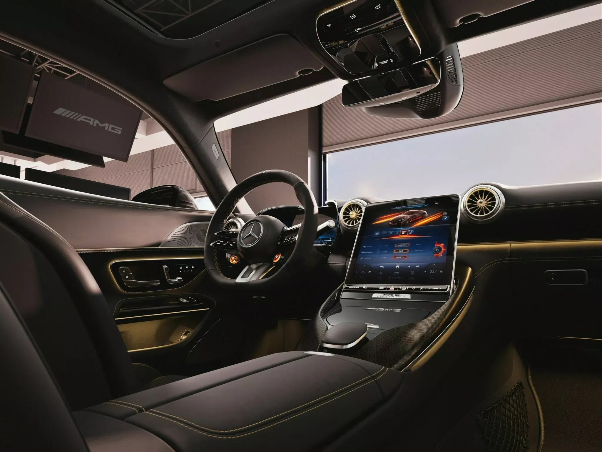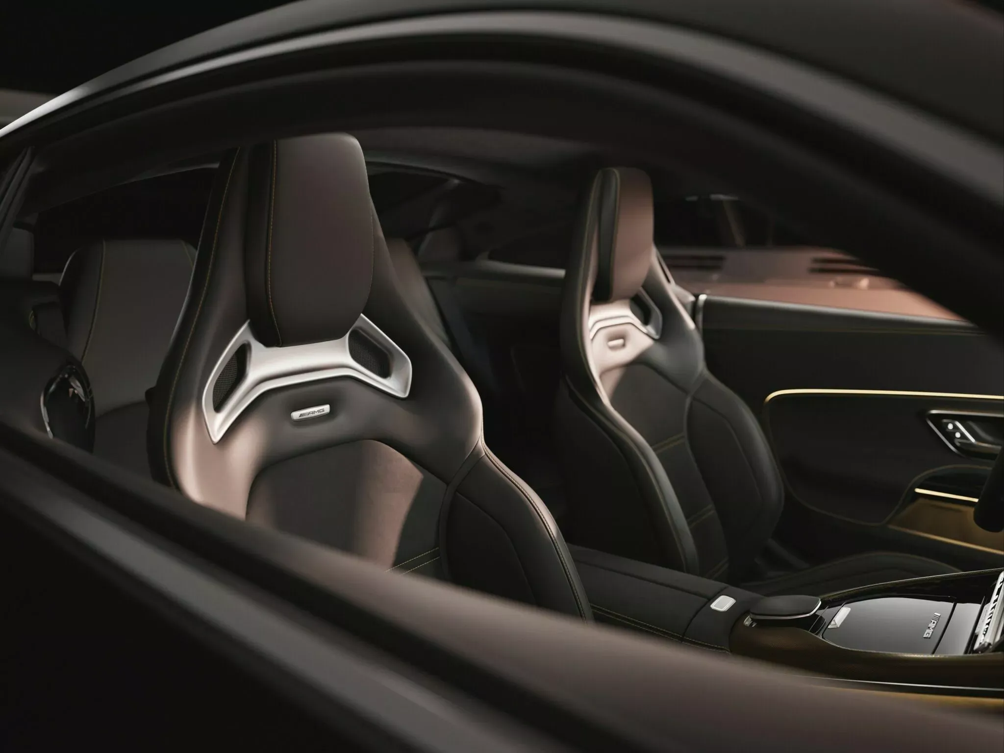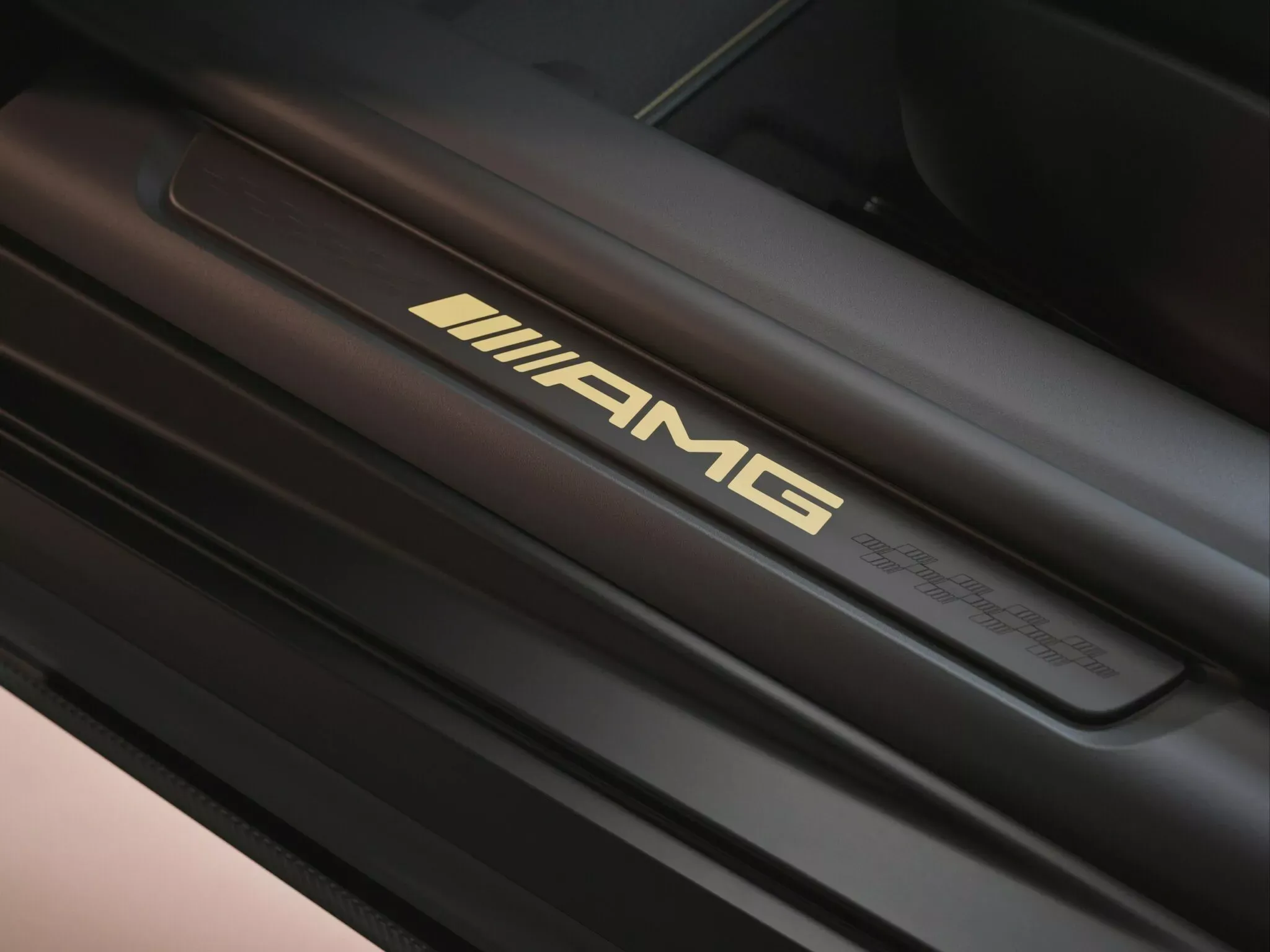 Le traitement spécial continue à l’intérieur. L’habitacle 2+2 (oui, techniquement quatre places, mais les sièges arrière sont plutôt symboliques) reçoit des surpiqûres contrastées dorées sur le volant AMG Performance, les sièges baquets et les panneaux de porte. Des détails en fibre de carbone avec des filaments dorés exclusifs à cette édition rehaussent encore plus la sensation de raffinement et de sportivité.