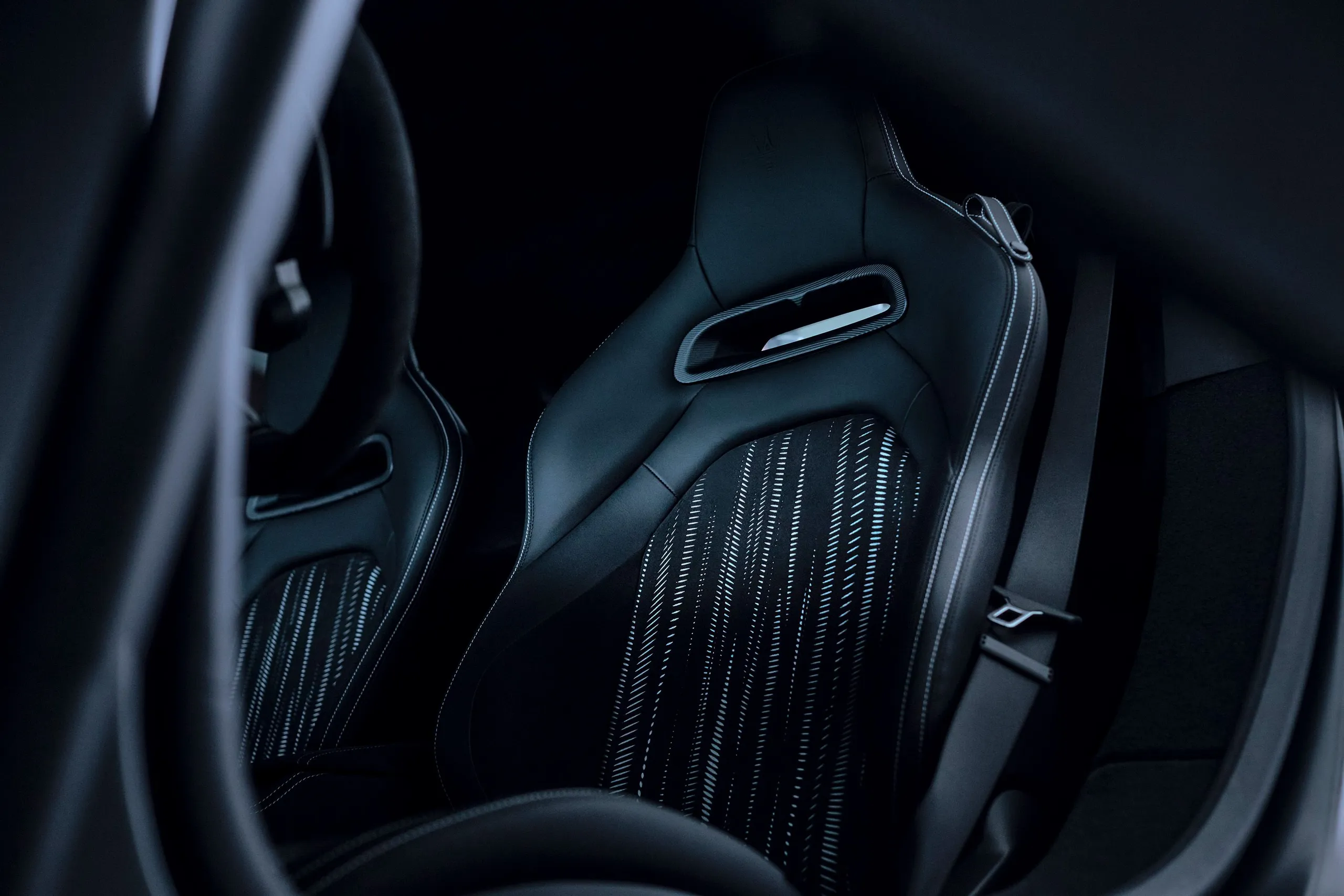 Après avoir passé les portes dièdres façon papillon qui s’ouvrent vers le haut – oui, c’est aussi spectaculaire que cela en a l’air –, vous trouverez un intérieur axé sur le conducteur et, étonnamment, exempt de gadgets et de fonctionnalités superflus. Le design général est épuré et minimaliste, avec une console centrale en fibre de carbone qui abrite uniquement les commandes essentielles, y compris le sélecteur de mode de conduite. C’est un environnement qui vous enveloppe, vous invite à piloter, et non à vous perdre dans mille boutons.