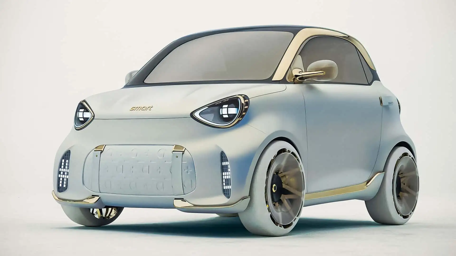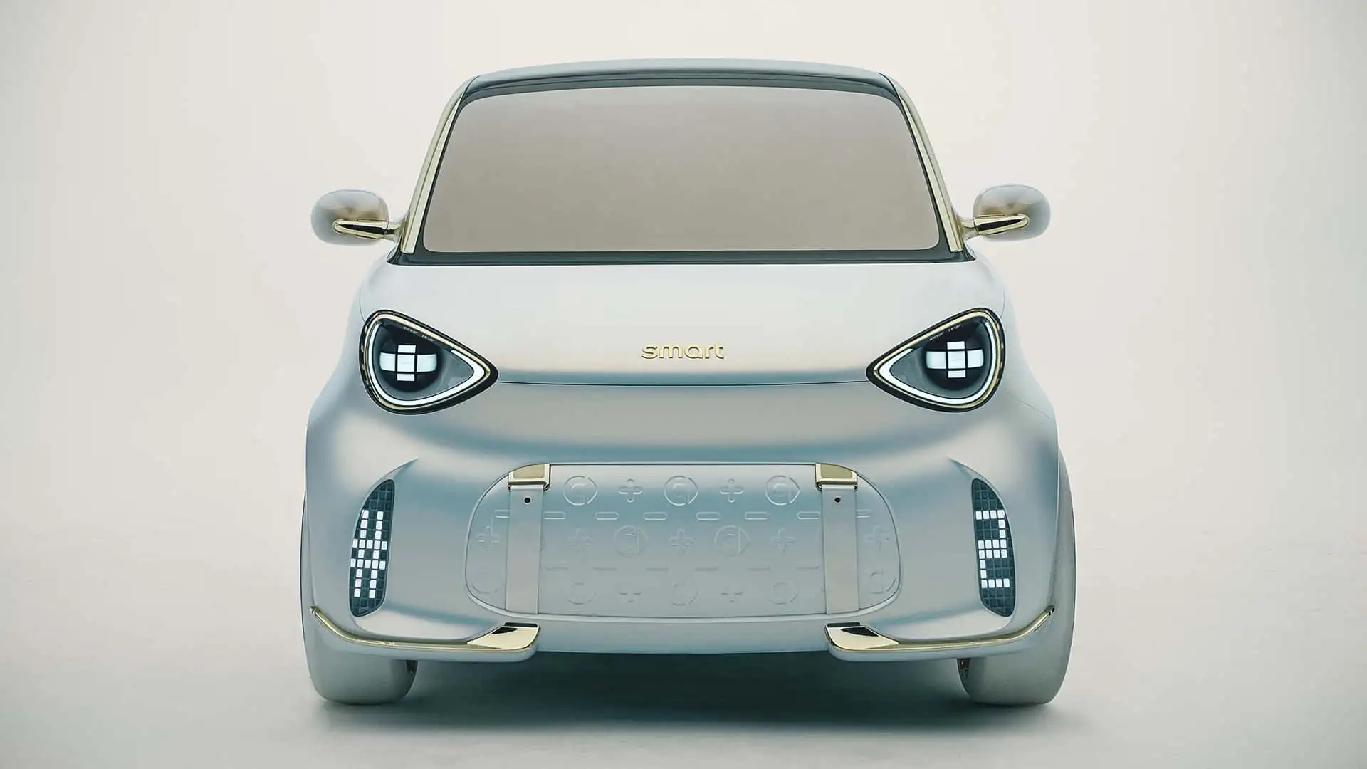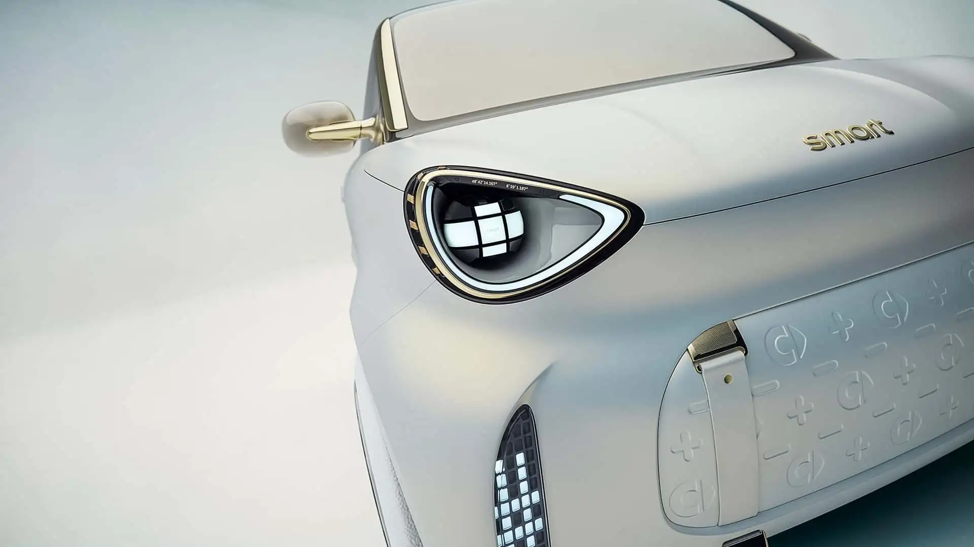 Mercedes est responsable du design, et on le voit dans la rigueur des formes. Le concept ajoute quelques éléments volontairement exagérés, dont des touches dorées et des roues surdimensionnées, mais l’architecture sous-jacente est honnête. C’est une vraie microcar à une époque où beaucoup de prétendus petits VE font déjà la taille d’anciennes citadines compactes. C’est important, car l’empreinte est l’avantage décisif de la Smart #2.