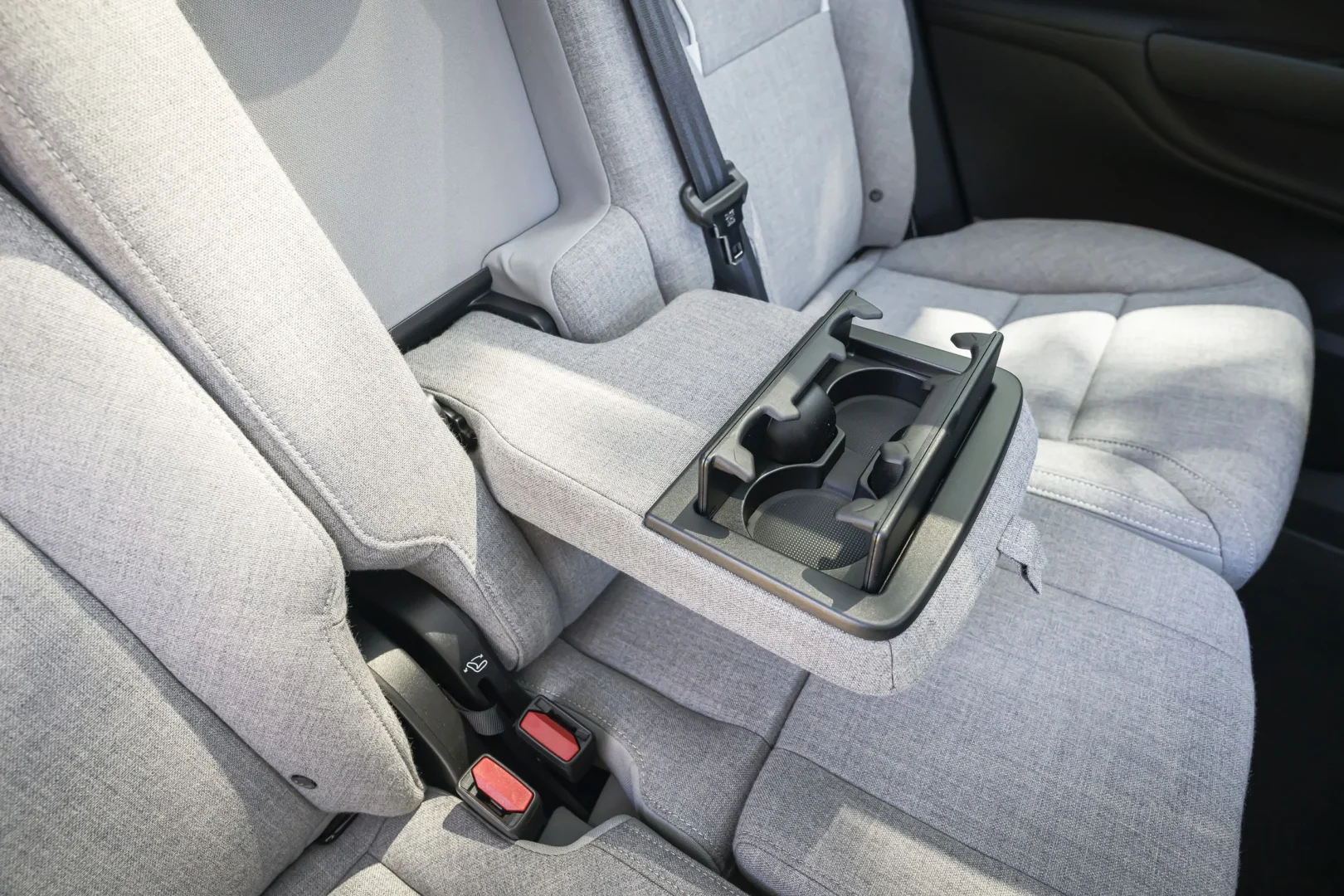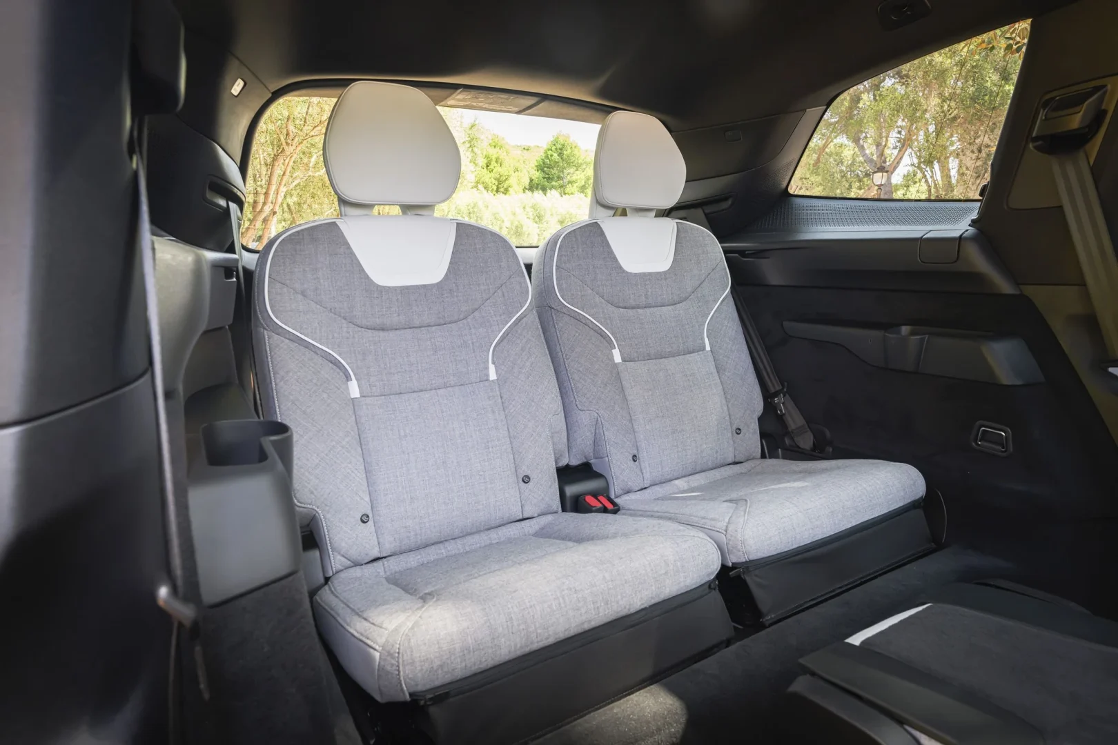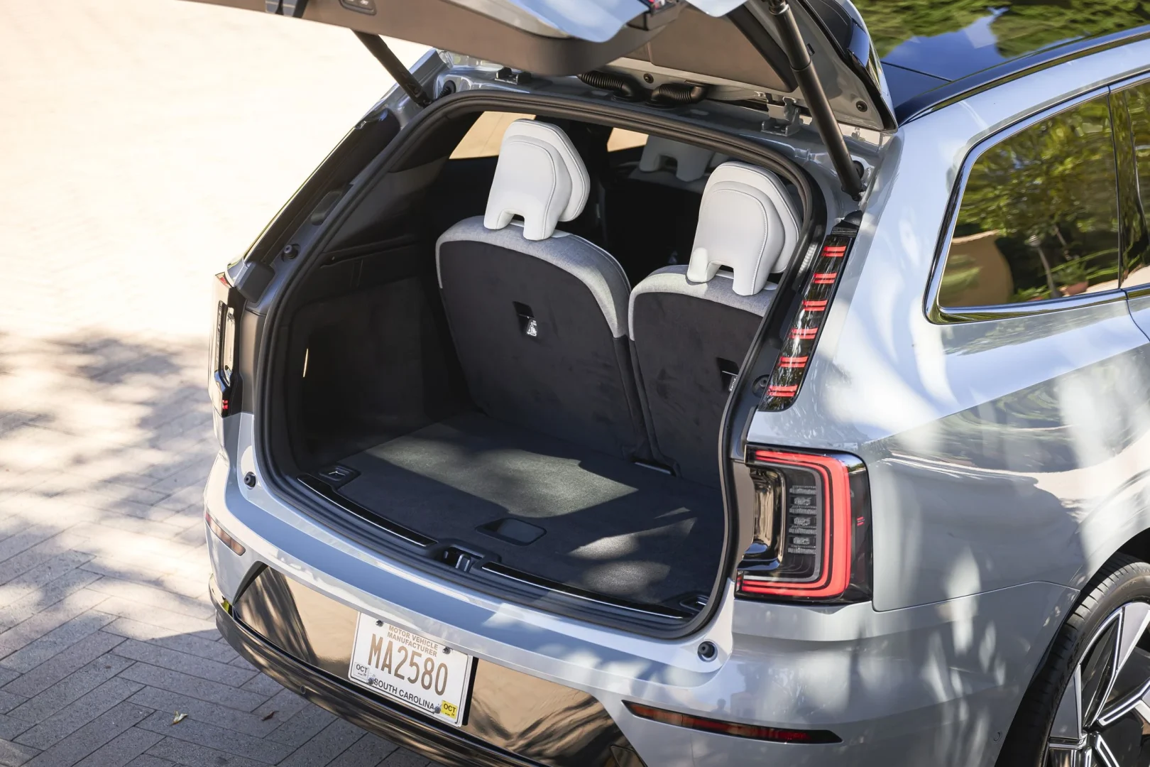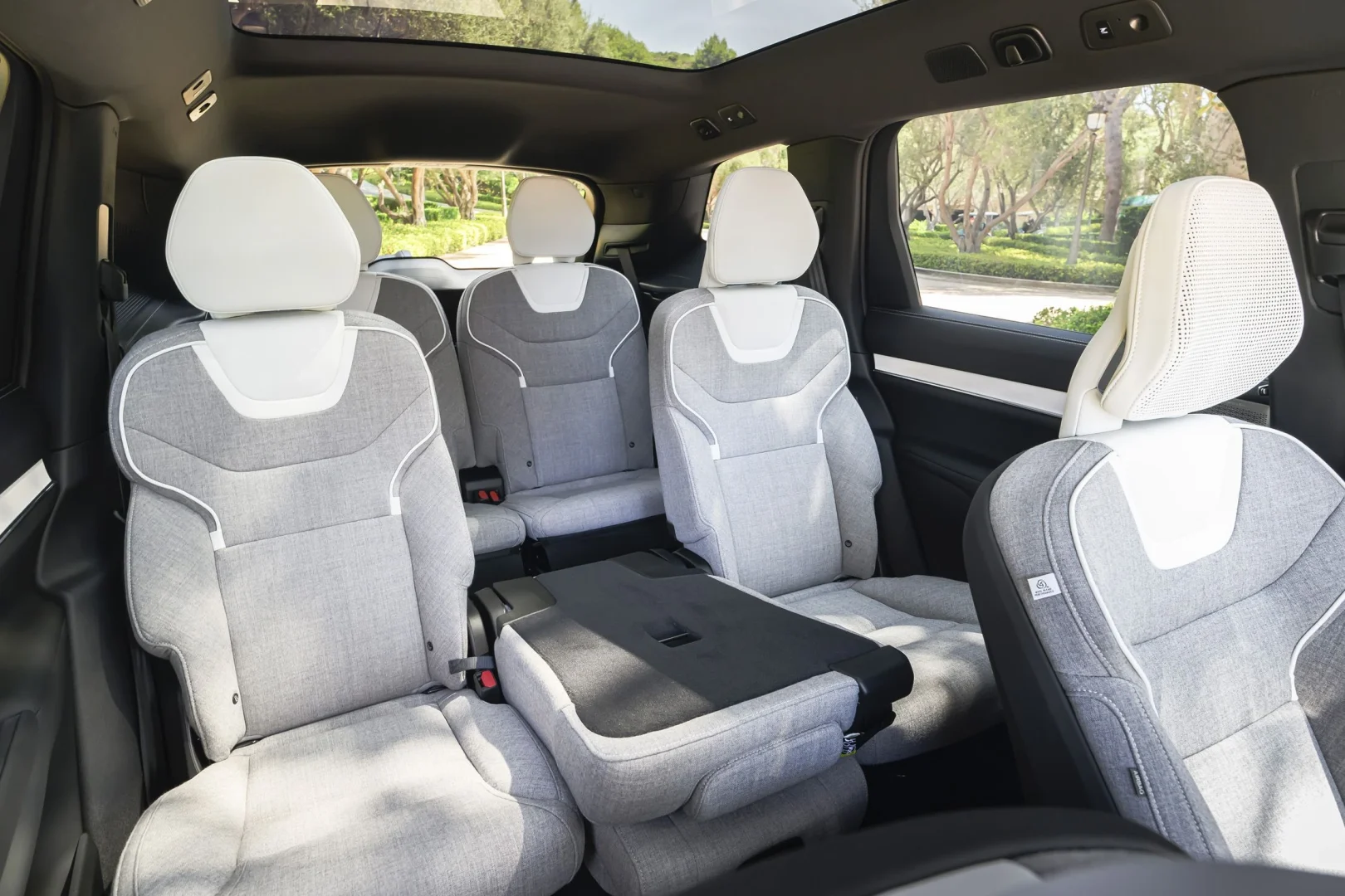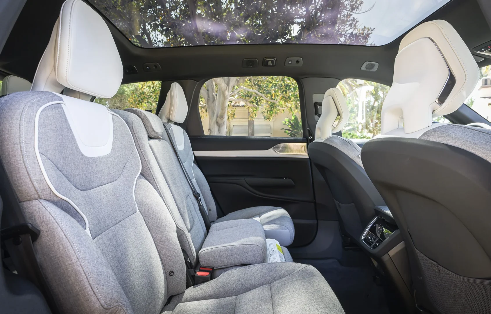 À l’intérieur, le Volvo EX90 2025 ne déçoit pas. L’intérieur est entièrement pensé pour créer une atmosphère agréable et confortable, avec un agencement minimaliste qui met en avant un immense écran d’infodivertissement. Les matériaux utilisés, comme le tissu en laine mélangé à des plastiques recyclés, montrent la préoccupation de Volvo pour la durabilité. L’espace est également très généreux, pouvant accueillir jusqu’à sept passagers, parfait pour ceux qui ont une grande famille ou aiment voyager avec des amis.