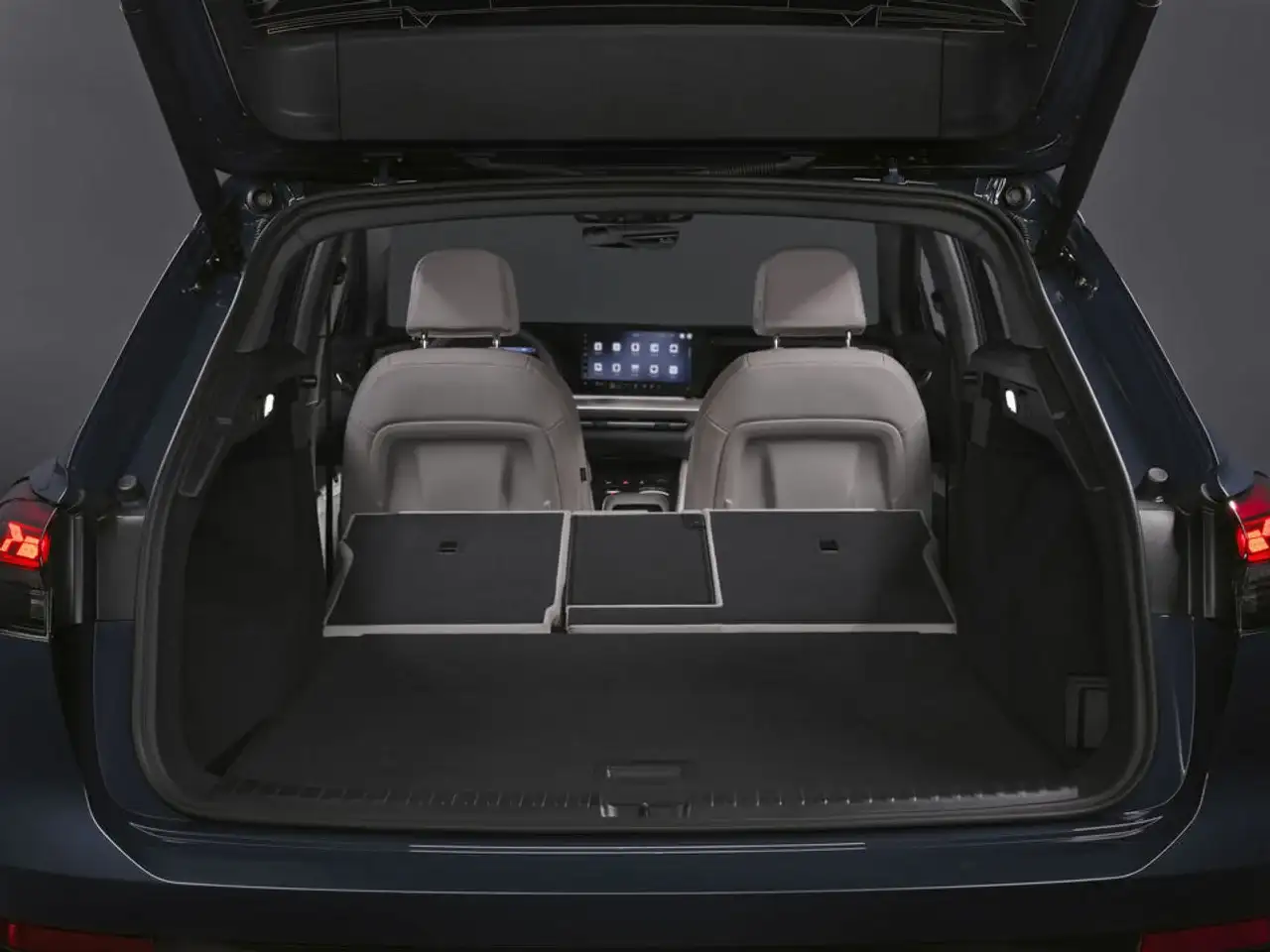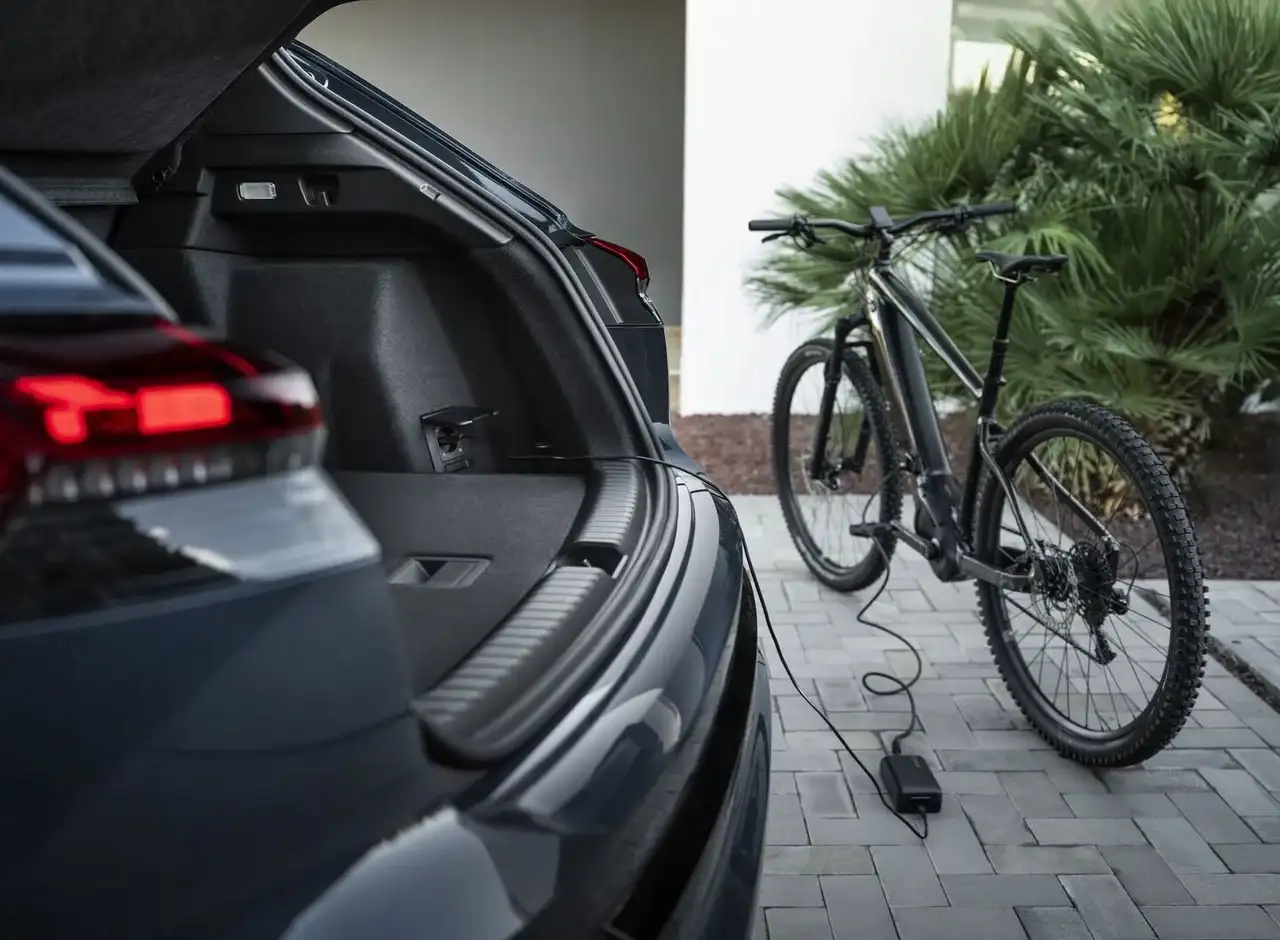 Untuk pertama kalinya pada model produksi Audi, Q4 e-tron mendukung Vehicle-to-Load (V2L). Stopkontak 230V di bagasi menyediakan output 2,3 kW, sementara adaptor port pengisian membuka hingga 3,6 kW—cukup untuk menjalankan perkakas listrik, perlengkapan berkemah, atau peralatan rumah tangga darurat. Di Jerman dan beberapa pasar Eropa terpilih, fungsi Vehicle-to-Home (V2H) memungkinkan baterai 82 kWh berfungsi sebagai penyangga energi di rumah, beroperasi di antara 20% dan 80% state of charge. Energi saat pengosongan ditampilkan pada kluster instrumen. Langkah ini menempatkan Q4 e-tron sebagai platform energi yang benar-benar serbaguna, bukan sekadar alat transportasi.