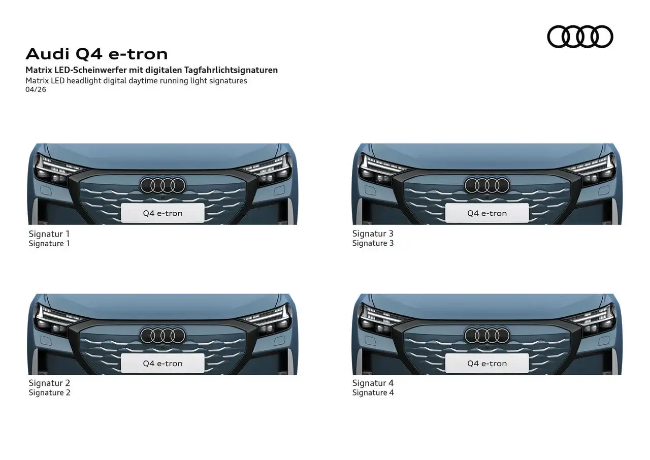 Secara tampilan luar, Q4 e-tron mempertahankan overhang yang pendek dan posisi kaki yang lebar. S line mendapatkan bilah matte perak selenit untuk tampilan yang lebih sporty. Pencahayaan menjadi sorotan: lampu belakang digital OLED generasi kedua dengan 284 segmen dapat menampilkan empat tanda cahaya yang berbeda, dan sistem peringatan kedekatan menyalakan lampu saat kendaraan yang mengikuti mendekat terlalu dekat. Di dalam kabin, sebuah layar panorama mengintegrasikan klaster instrumen berukuran 11,9 inci dan layar sentuh MMI 12,8 inci dalam tata letak yang berorientasi pada pengemudi. Head-up display augmented reality opsional memproyeksikan navigasi dan perintah ADAS ke bidang pandang virtual seluas 70 inci. Volume bagasi 515 liter (1.487 dengan kursi dilipat), dan kapasitas penarik mencapai 1.800 kg.