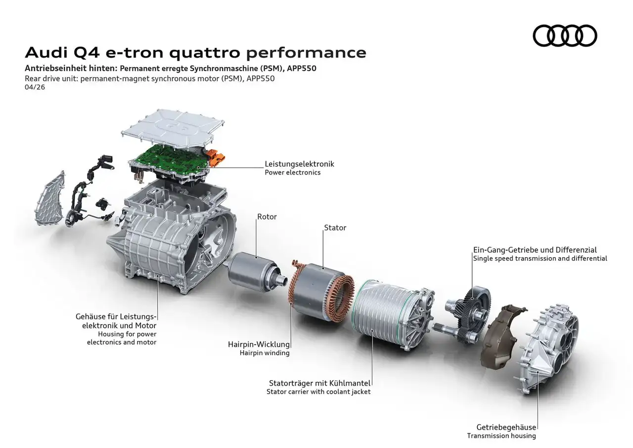 Peningkatan mekanis utama adalah motor listrik APP350, yang memakai silicon carbide (SiC) pulse inverter untuk mengurangi rugi switching dan meningkatkan efisiensi sebesar 10%. Oli transmisi dengan viskositas rendah juga mengurangi gesekan, sehingga menambah hingga 12 km jarak tempuh dalam kondisi dingin. Peningkatan jarak tempuh total dibanding model sebelum facelift adalah 30 km untuk versi penggerak roda belakang dan 32 km untuk model quattro. Baterai 82 kWh (kapasitas yang dapat digunakan) kini mendukung pengisian cepat DC puncak hingga 185 kW. Pengisian tambahan 10-80% hanya membutuhkan 27 menit, dan berhenti selama 10 menit menghasilkan hingga 185 km jarak tempuh berkendara. Ini membuat Q4 e-tron setara dengan para pesaing seperti BYD Denza D9 dalam hal kecepatan pengisian—metrik penting untuk kebutuhan mobilitas jarak jauh.