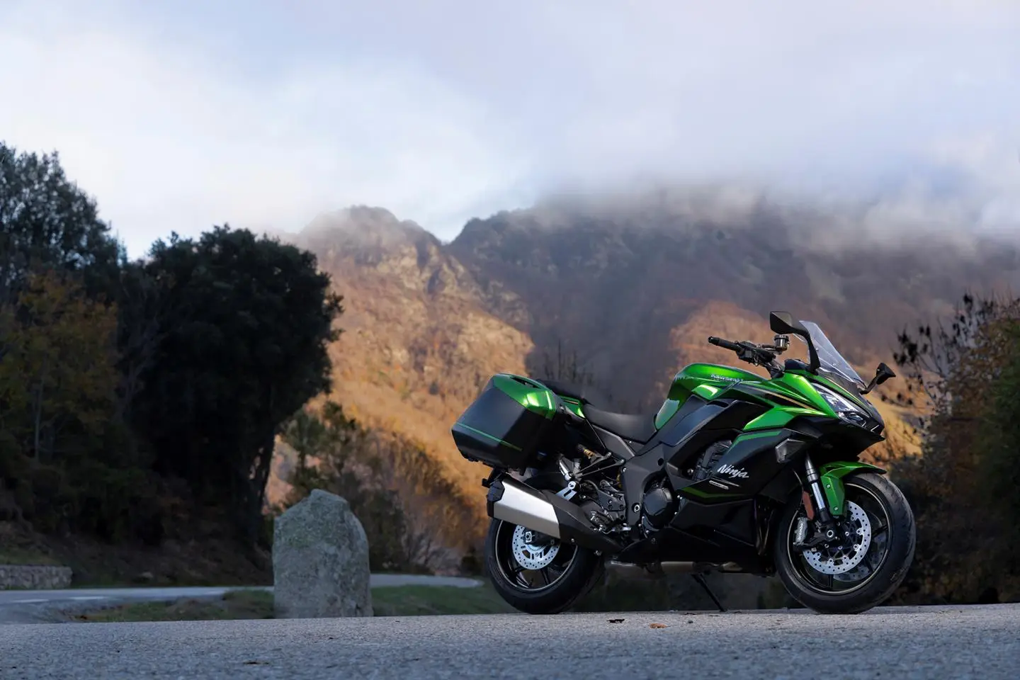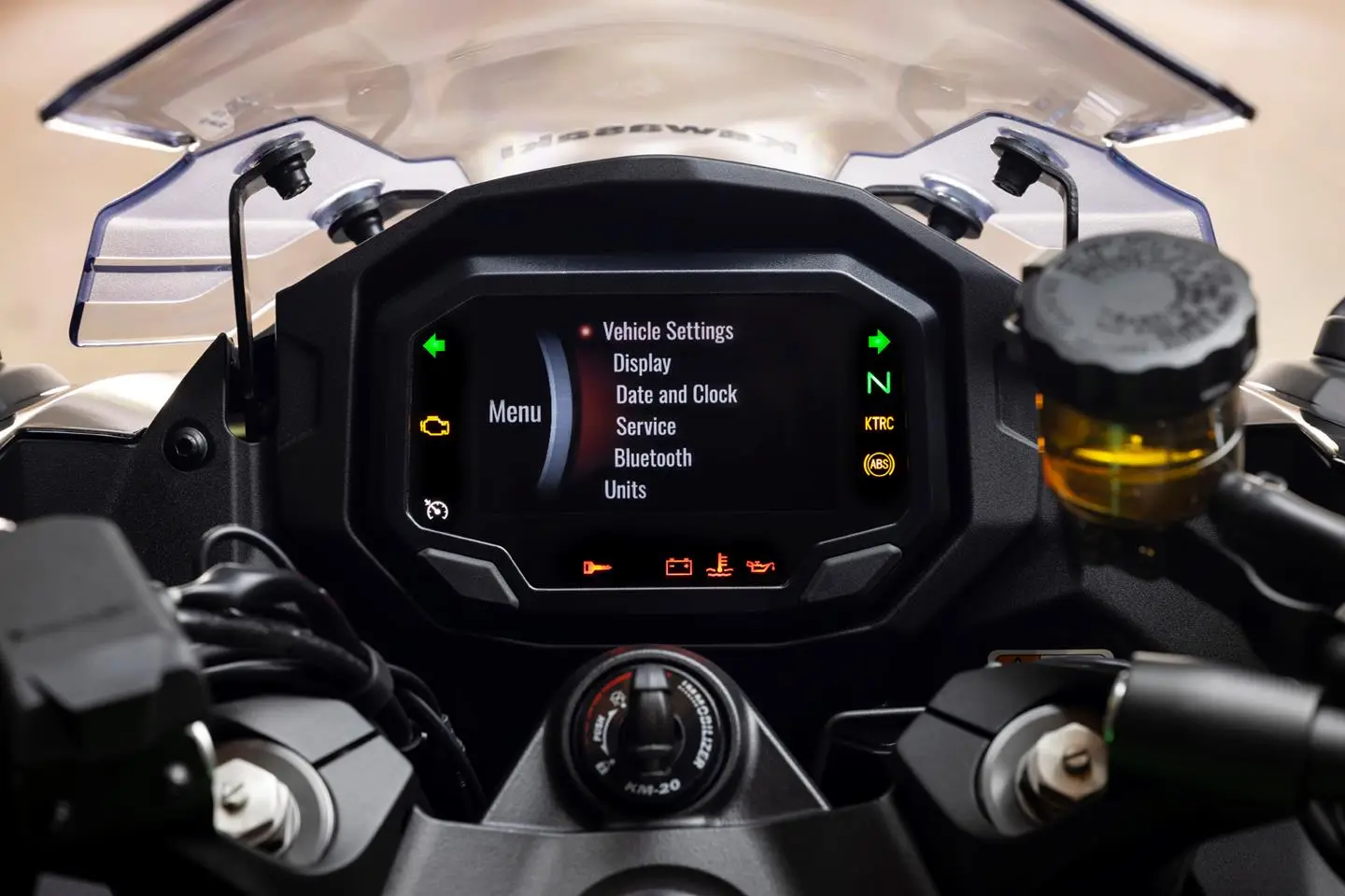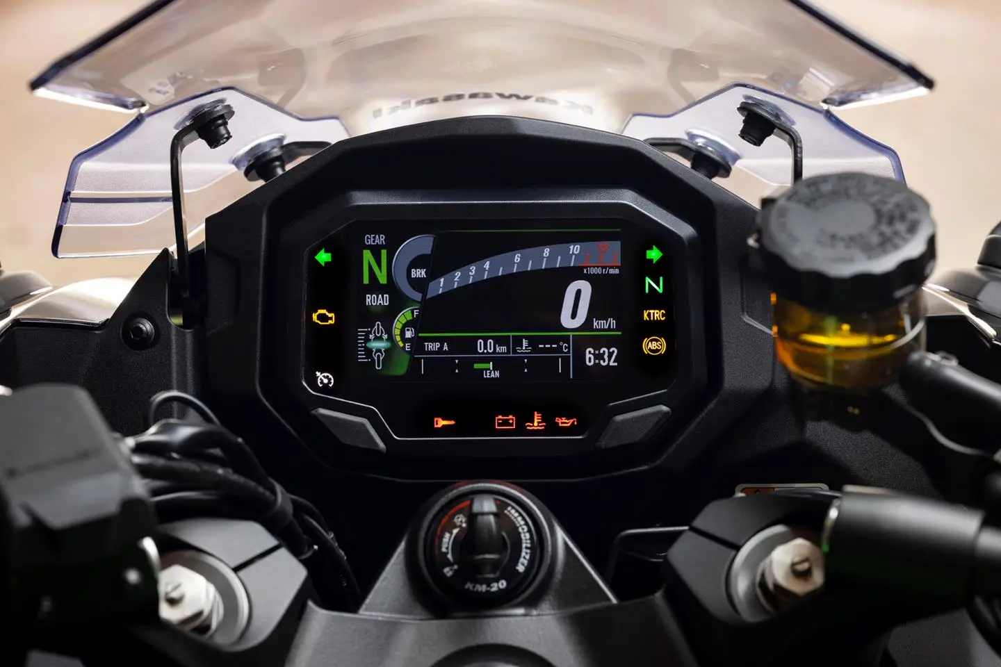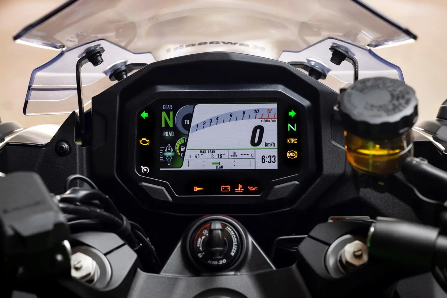 Una moderna sport touring non si basa solo sul motore. La Ninja 1100SX arriva carica di tecnologia per facilitare la vita del pilota e aumentare la sicurezza. Il pacchetto include controllo di trazione (KTRC) con molteplici livelli, modalità di guida (Sport, Strada, Pioggia e Pilota personalizzabile) che regolano l’erogazione della potenza e l’intervento del controllo di trazione, e l’indispensabile freno ABS.