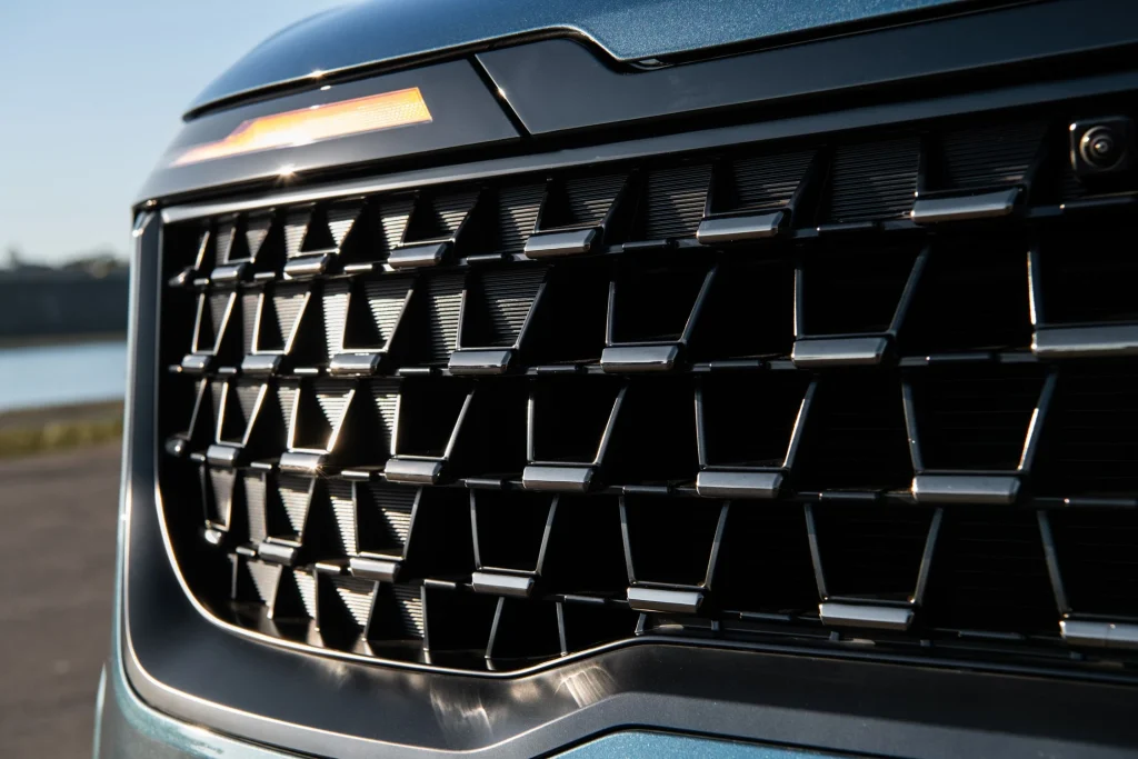 - Estilo externo com capô longo e ombros altos, mais próximo de SUV do que de minivan tradicional.